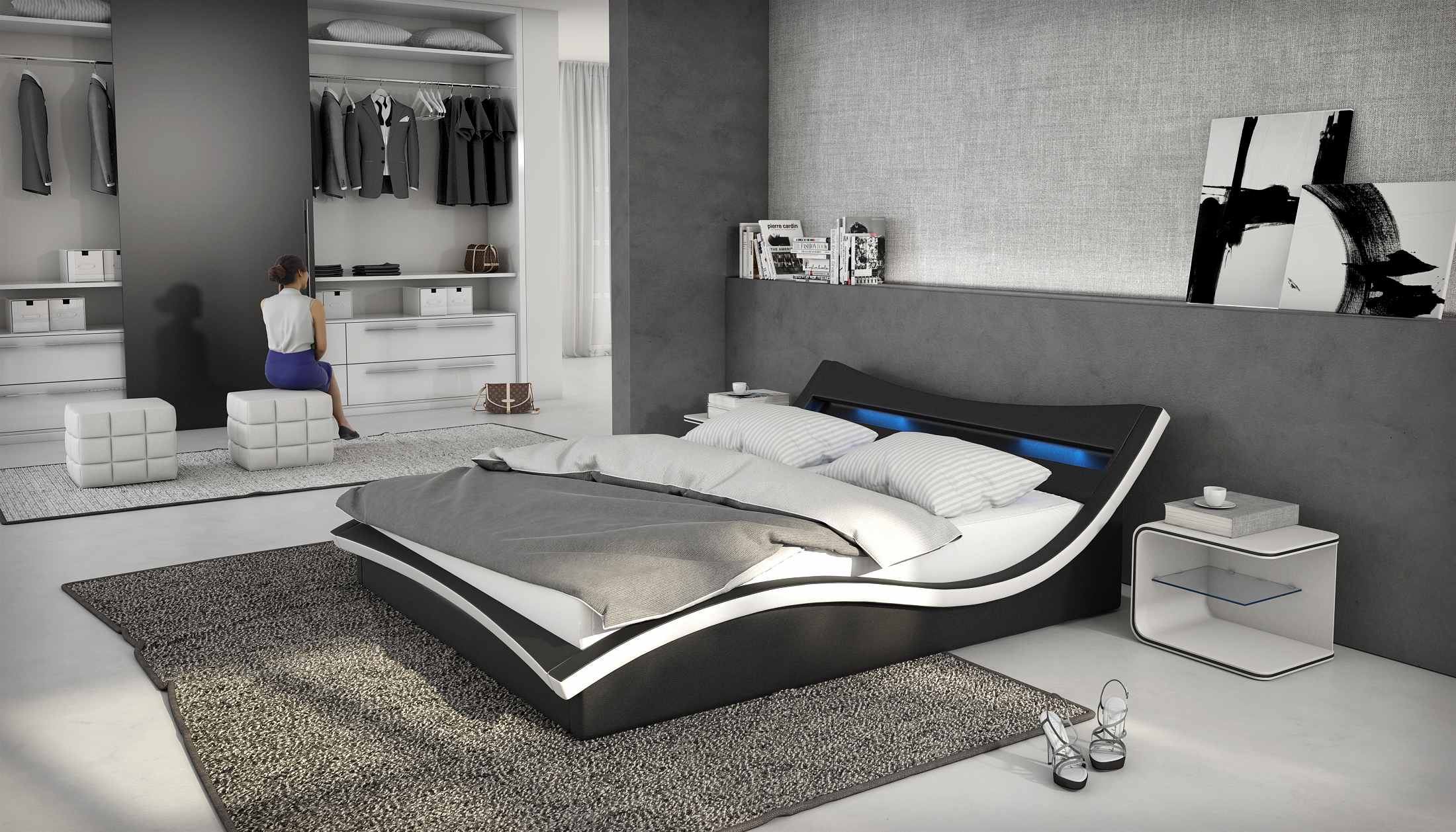 Ce lit rembourré moderne ton noir et blanc séduit par ses lignes ondulées. Le revêtement chic est en cuir synthétique facile d’entretien. Le lit est équipé d’une traverse centrale autoportante et d'un sommier à lattes enroulable. Profitez de la possibilité d’utiliser deux petits matelas ou un grand matelas avec des degrés de fermeté différents. C’est un véritable avantage pour les couples qui ont des habitudes de sommeil différentes. Les deux bandeaux lumineux intégrés dans la tête de lit permettent de longues soirées lecture. Avec ce petit bijou de design, vous pourrez créer un espace de repos personnalisé dans votre chambre à coucher.