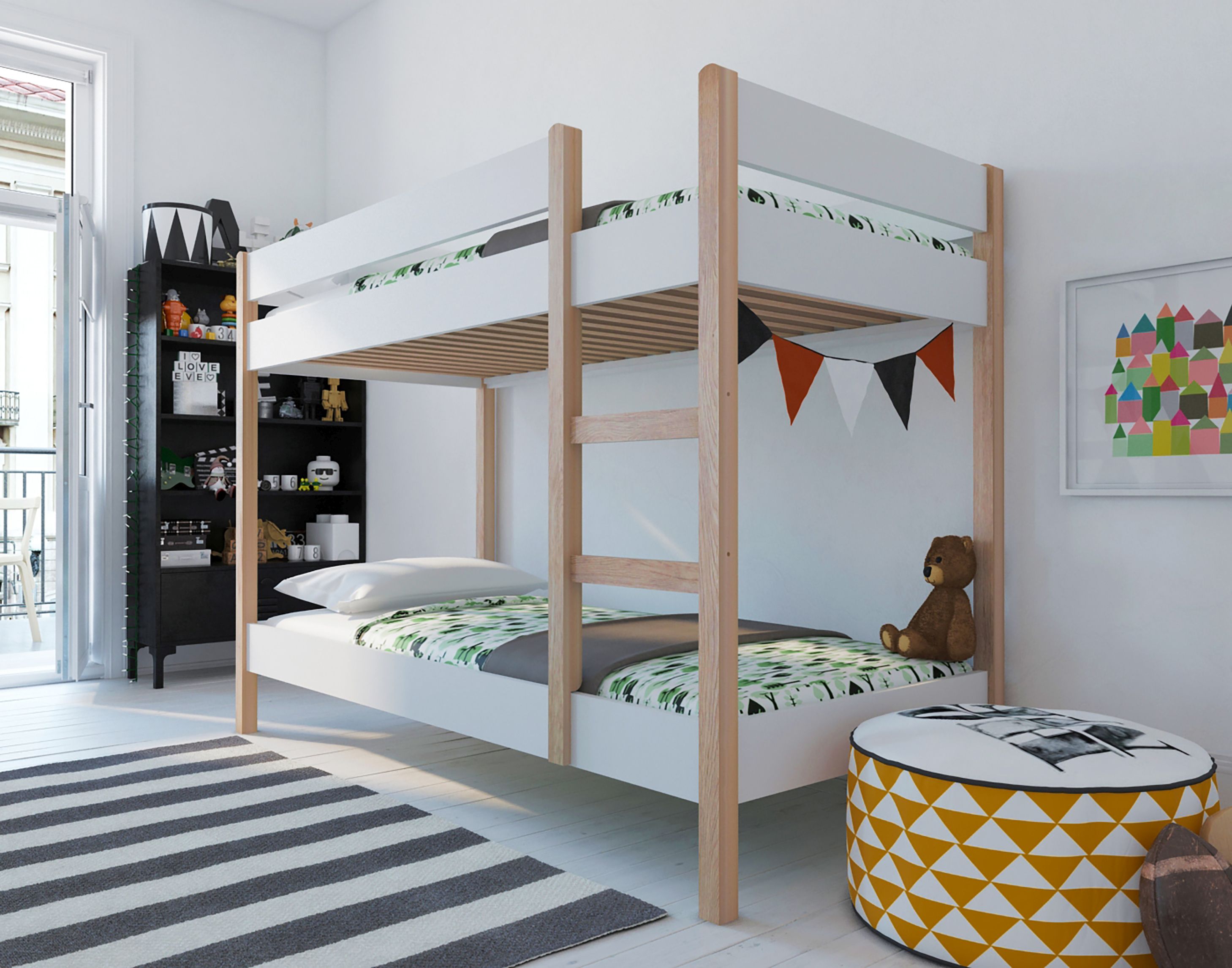 Ce lit superposé dans un design scandinave permet d'utiliser la place dans la chambre d'enfant de façon optimale grâce aux deux surfaces de couchage qui se trouvent l'une au-dessus de l'autre. La barrière anti-chute sur tout le pourtour offre une protection supplémentaire pour vos enfants. Les sommiers à lattes prévus pour des matelas de 90x200 cm sont compris dans la livraison. Le lit est fabriqué en bois de pin robuste et MDF laqué ton blanc avec une touche scandinave sobre et élégante : il offre une solution unisexe pour de nombreuses possibilités en matière d'aménagement de la chambre des enfants pour tous les âges.