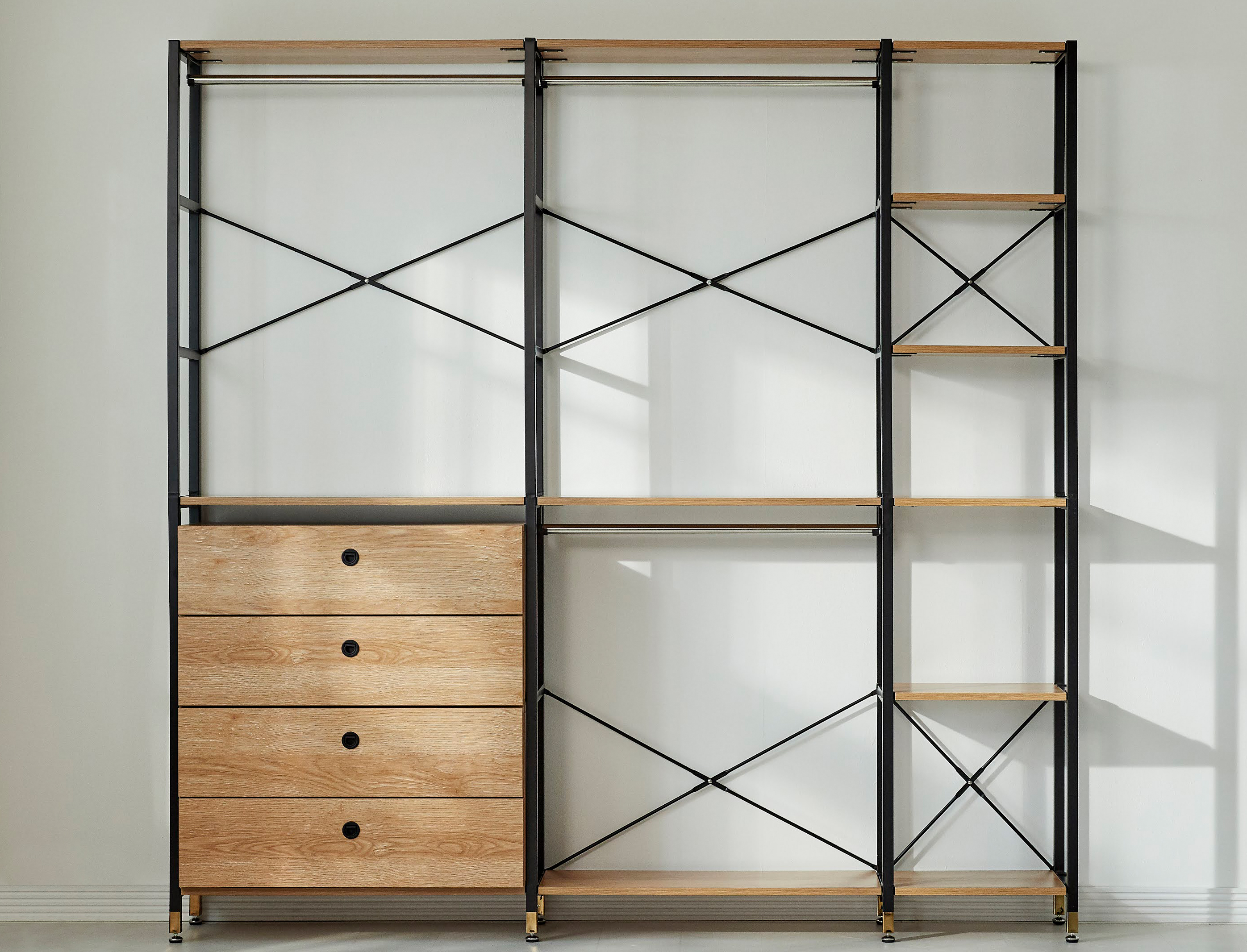 1 étagère large avec 2 tablettes, 1 barre de penderie et 4 tiroirs