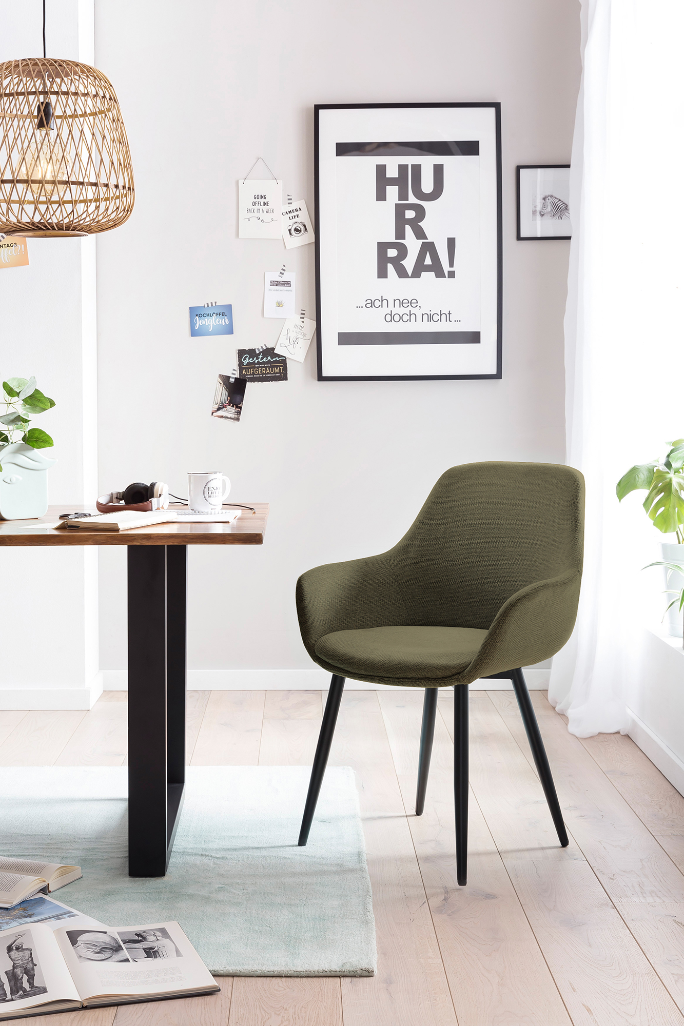 Plus besoin de choisir entre confort et élégance ! Ce lot de 2 chaises à accoudoirs tendance séduit par son design intemporel. L'assise, le dossier et les accoudoirs sont rembourrés et revêtus d'un tissu chiné ton vert. La chaise offre une excellente stabilité grâce aux pieds en métal finition époxy ton noir mat qui soulignent l'ensemble harmonieux et apporteront la touche finale dans vos pièces. Dans la salle à manger ou le salon, cette chaise est toujours la solution idéale ! Grâce à son look intemporel, cette chaise sera également du plus bel effet placée seule dans la chambre à coucher ou au salon.