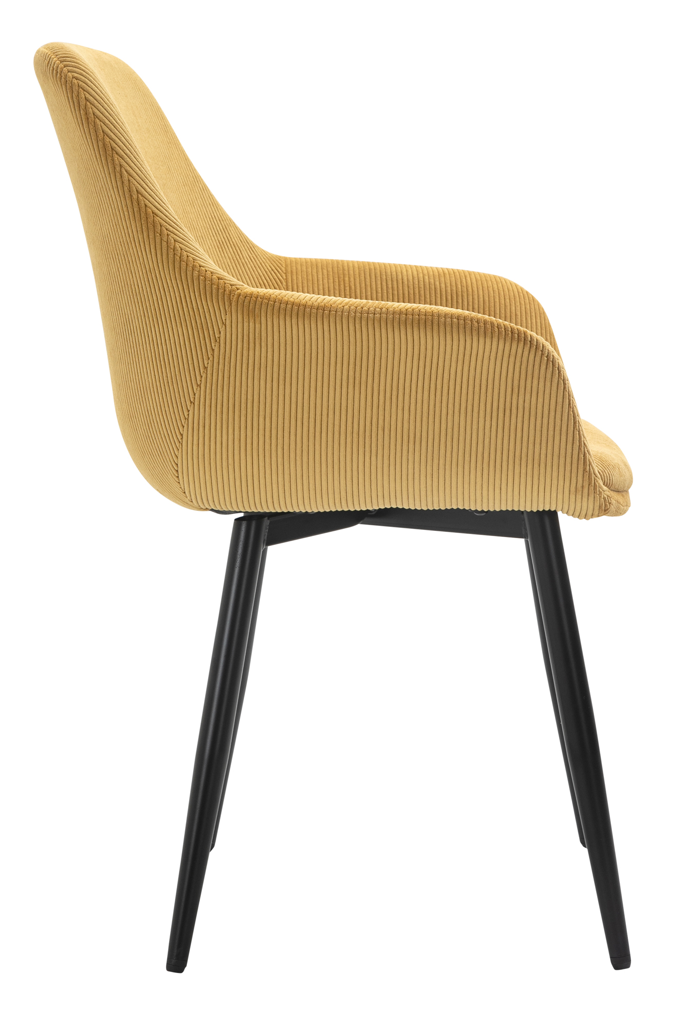 Ce lot de 2 chaises à accoudoirs tendance est proposé dans un tissu texturé aspect velours côtelé. Le piètement fin à 4 pieds en métal finition époxy ton noir mat garantit une excellente stabilité tout en offrant un superbe contraste avec le revêtement de la chaise. Grâce au dossier arrondi et au rembourrage confortable, vous bénéficierez d'un excellent confort d'assise. Les accoudoirs légèrement évasés sont un vrai point fort visuel. Grâce à leur design stylé, les chaises peuvent être placées dans un coin repas, une salle d'attente ou même une salle de réunion. Ce meuble attirera également tous les regards en guise de chaise solo. Vous et vos invités allez adorer votre nouveau siège.