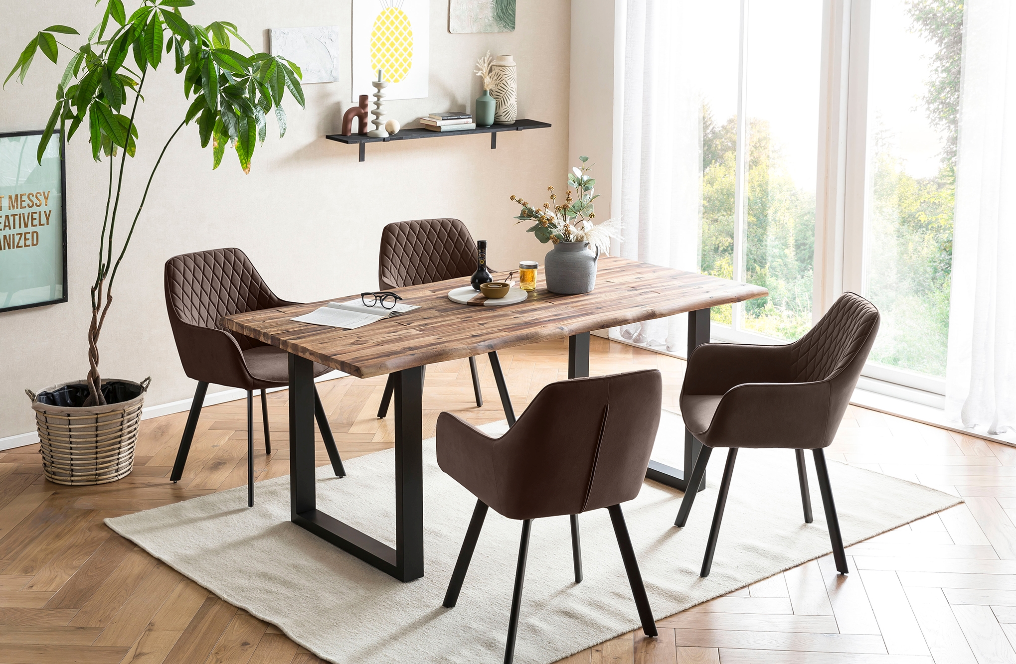 Joli lot de 2 chaises rembourrées stylées avec revêtement en tissu de qualité aspect velours mat. Les 4 pieds sont en métal finition époxy ton noir. La coque est pourvue de surpiqûres en forme de losanges sur la face intérieure. Grâce aux bords arrondis de forme ergonomique, aux accoudoirs et à la hauteur agréable du dossier, vous bénéficierez d'un confort d'assise exceptionnel.