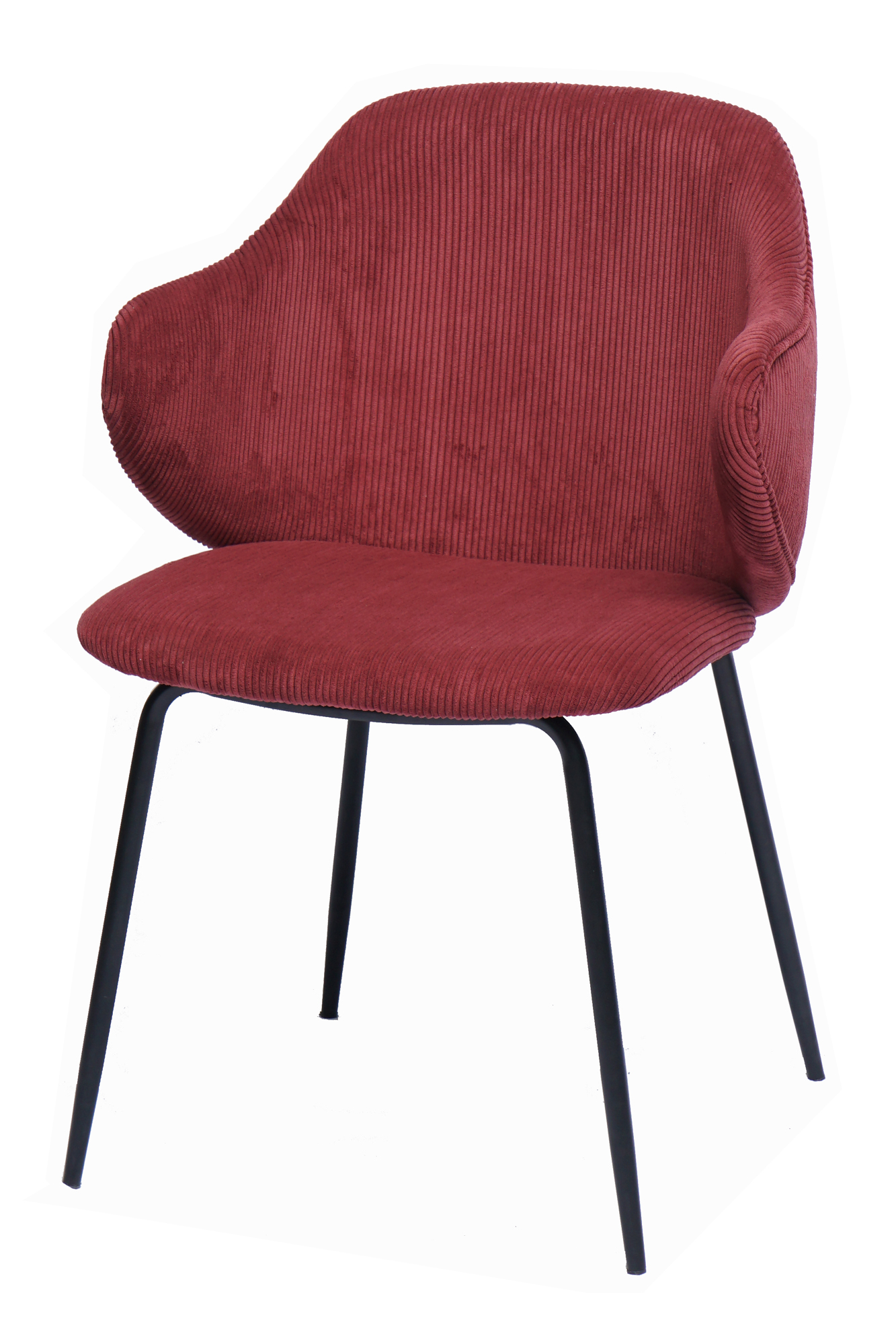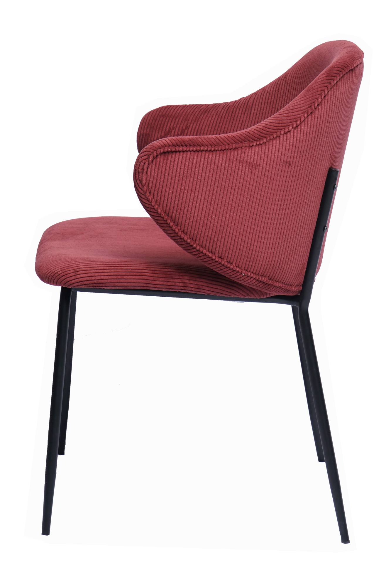 Ce lot de 2 chaises à accoudoirs tendance est proposé dans un tissu texturé ton fruits rouges. Le piètement fin à 4 pieds en métal finition époxy ton noir mat garantit une excellente stabilité tout en offrant un superbe contraste avec le revêtement de la chaise. Grâce au dossier arrondi et au rembourrage confortable, vous bénéficierez d'un excellent confort d'assise. Les accoudoirs légèrement évasés sont un vrai point fort visuel. Grâce à leur design stylé, les chaises peuvent être placées dans un coin repas, une salle d'attente ou même une salle de réunion. Ce meuble attirera également tous les regards en guise de chaise solo. Vous et vos invités allez adorer votre nouveau siège.