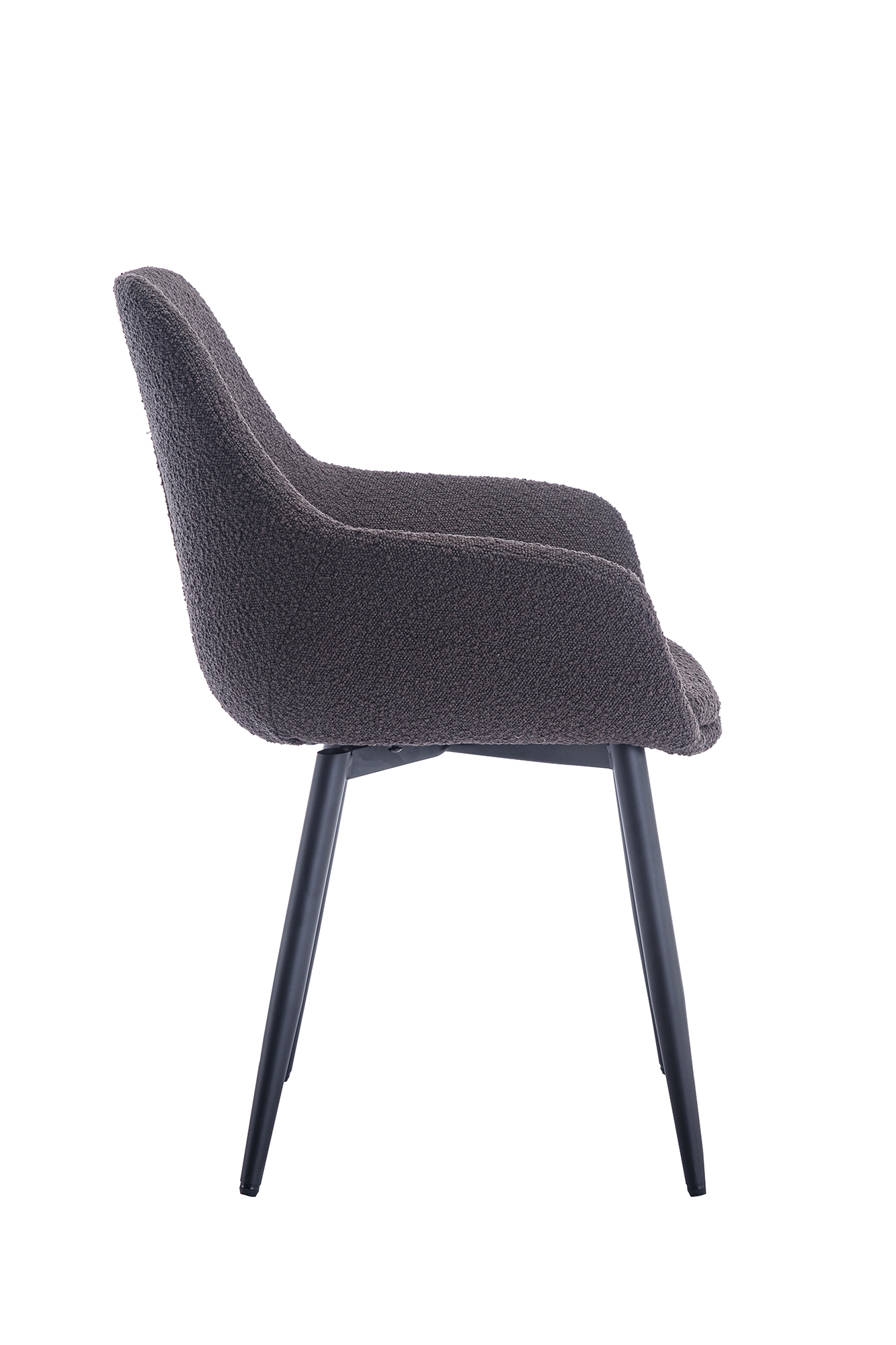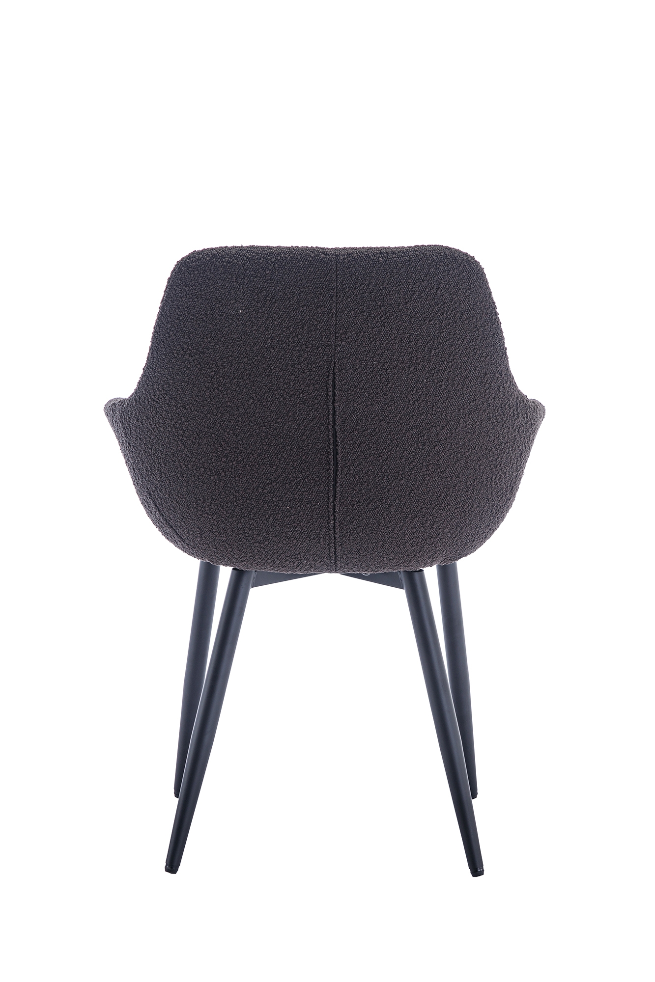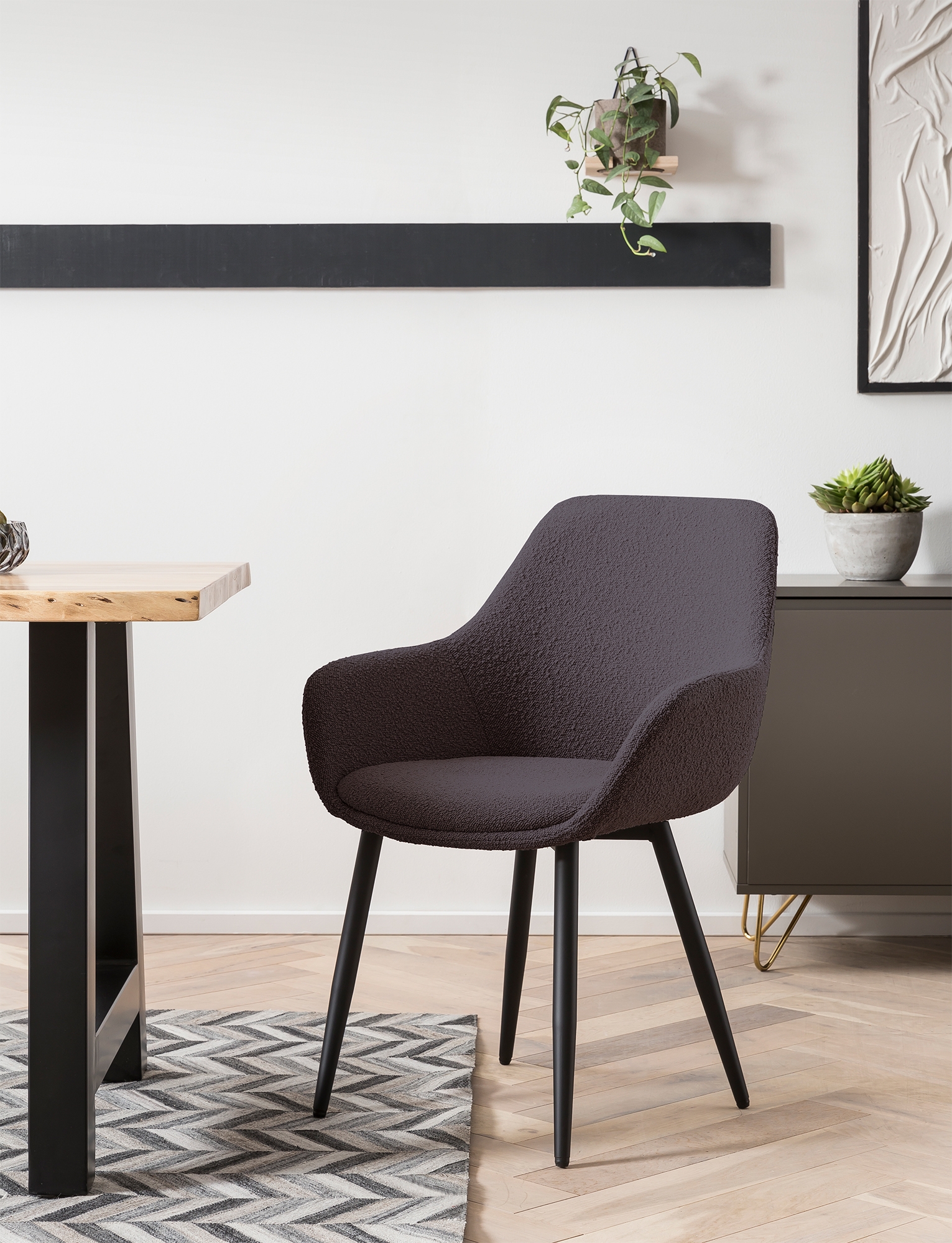Ce lot de 2 chaises à accoudoirs tendance séduit par son tissu texturé aspect bouclette. Le piètement robuste à 4 pieds en métal finition époxy ton noir mat garantit une excellente stabilité tout en offrant un superbe contraste avec le revêtement de la chaise. Grâce au dossier arrondi et au rembourrage confortable, vous bénéficierez d'un excellent confort d'assise. Les accoudoirs légèrement évasés sont un vrai point fort visuel. Grâce à leur design stylé, les chaises peuvent être placées dans un coin repas, une salle d'attente ou même une salle de réunion. Cette chaise attirera également tous les regards en guise de siège solo. Vos invités et vous-même allez adorer votre nouvelle chaise.