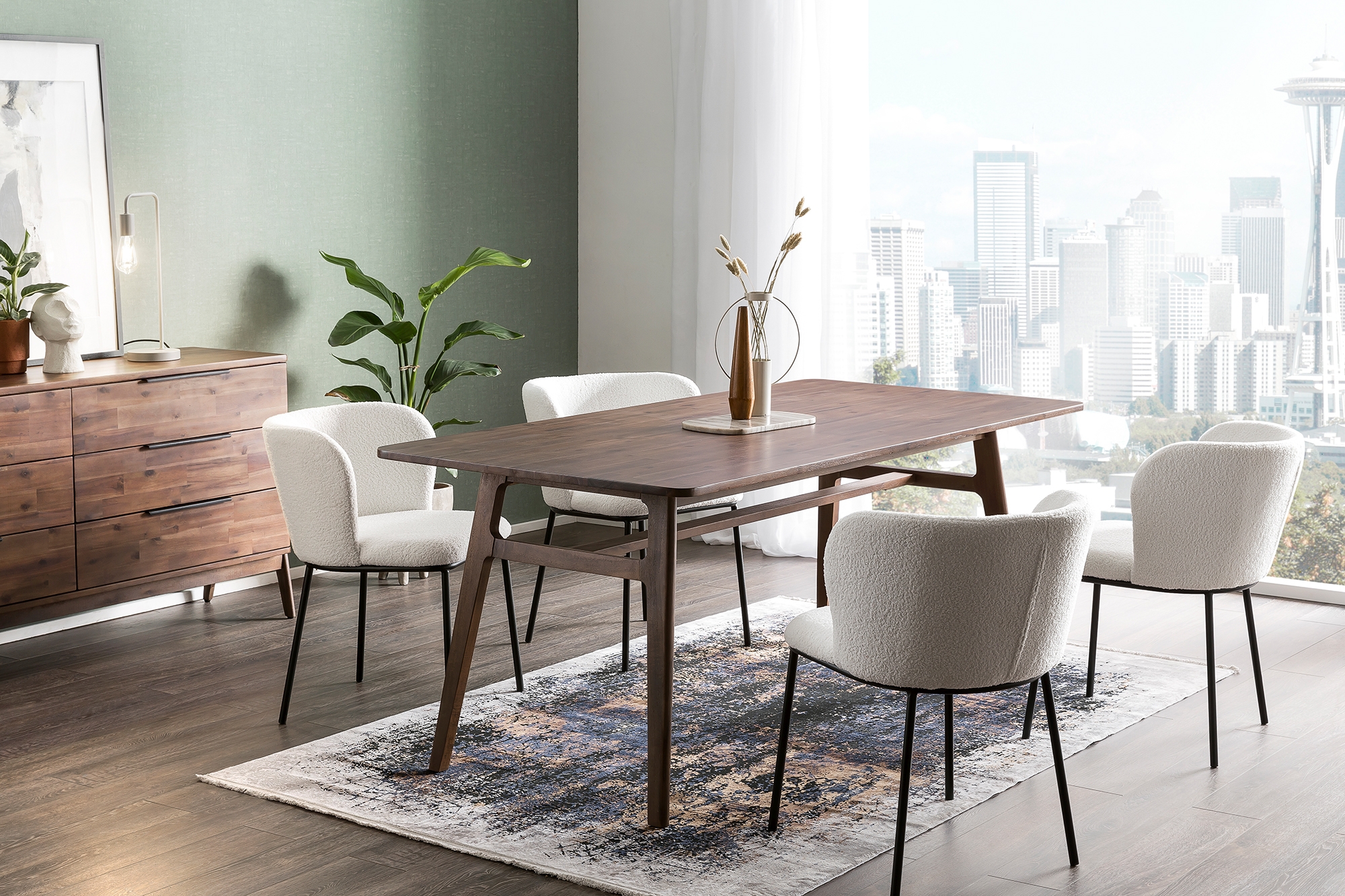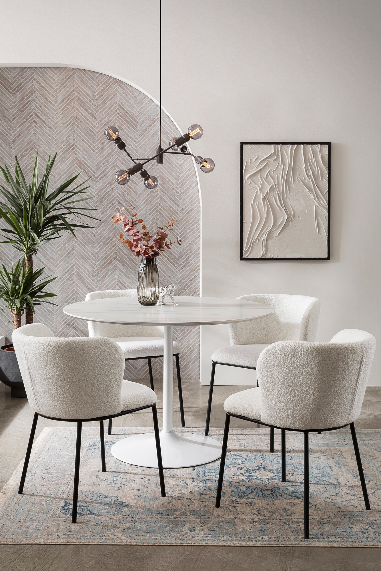 Un modèle dans le plus pur style scandinave : tissu laineux aspect bouclette, formes organiques et lignes épurées confèrent à ce lot de chaises un look cosy ou plutôt… hygge ! Le dossier arrondi est enveloppant et garantit une position assise confortable. De plus, le piètement robuste avec ses 4 pieds offre une excellente stabilité. Ce lot de chaises, au look noir et blanc sobre et élégant, est le partenaire indémodable d’un intérieur dans un style scandinave recherché : il s’intègre aussi facilement dans tout type d’intérieur ou presque. Le tissu bouclette, qui a fait depuis longtemps son apparition dans nos salons et salles à manger, exhale chaleur et convivialité pour une ambiance cosy. De plus, le tissu aspect laineux incarne parfaitement l’essence du style scandinave à la popularité inégalée. La chaise est livrée par lot pratique de 2 ; elle est montée en un tour de main.
