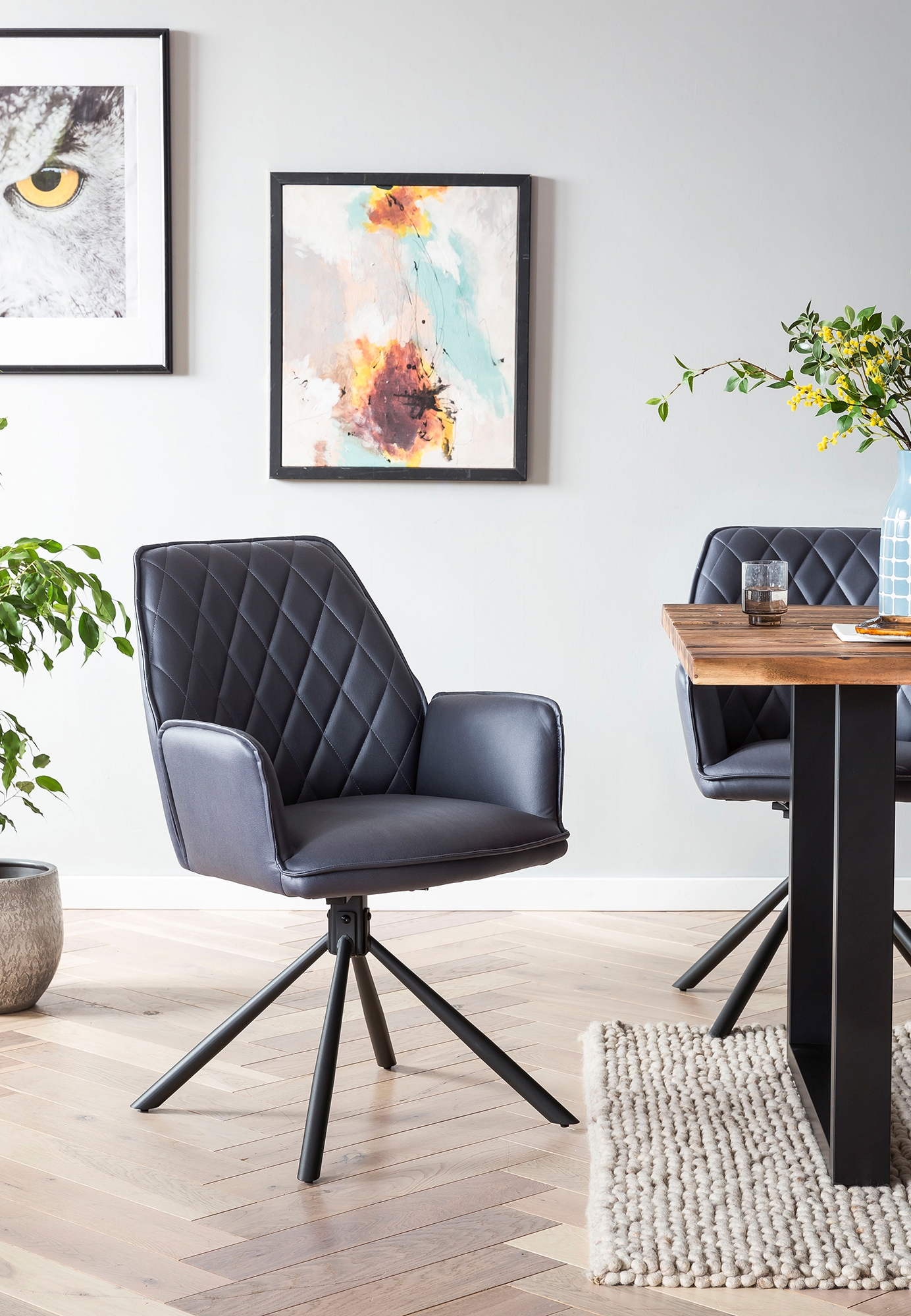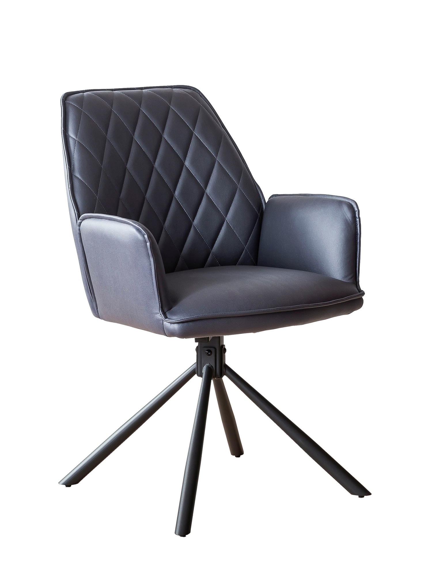Cette chaise à accoudoirs séduit par sa fonction pivotante à 360°. Le revêtement en microfibre aspect cuir synthétique est élégant et s’adapte parfaitement au piètement noir. Le piètement en métal à 4 pieds offre une excellent stabilité. Le chaise rembourrée offre un excellent confort d’assise grâce à son design en forme de fauteuil. Le vrai point fort de ce modèle est la fonction pivotante à 360° ultra pratique. Les surpiqûres en forme de losanges au niveau du dossier sont un régal pour les yeux et attireront tous les regards dans la salle à manger. Grâce à sa forme originale, cette chaise rembourrée peut aussi être utilisée comme chaise de réunion. Peu importe où il sera placé, vous allez adorer ce siège confortable… et vos invités aussi !