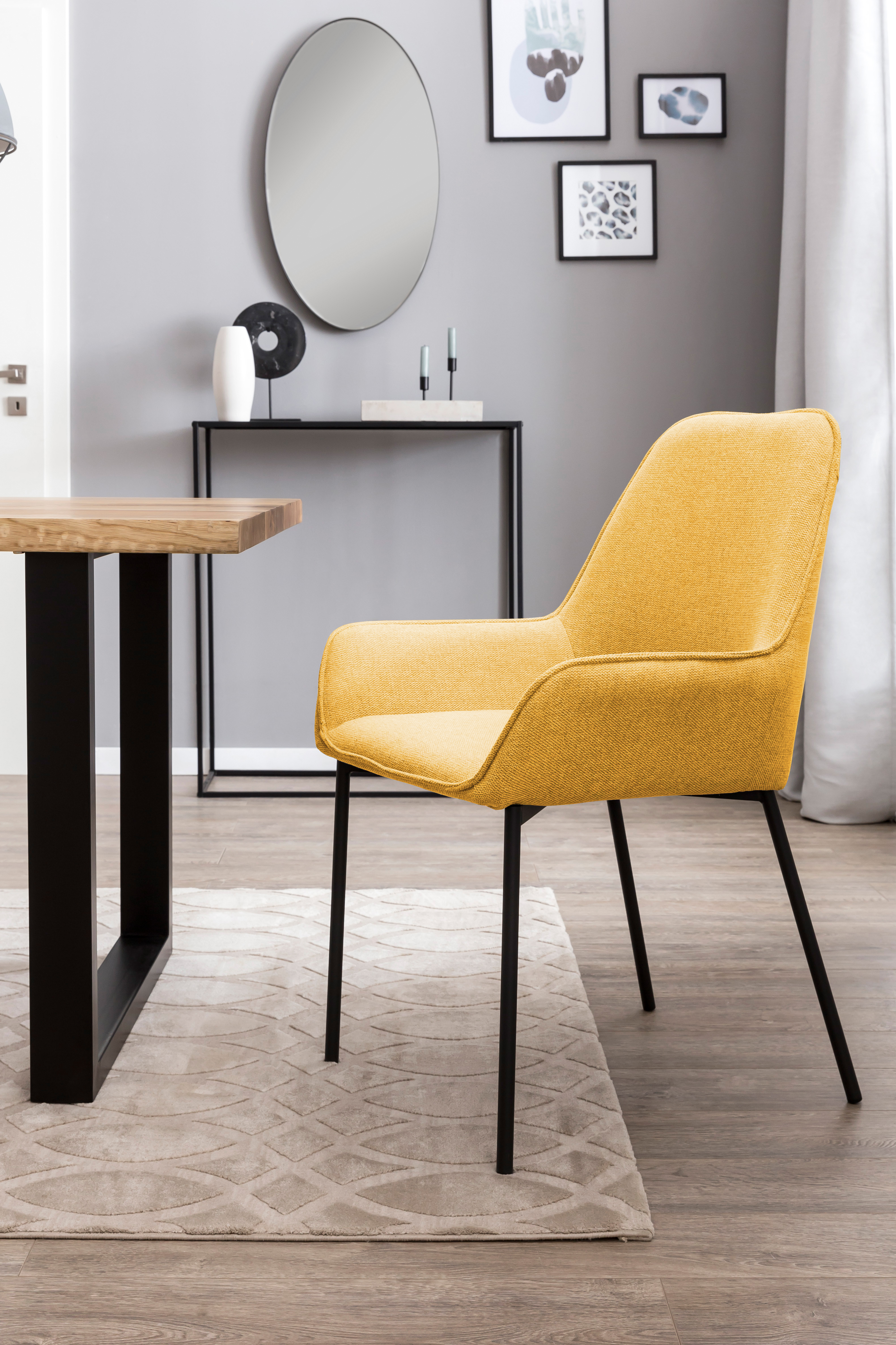 Le lot de 2 chaises rembourrées modernes séduit par le revêtement en tissu chiné et par le garnissage au niveau de l'assise et du dossier. Les 4 pieds légèrement en biais en métal noir mat garantissent une excellente stabilité tout en offrant un superbe contraste avec le revêtement de la chaise. Grâce au rembourrage confortable, au dossier et aux accoudoirs, vous bénéficierez d'un excellent confort d'assise. Le revêtement en tissu de la chaise à accoudoirs est facile d'entretien et robuste. Les petites saletés peuvent être facilement nettoyées avec un peu d'eau et un savon neutre. Les pieds de chaise peuvent être nettoyés avec un chiffon en coton sec ou même légèrement humide.