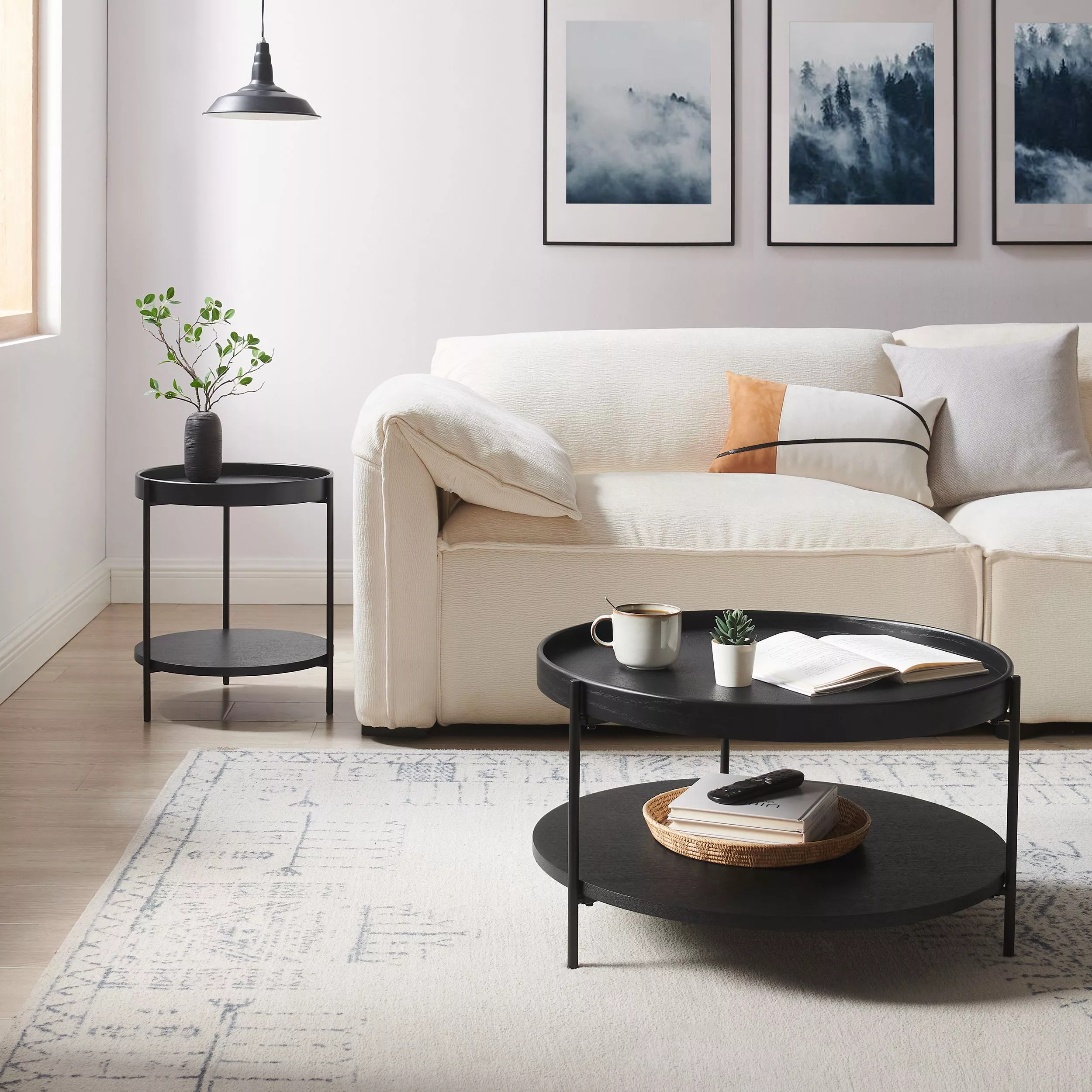 2 tables basses de tailles différentes avec 1 tablette chacune sous le plateau de table