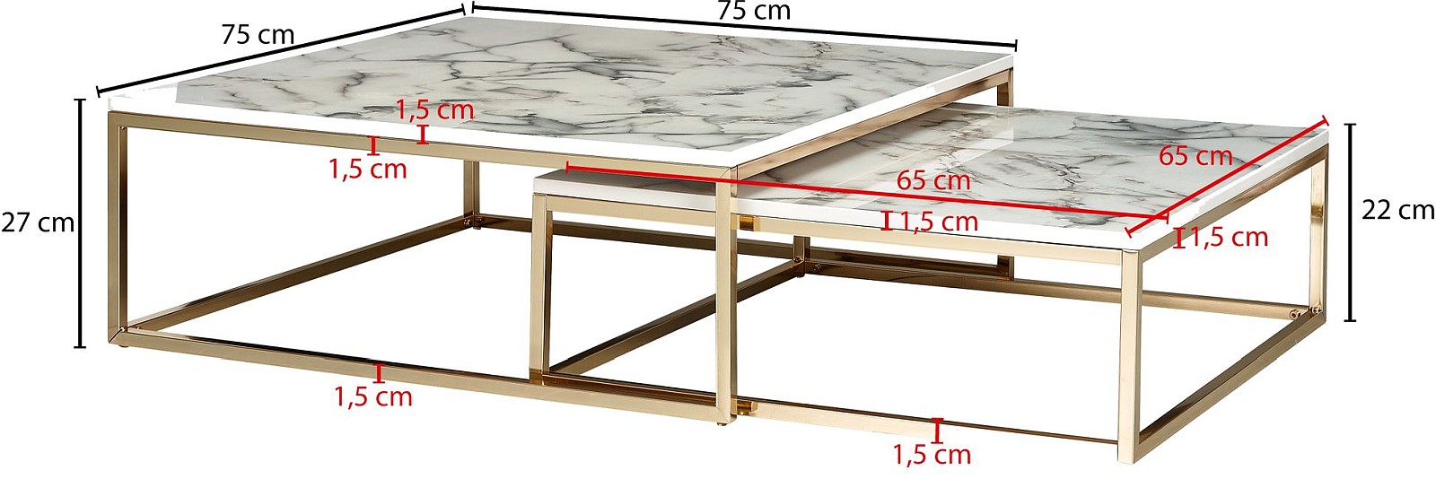 DIMENSIONS ✔ Grande table : 75x27x75 cm // Petite table : 65x22x65 cm // Vous trouverez d'autres dimensions sur l'image correspondante.