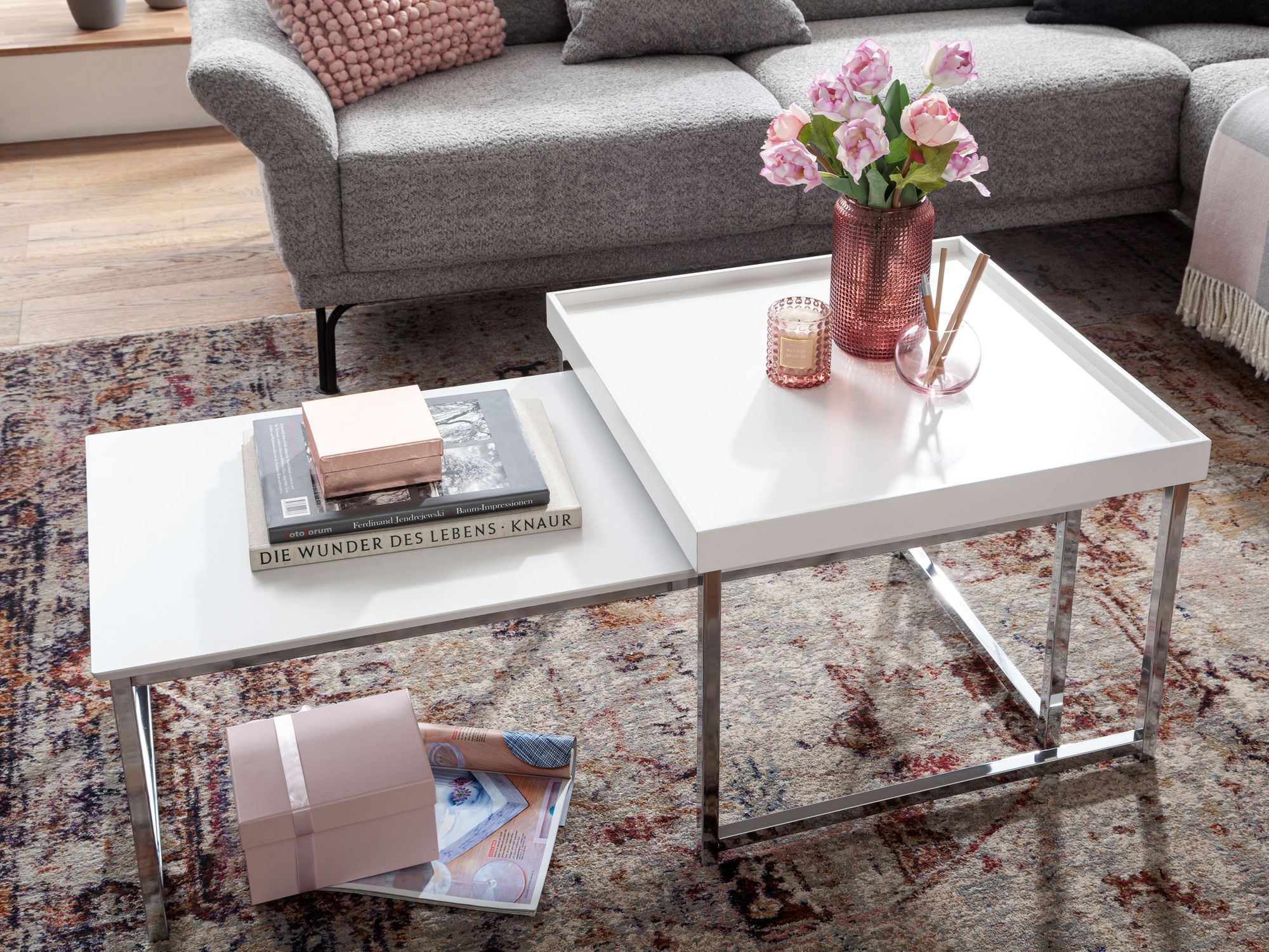 COMPOSITION ✔ Plateaux : MDF laqué ton blanc // Piètement : acier chromé.