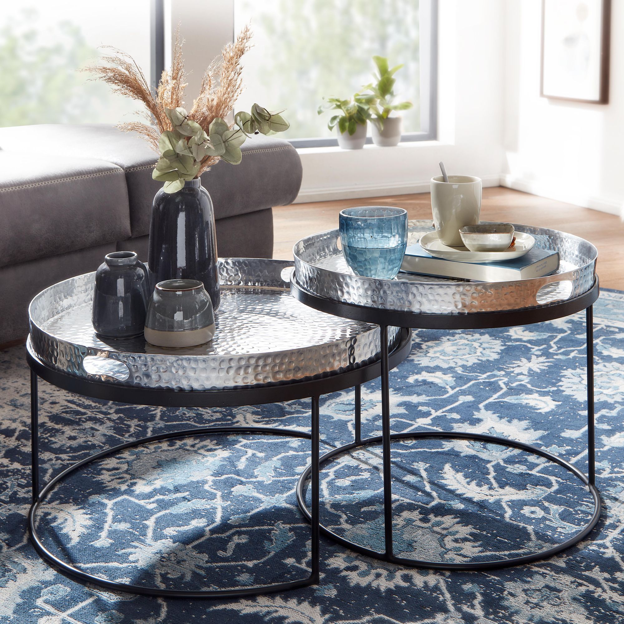 TABLES BASSES PRATIQUES ✔ Cet ensemble de tables de salon marque des points grâce à la surface martelée, mais aussi grâce à son côté pratique ! Préparez les snacks, sauces et boissons dans la cuisine et apportez-les dans le salon à l'aide des deux plateaux. La soirée cinéma idéale peut commencer !