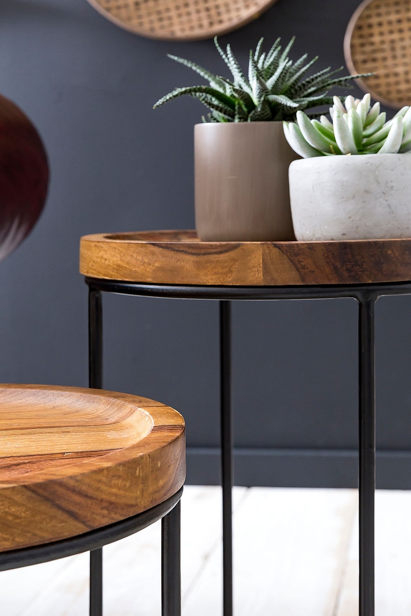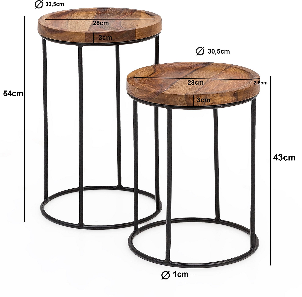 - COOL, MODERNE, MASSIF ✔ Lot de tables de designer lounge en bois de rose d'Inde dans un style industriel original pour les amoureux de décoration intérieure personnalisée. Une attention particulière est portée au design naturel et au veinage original du bois véritable de cette pièce unique. Les petites tables en bois massif sont portées par des piètements métalliques stables. Dans le salon à côté du canapé ou dans l'entrée en guise de tables décoratives : ce lot de bouts de canapé s'adapte simplement à votre style.