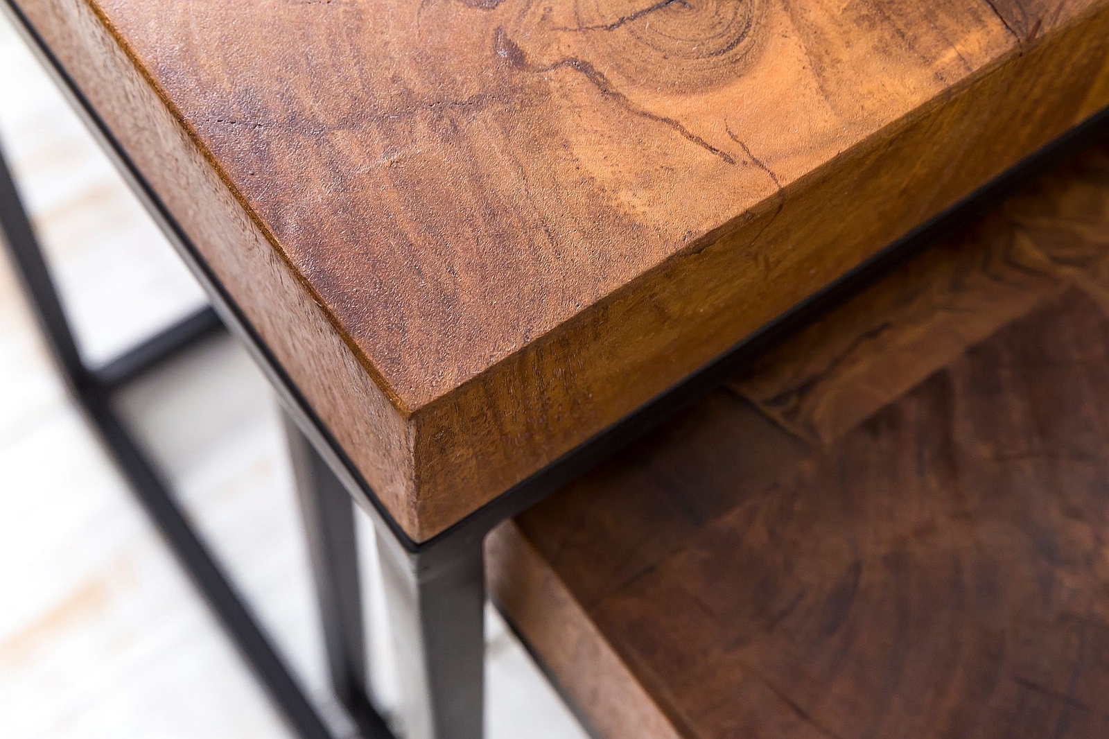 - COOL, TENDANCE, MASSIF ✔ Lot de bouts de canapé design en bois de rose indien dans un style industriel original pour les amoureux d'une décoration intérieure personnalisée : le design naturel des tables d’appoint en bois véritable et le veinage unique d’une pièce inédite attirent particulièrement l’attention. Les plateaux massifs sont soutenus par des structures métalliques stables. Qu’il soit placé à côté du canapé dans le salon ou utilisé comme table décorative dans le couloir, cet ensemble s’adaptera tout simplement toujours à votre style.