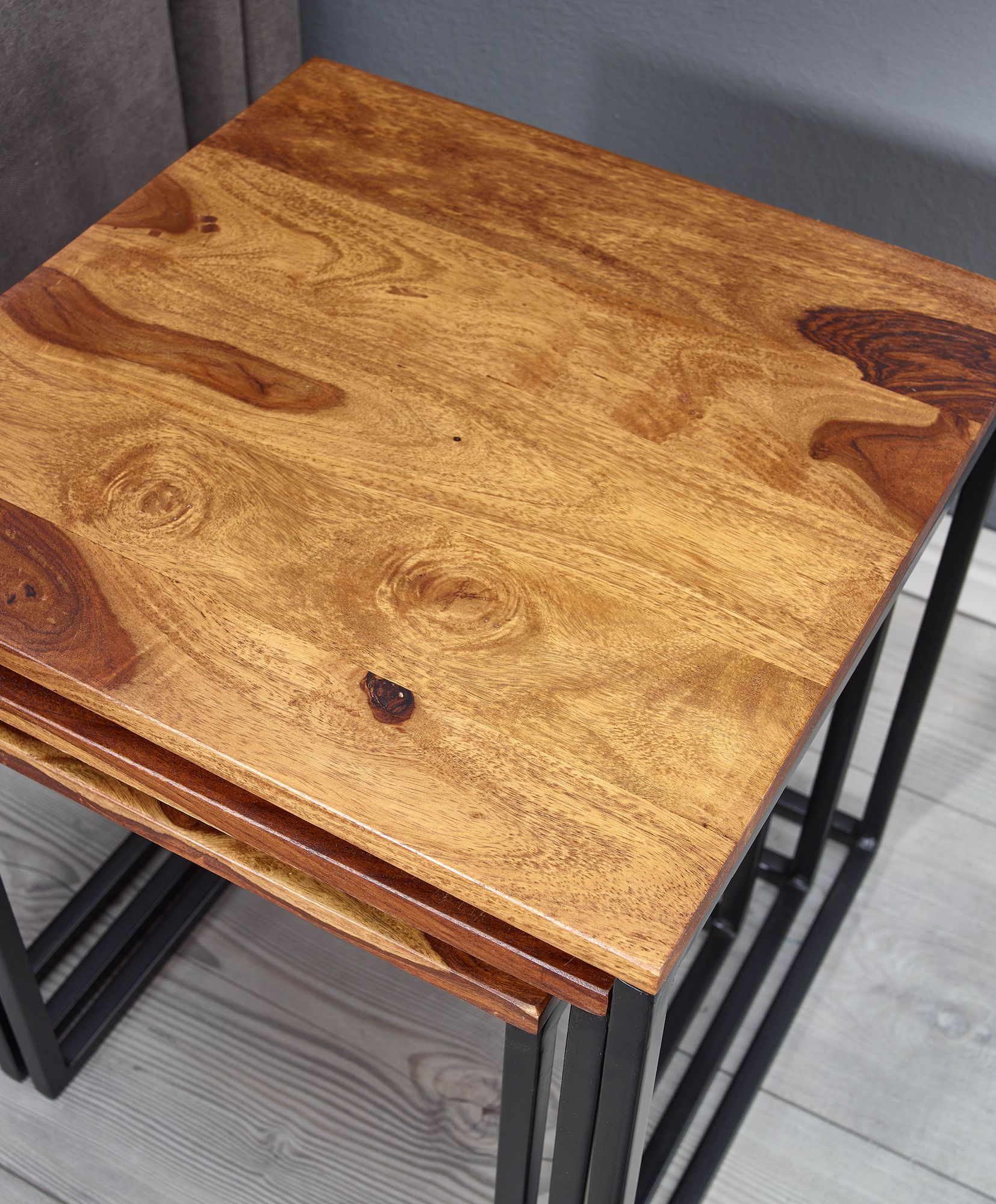 COMPOSITION ✔ Les plateaux sont en bois de sheesham massif recouvert d'une couche supplémentaire de vernis protecteur transparent. Les piètements sont en acier inoxydable finition époxy.