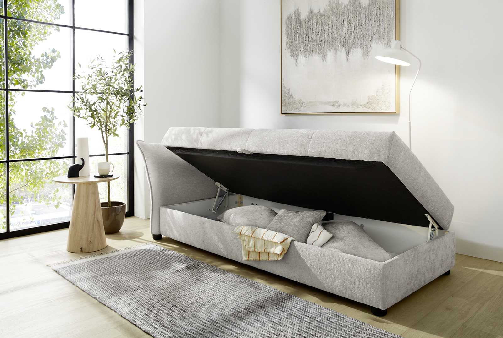 Le coffre de lit intégré offre un bel espace de rangement et s’ouvre facilement grâce au mécanisme à ressorts