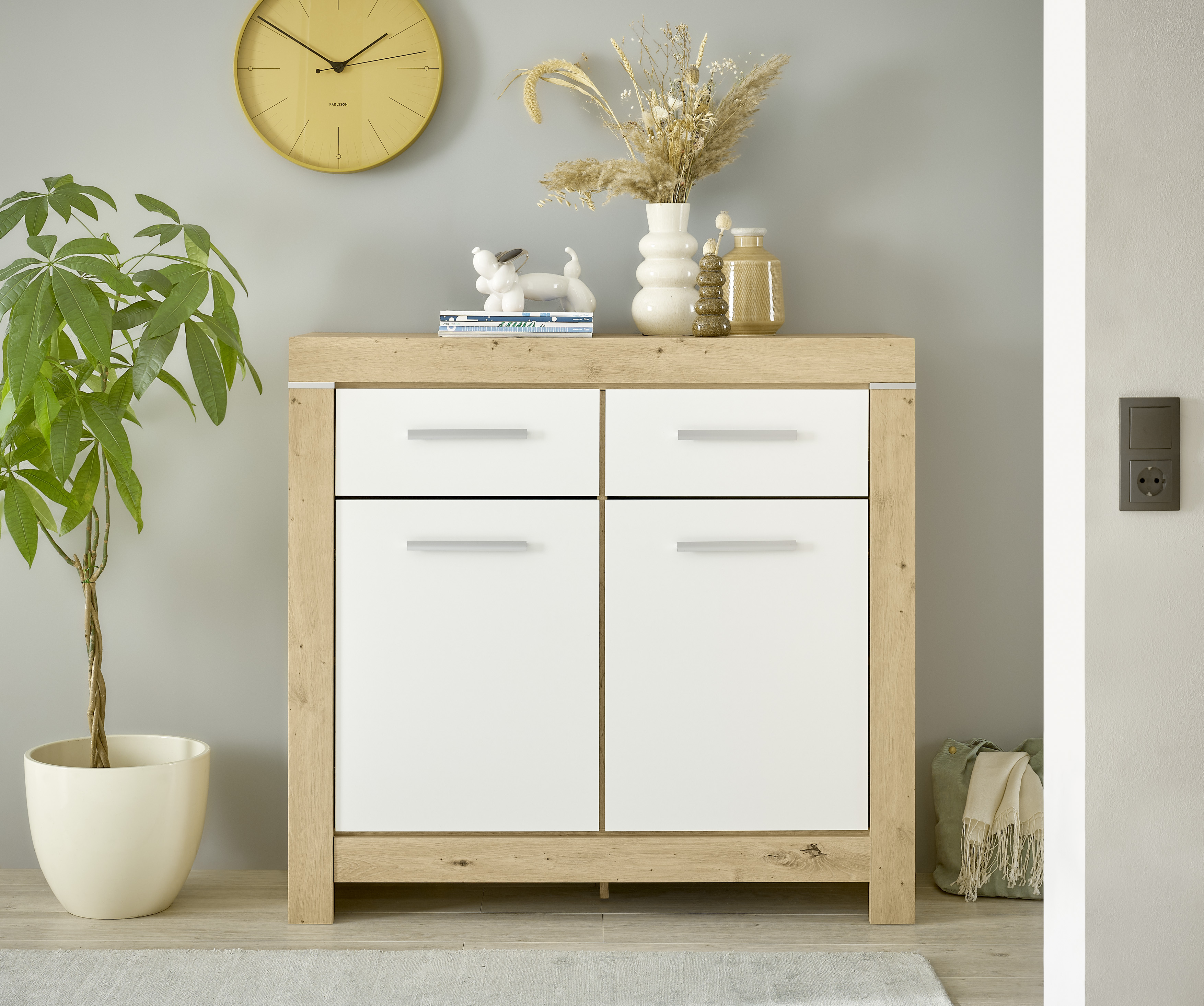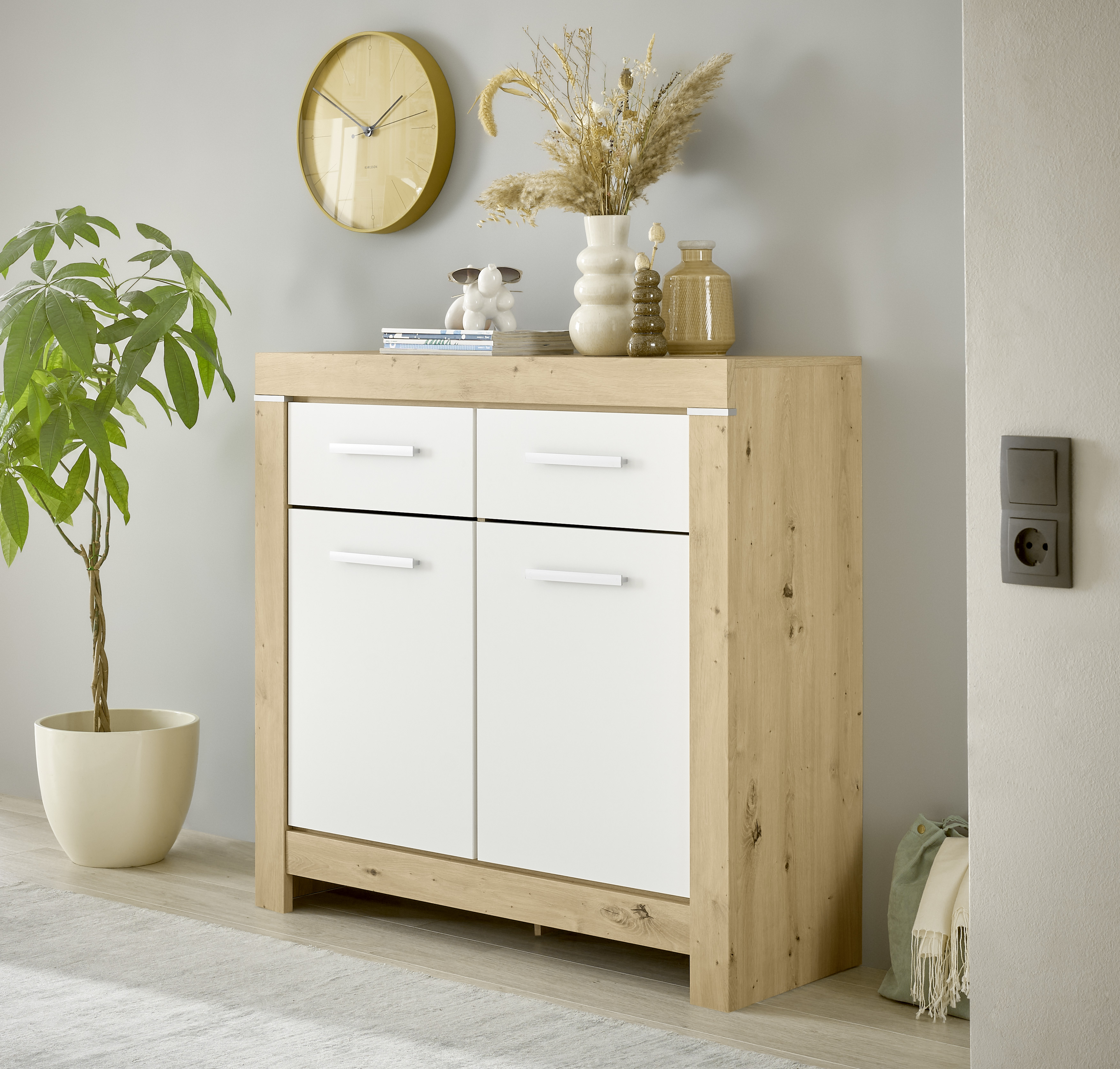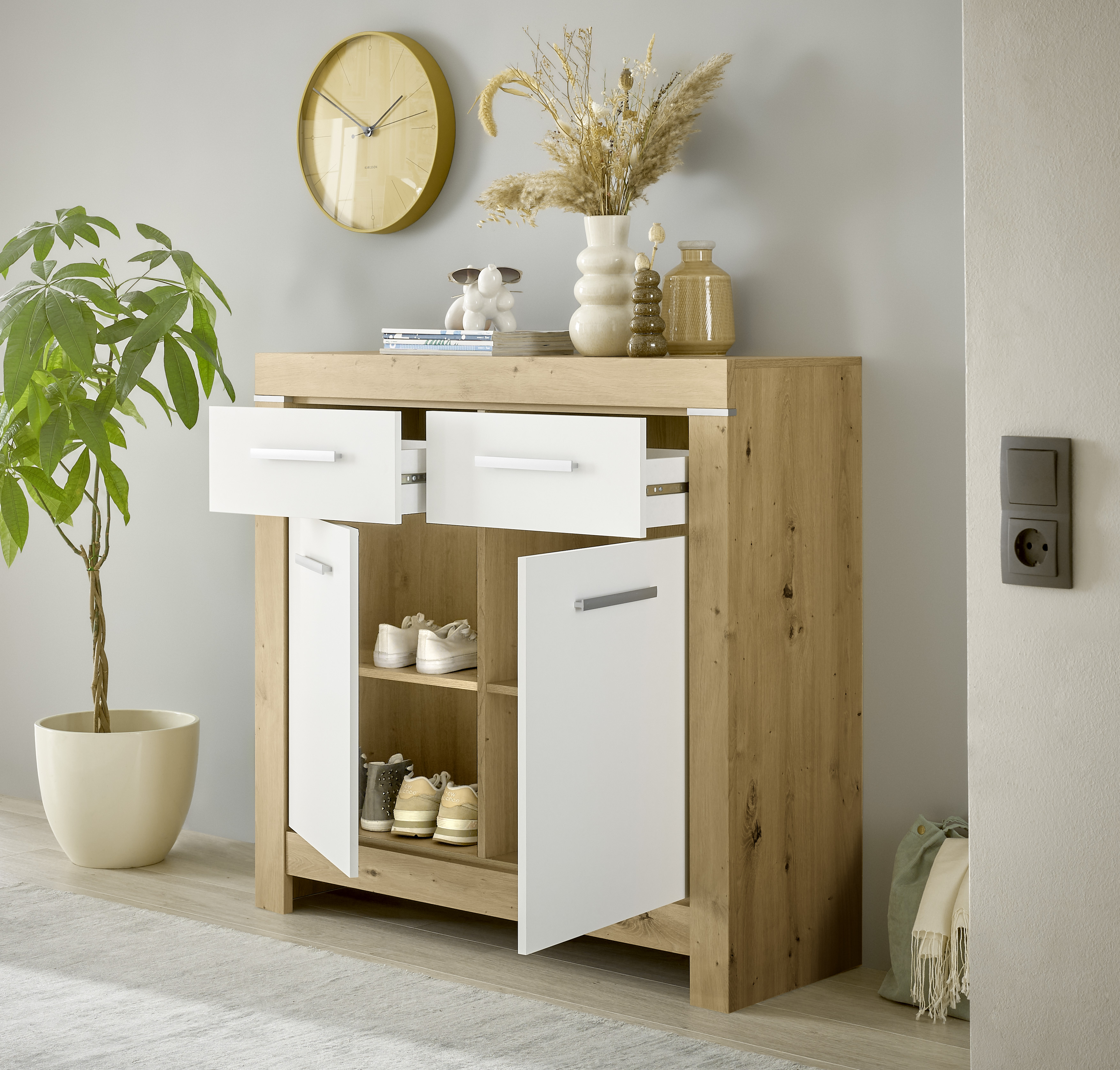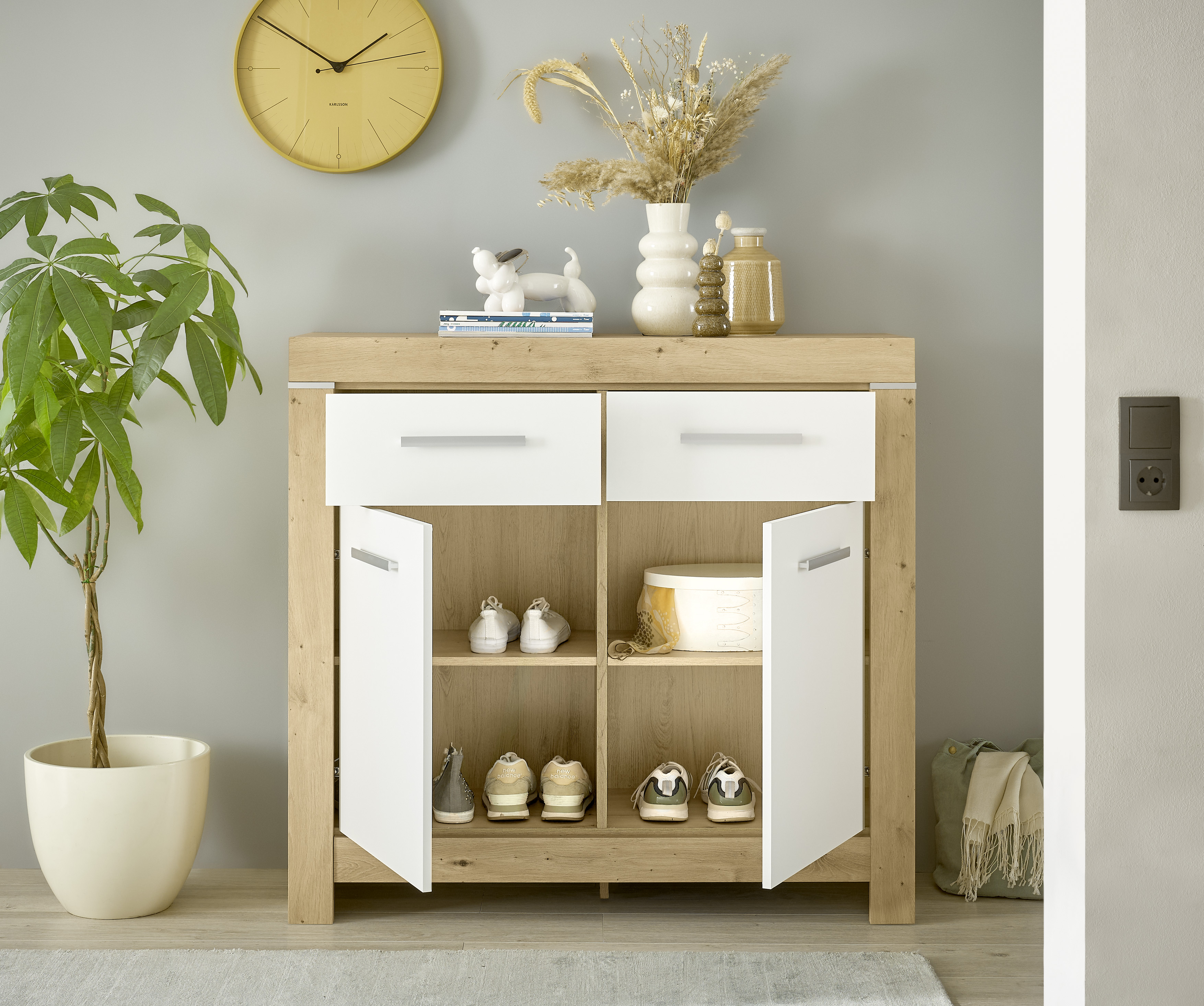 Optez pour un rangement élégant avec notre meuble à chaussures en imitation chêne Artisan avec façade blanche et poignées tiges argentées. La combinaison harmonieuse d'un aspect bois chaleureux et d'un blanc élégant crée une atmosphère intemporelle et moderne dans chaque entrée. Design élégant et robuste avec un aspect haut de gamme grâce à l'imitation chêne et à la façade blanche La répartition bien pensée permet un rangement ordonné et clair des chaussures, même dans un espace limité.
