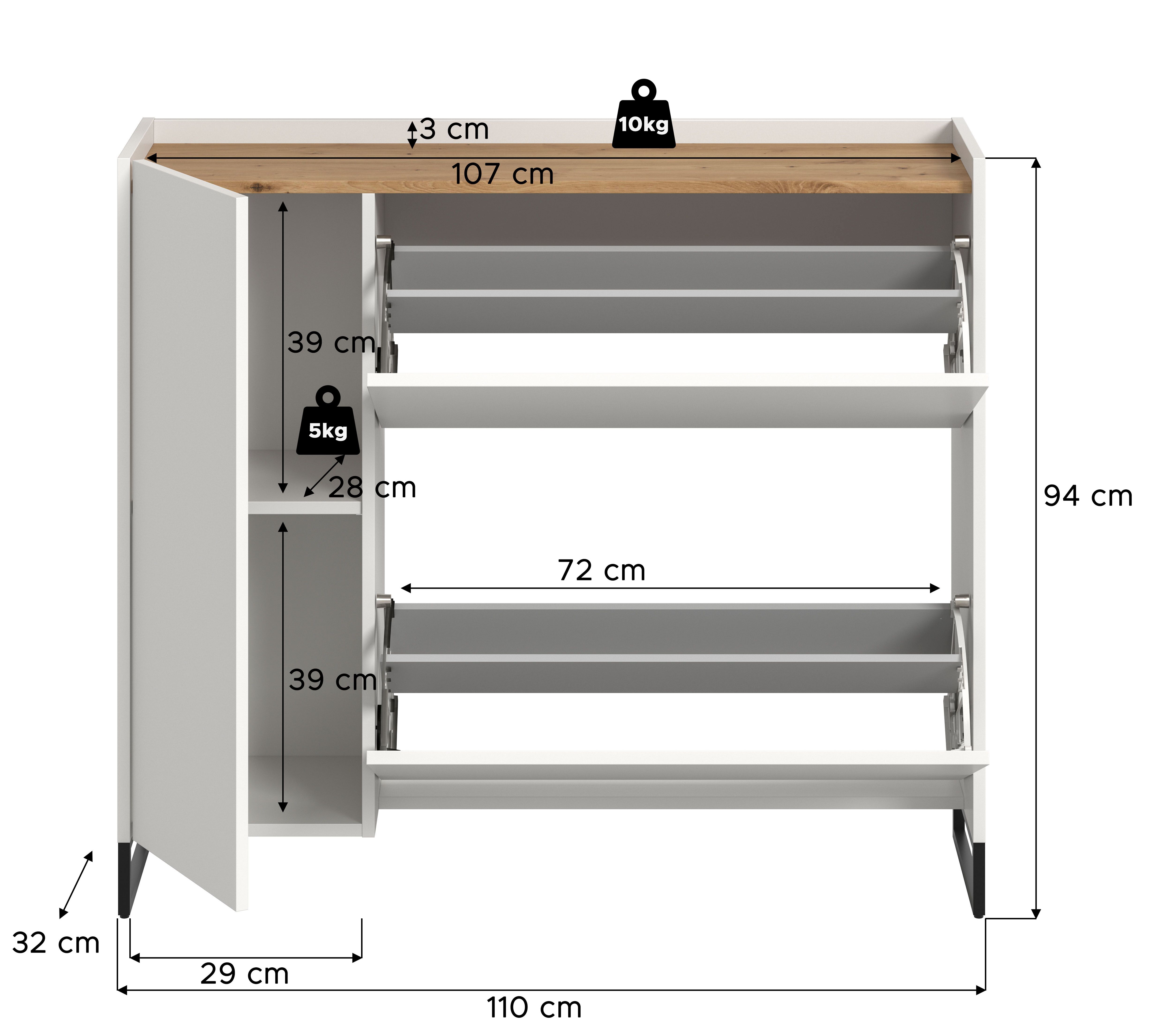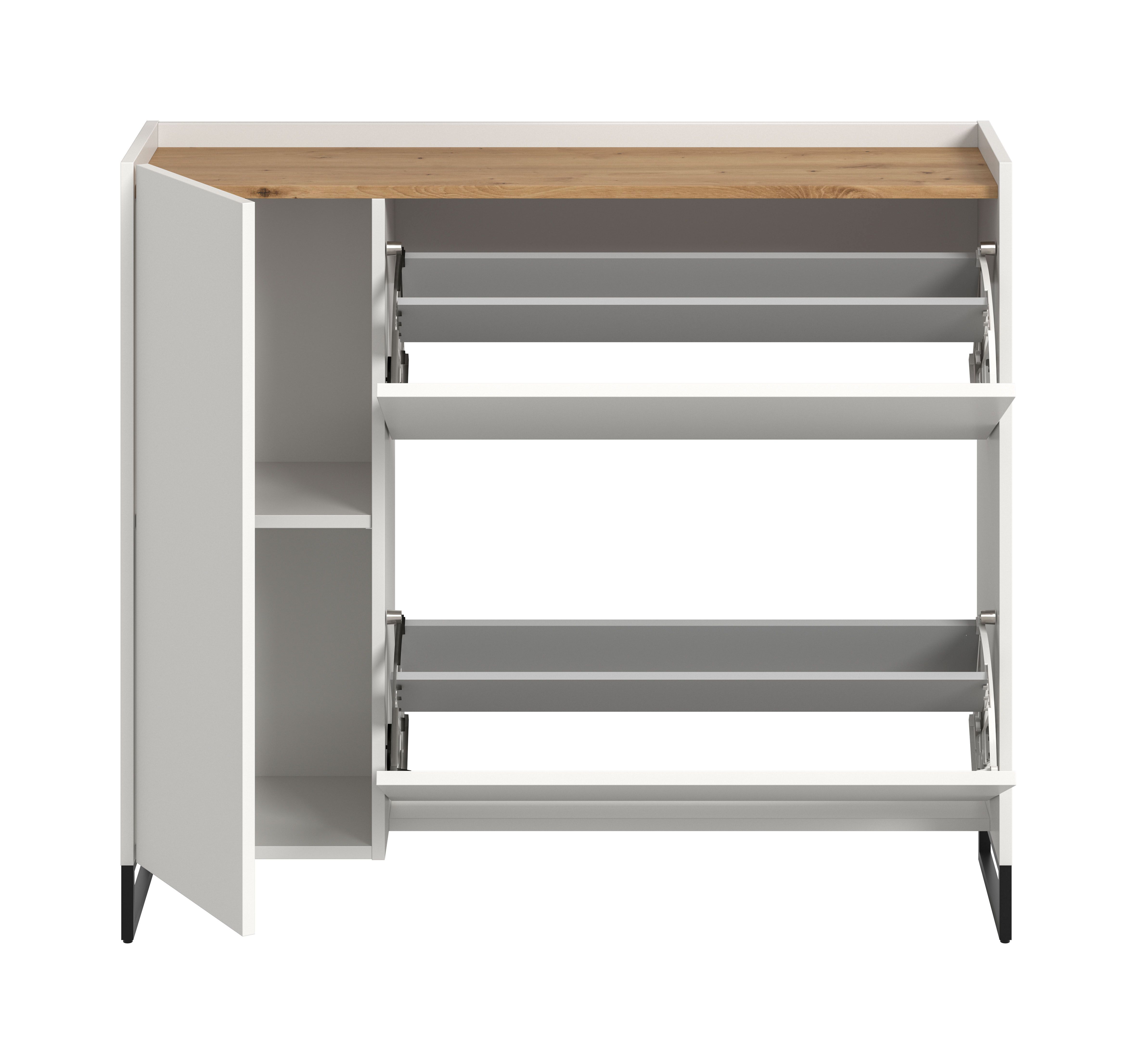 Ce meuble à chaussures (LxHxP : 110 x 94 x 32 cm) ton blanc et décor chêne Artisan dispose d’une porte, d’une tablette réglable en hauteur, de deux compartiments et de deux rangements à chaussures permettant de ranger environ 12 paires de chaussures. Fabriqué en bois composite certifié FSC®, il s’inscrit dans une démarche de durabilité. Sa surface facile d’entretien et son montage rapide garantissent un grand confort d’utilisation au quotidien. Il peut être complété par d’autres éléments de la même série pour créer un intérieur organisé et stylé.