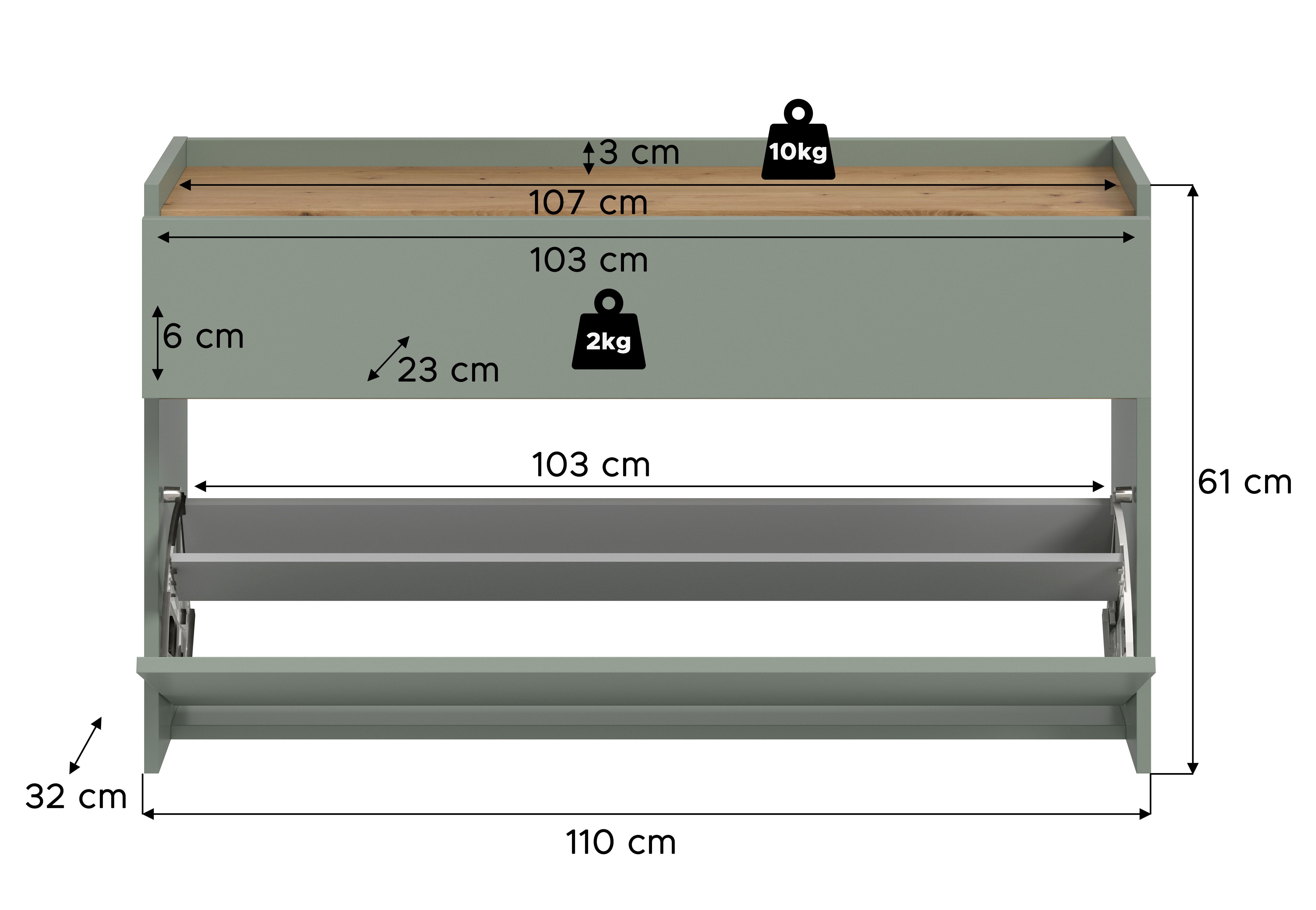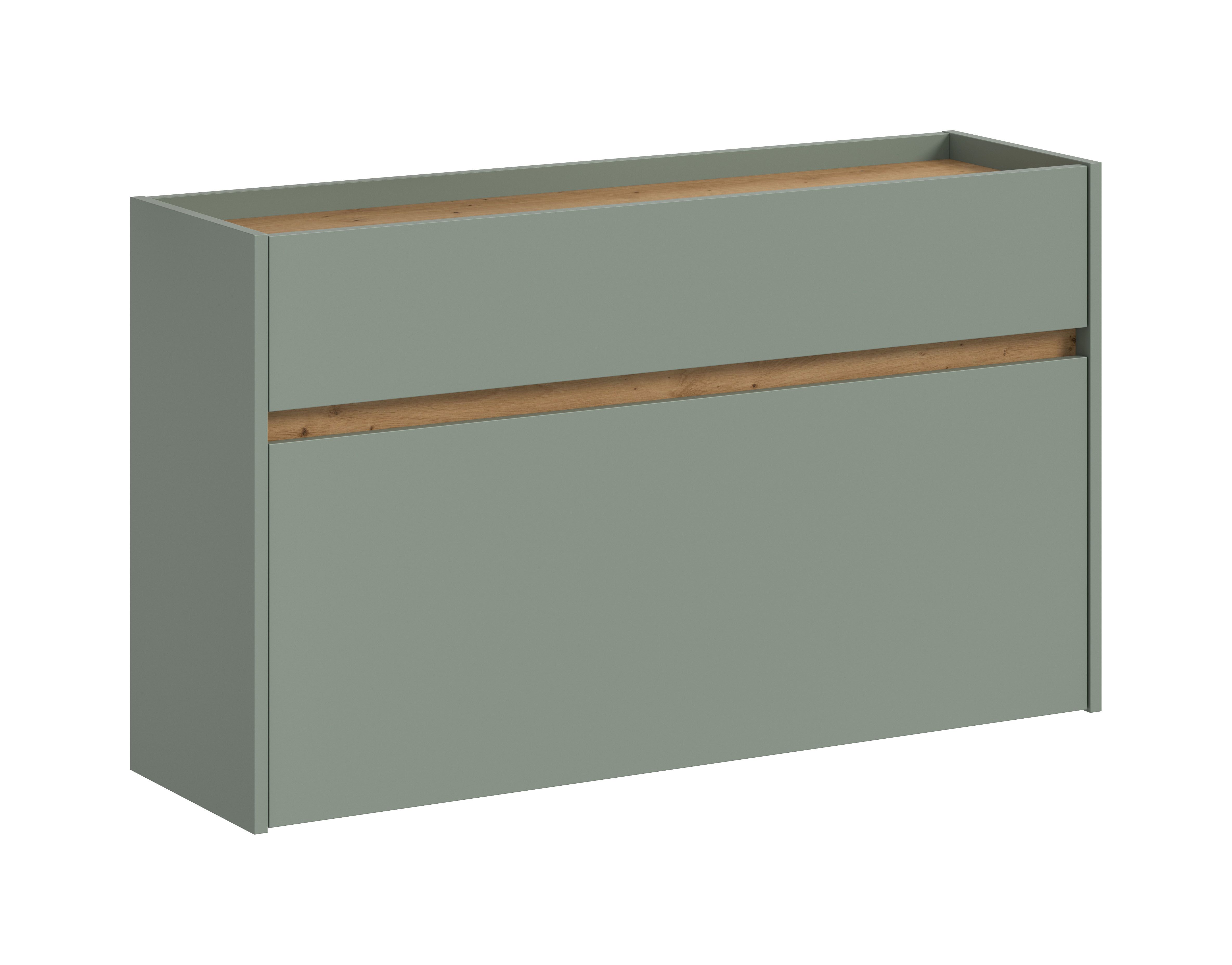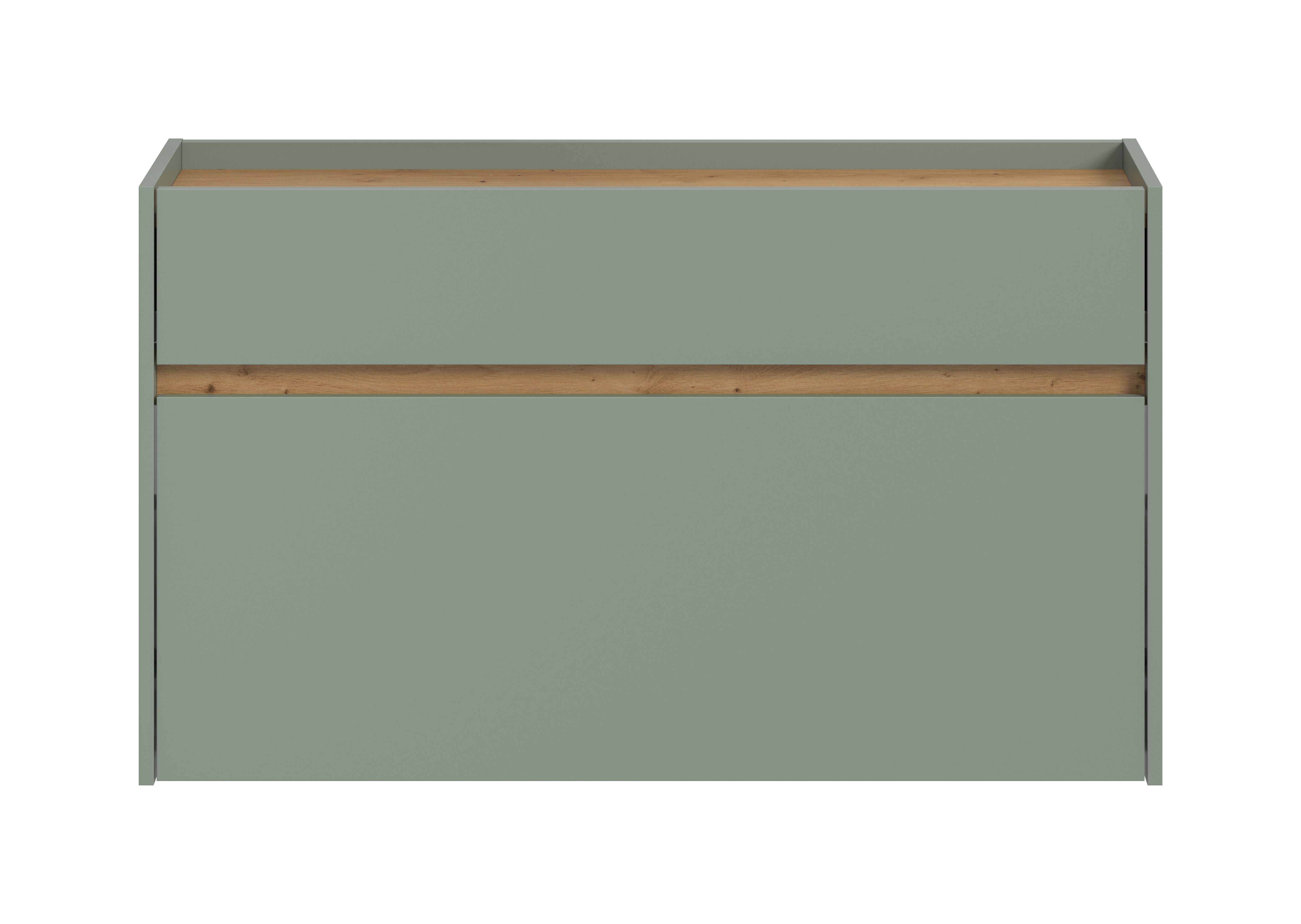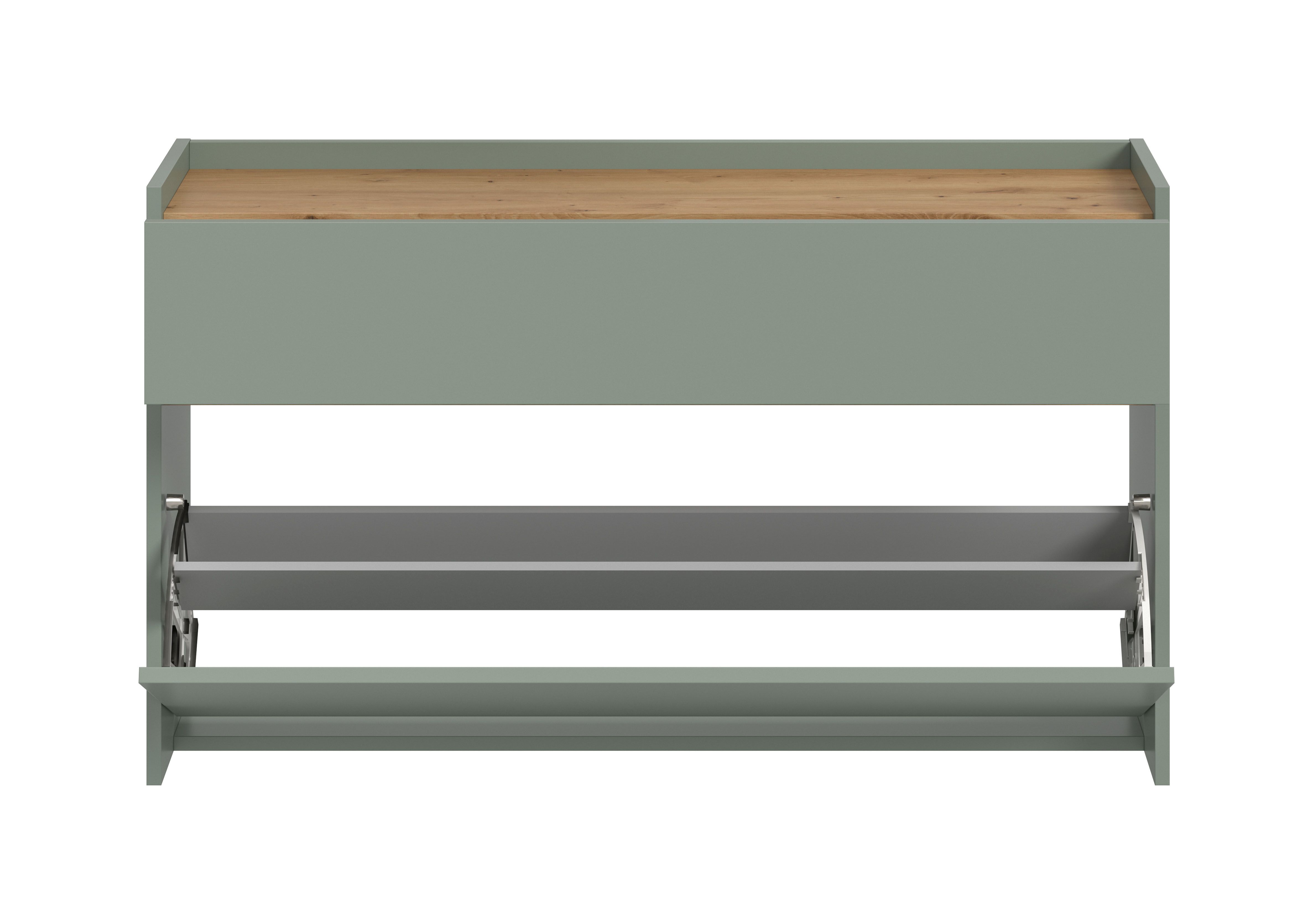Ce meuble à chaussures en décor sauge et chêne Artisan (dimensions : L/H/P : 110 x 61 x 32 cm) est équipé d’un tiroir et d’un rangement à chaussures offrant de la place pour environ 8 paires. Le bois composite certifié FSC® est synonyme de durabilité. Sa surface facile d’entretien et son montage simple en font un meuble particulièrement convivial au quotidien. Il peut être complété par d’autres articles de la série pour encore plus d’ordre et de style dans votre intérieur.