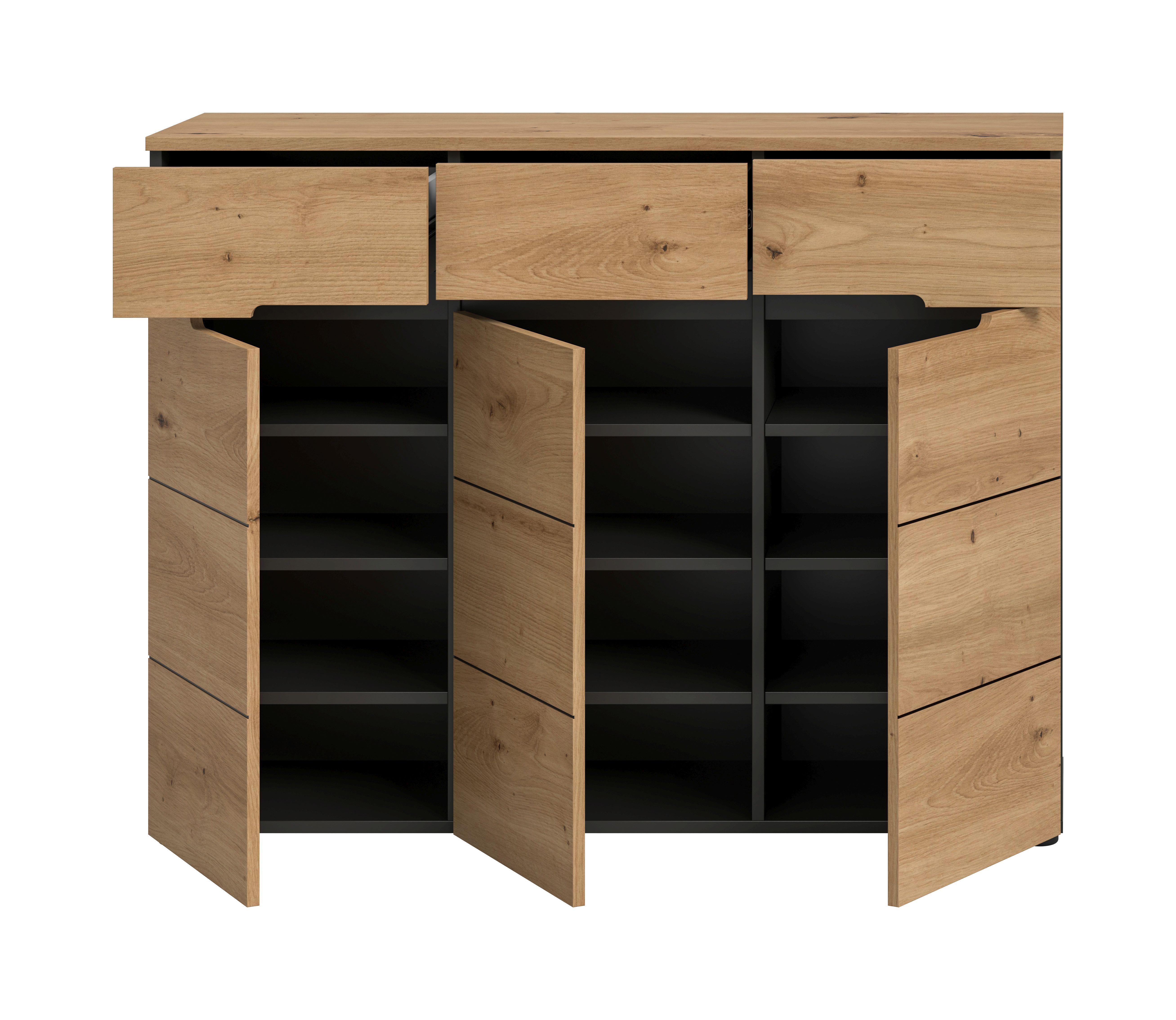 Ce meuble à chaussures en décor chêne Artisan (dimensions : L/H/P : 120 x 94 x 37 cm) est le complément parfait pour votre entrée ! Offrant de la place pour 24 paires de chaussures maximum, il permettra de garder votre espace bien rangé. Son design moderne et intemporel s’intègrera harmonieusement dans votre intérieur tout en apportant une touche élégante à votre couloir. Équipé de deux abattants pratiques, il permet un accès rapide à vos chaussures, tandis que sa forme élancée convient parfaitement même aux petits espaces. Que vous viviez en célibataire ou en famille, ce meuble à chaussures allie style et aspect pratique. Optimisez votre entrée avec ce meuble de qualité et profitez d’un espace de rangement pratique au quotidien !