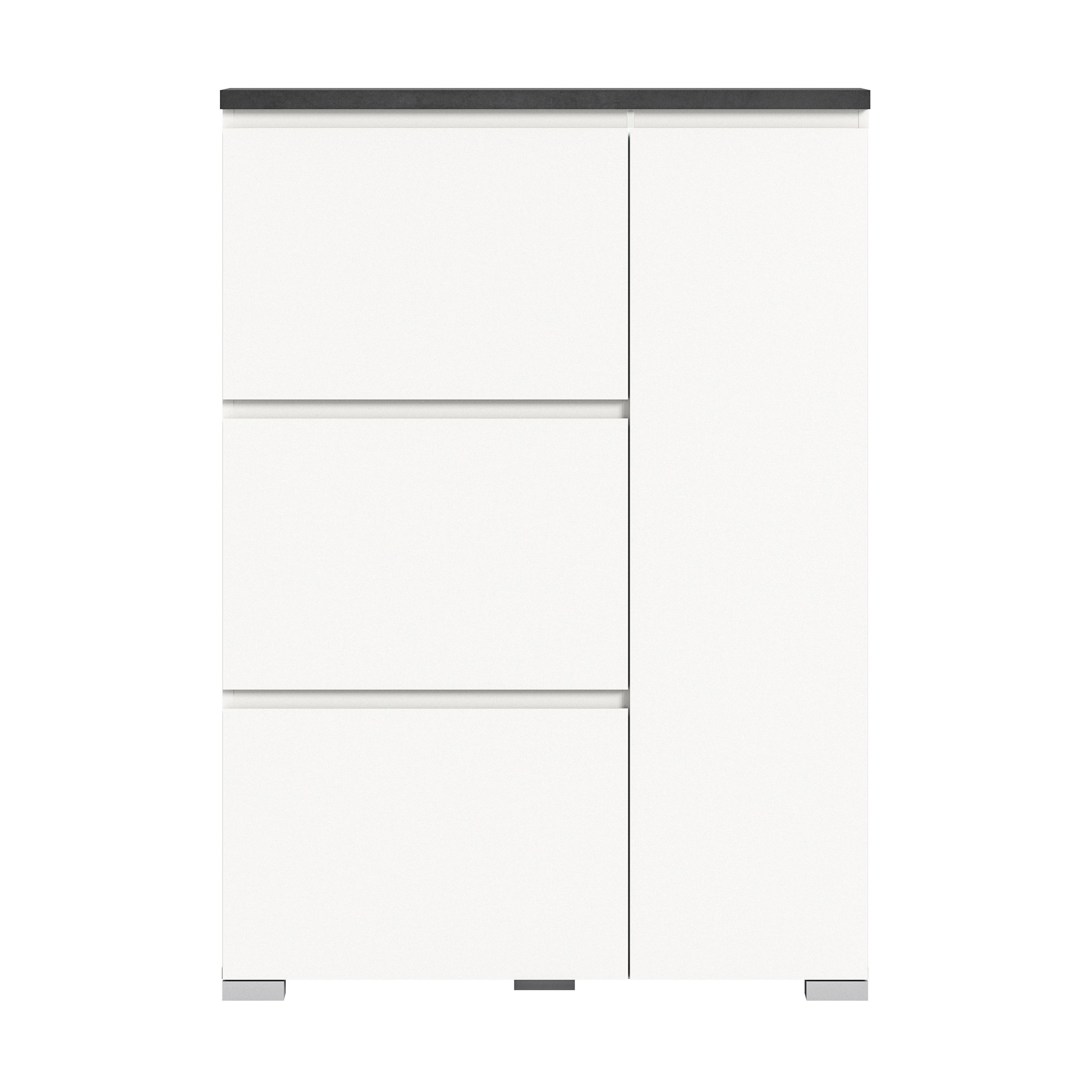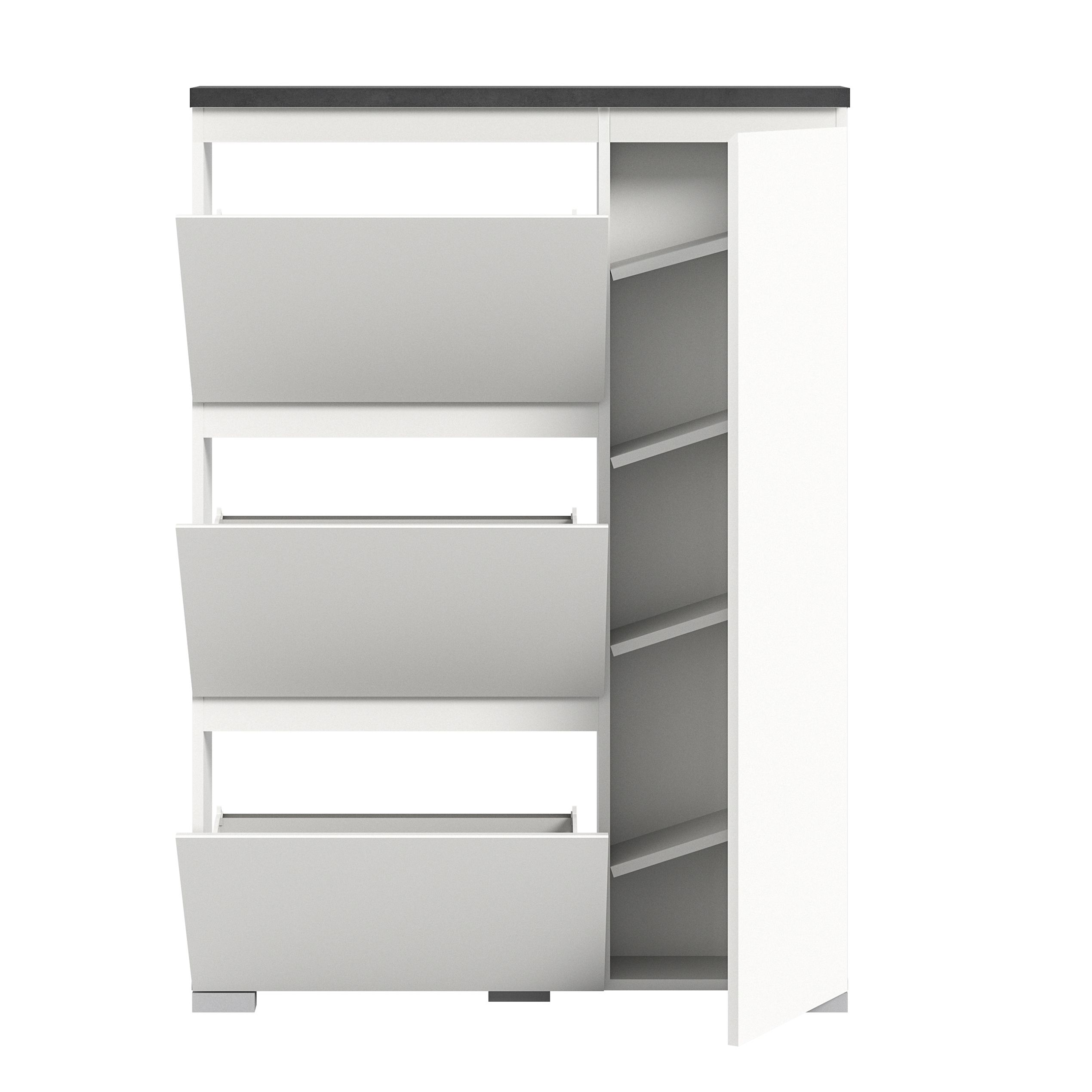 Avec notre série HADERO, découvrez ce meuble à chaussures à abattants combinable : il est proposé dans un style élégant et intemporel ton blanc avec plateau supérieur ton gris industriel et apportera une touche moderne à votre entrée. Grâce à sa conception polyvalente, vous pourrez l’adapter à vos besoins pour organiser votre collection de chaussures de façon stylée. Profitez de l’alliance parfaite entre fonctionnalité et design avec ce meuble à chaussures flexible.