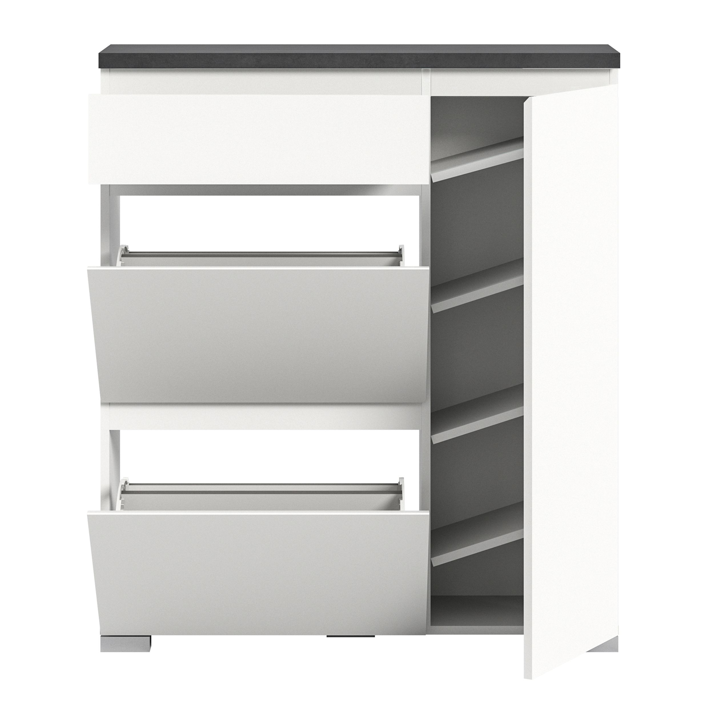 Avec notre série HADERO, découvrez ce meuble à chaussures à abattants combinable : il est proposé dans un style élégant et intemporel ton blanc avec plateau supérieur ton gris industriel et apportera une touche moderne à votre entrée. Grâce à sa conception polyvalente, vous pourrez l’adapter à vos besoins pour organiser votre collection de chaussures de façon stylée. Profitez de l’alliance parfaite entre fonctionnalité et design avec ce meuble à chaussures flexible.