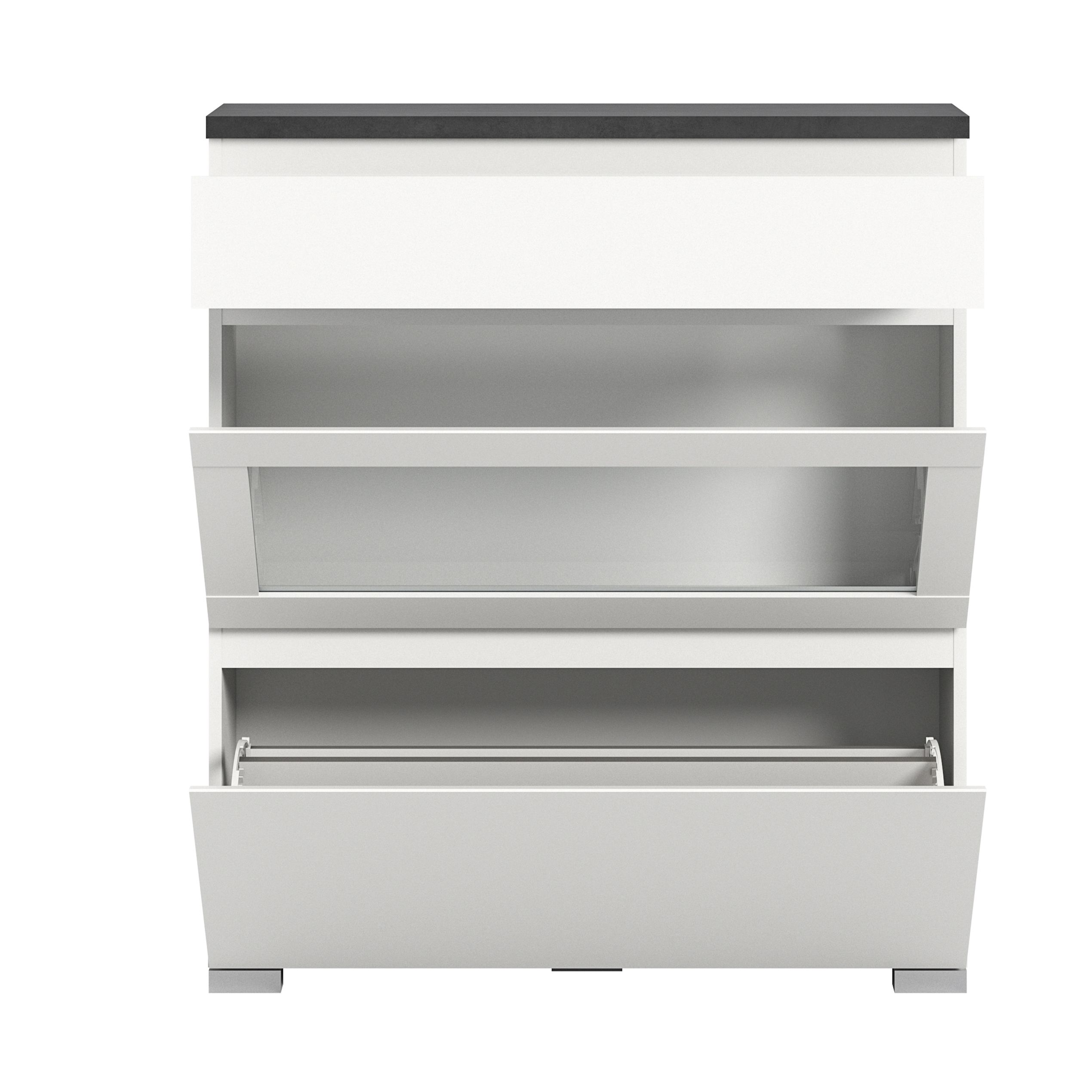 Avec notre série HADERO, découvrez ce meuble à chaussures à abattants combinable : il est proposé dans un style élégant et intemporel ton blanc avec plateau supérieur ton gris industriel et apportera une touche moderne à votre entrée. Grâce à sa conception polyvalente, vous pourrez l’adapter à vos besoins pour organiser votre collection de chaussures de façon stylée. Profitez de l’alliance parfaite entre fonctionnalité et design avec ce meuble à chaussures flexible.