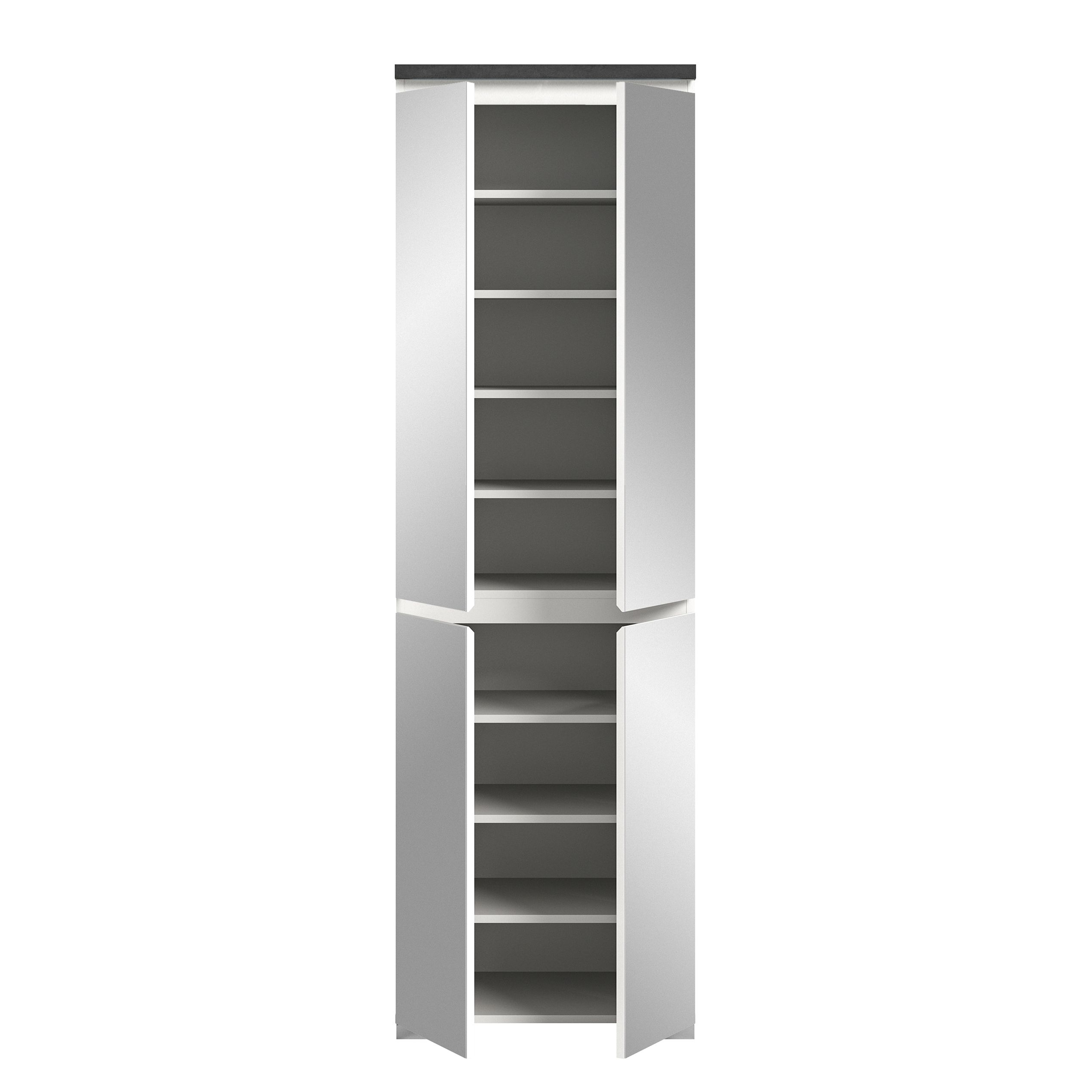 Découvrez, dans notre série HADERO, cette armoire à chaussures avec miroir intégré dans un décor ton blanc avec panneau supérieur ton gris industriel : un modèle qui se combine parfaitement avec d’autres meubles d’entrée. Grâce à ses dimensions généreuses (60x193x40 cm) ; elle offre suffisamment de place pour ranger les chaussures et une surface miroir pratique pour vérifier sa tenue avant de sortir de la maison. Expérimentez l’association optimale entre style et fonctionnalité avec ce meuble polyvalent.