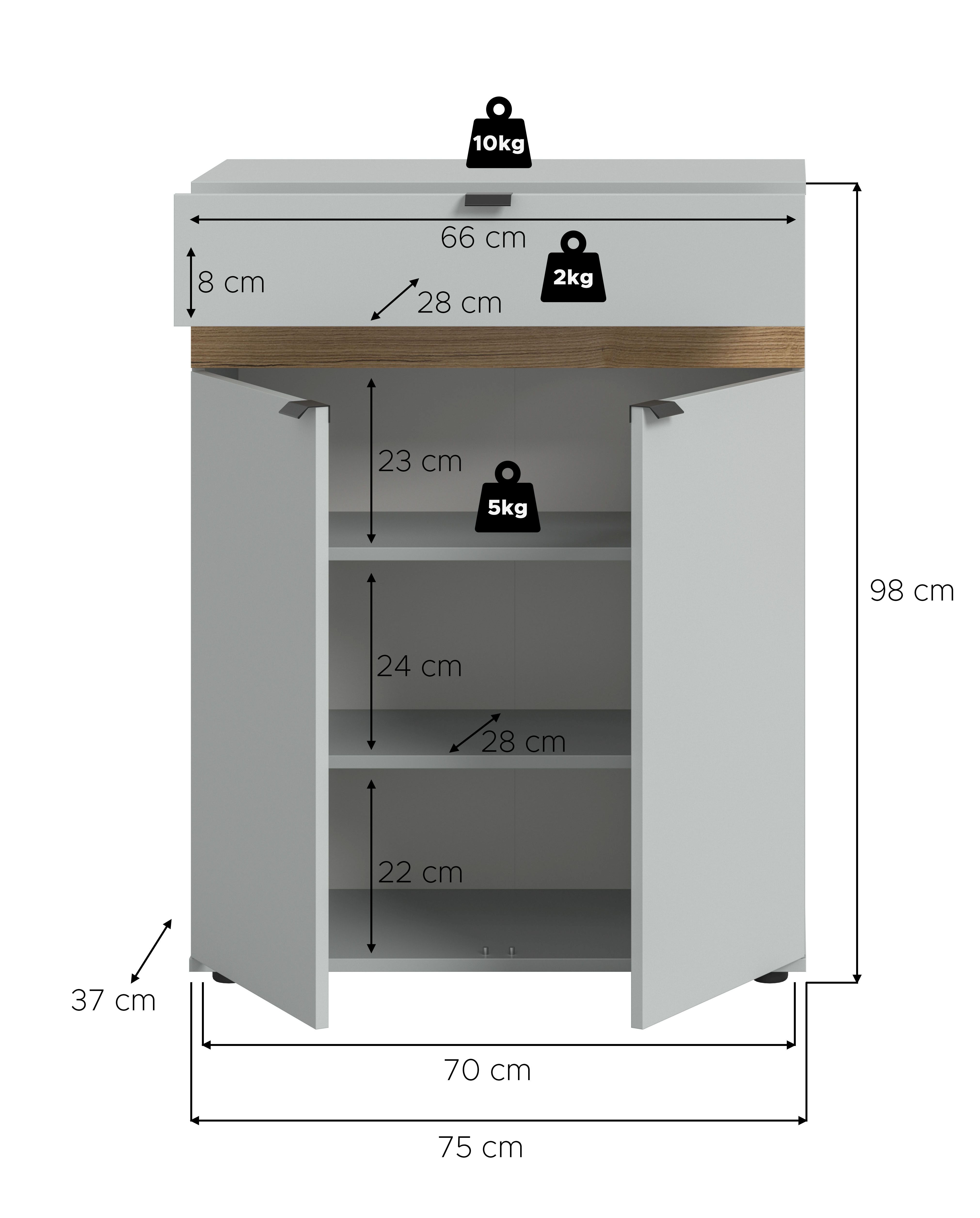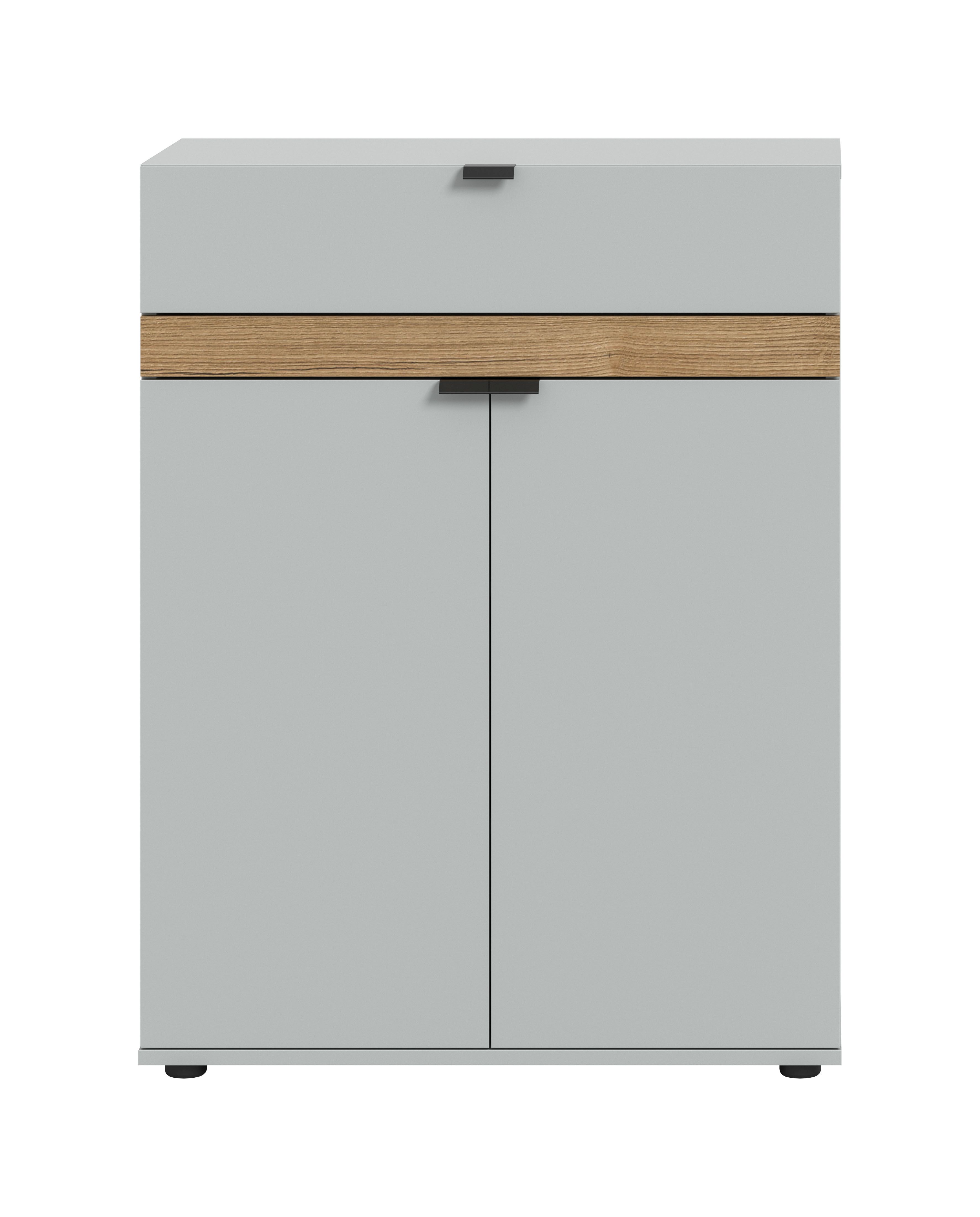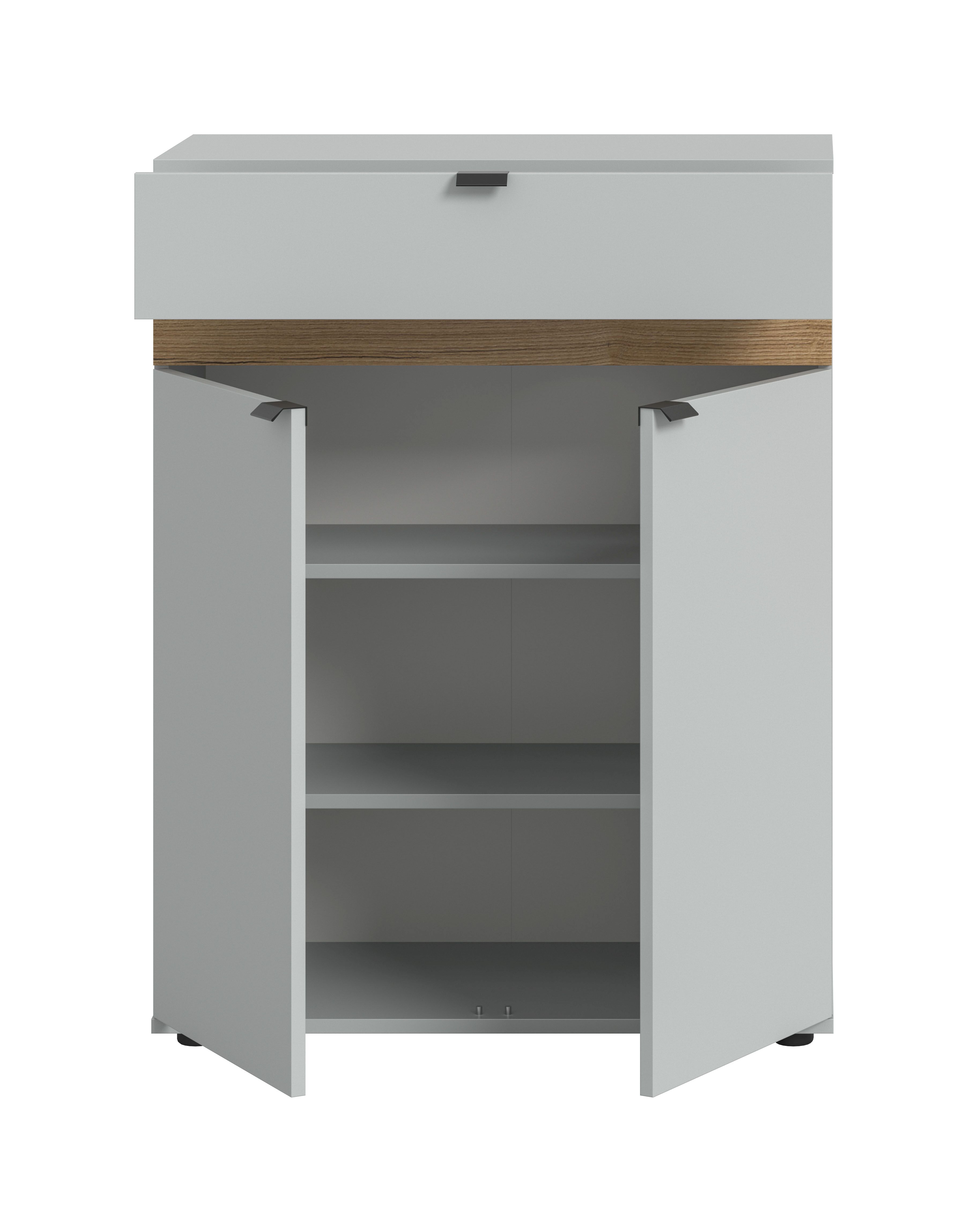 Ce meuble à chaussures en décor gris (dimensions : L/H/P : 75 x 98 x 37 cm) offre un bel espace de rangement grâce à deux portes, deux tablettes réglables en hauteur, trois compartiments fermés et un tiroir à sortie totale – le modèle idéal pour vos chaussures et autres effets personnels. Sa surface facile d’entretien lui donne un look moderne et permet un nettoyage aisé. Robuste et durable, ce meuble vous accompagnera longtemps. Le montage rapide et simple permet une installation facile dans votre entrée. Grâce aux nombreuses possibilités d'association des éléments de la série, ce meuble à chaussures s’intègrera parfaitement à votre intérieur tout en contribuant à une entrée bien rangée et stylée. Ce meuble allie fonctionnalité et design avec brio.