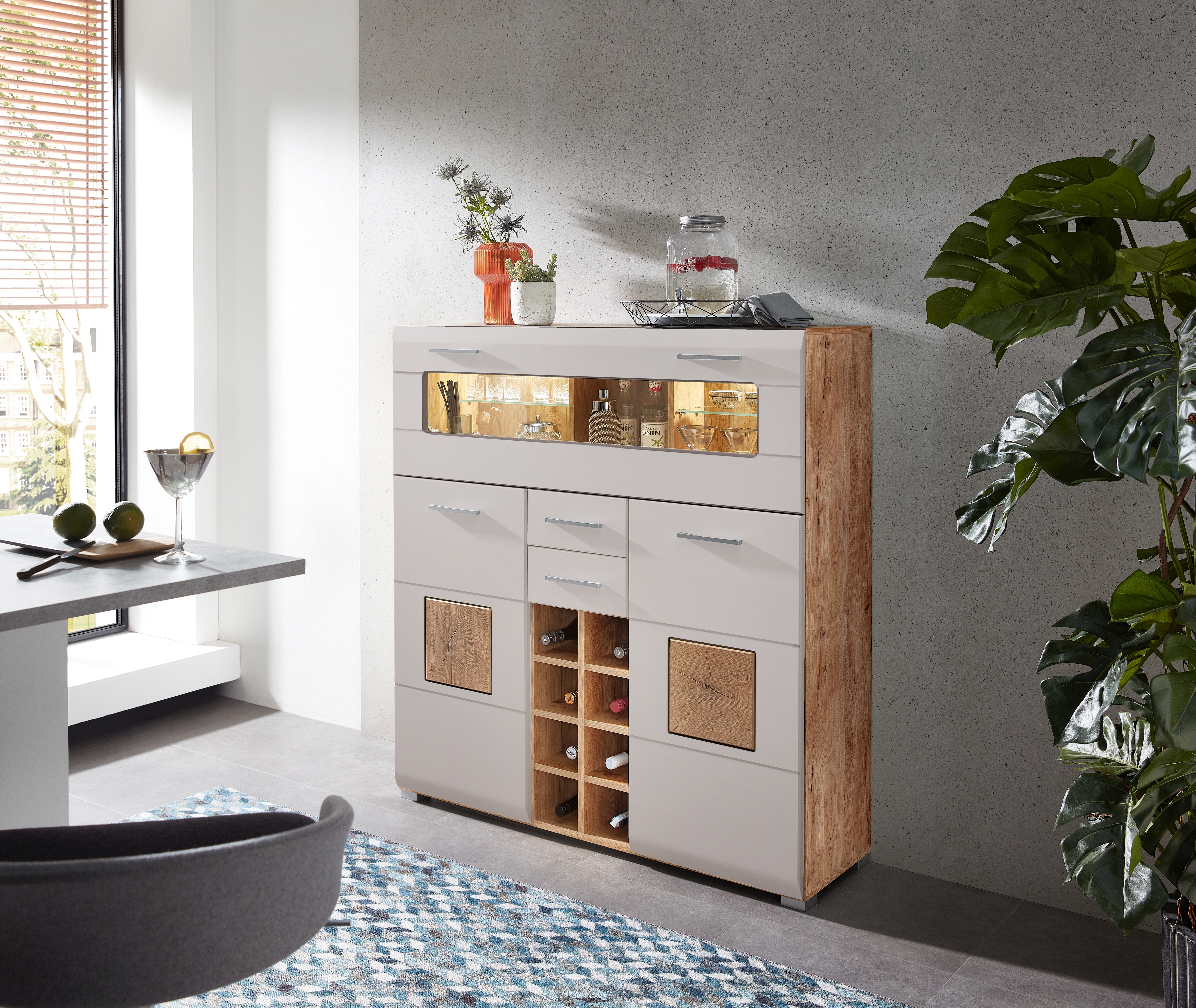 Façade : MDF (panneau en fibre de bois de densité moyenne) ton cachemire mat avec contrastes décor bois de bout / verre transparent