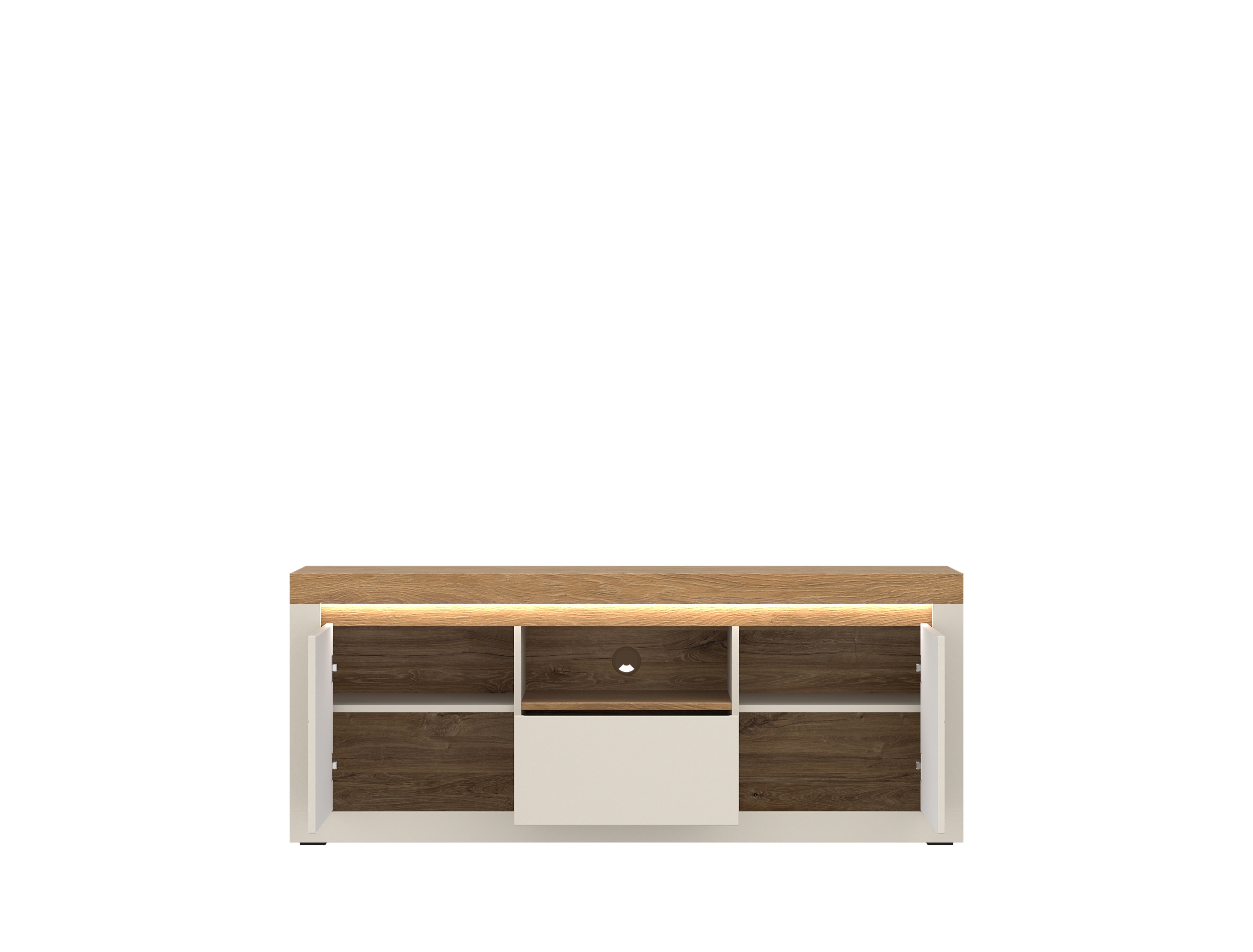 Ce meuble bas pratique seduit par sa fabrication robuste et ses equipements fonctionnels. La combinaison des surfaces en cachemire et des contrastes en imitation bois de chene Stone confere a ce meuble un aspect moderne mais sobre. Equipe de deux portes avec fonction de fermeture douce, d'un tiroir a extension totale et d'un compartiment ouvert, ce meuble bas offre de nombreuses possibilites de rangement pour le salon, le bureau ou la chambre d'amis. Grace a son revetement en resine melaminee facile d'entretien et a ses materiaux resistants, il est particulierement adapte a un usage quotidien. Ideal pour tous ceux qui recherchent un meuble solide et abordable avec un espace de rangement fiable - bien sur avec la garantie de prix MEGA.