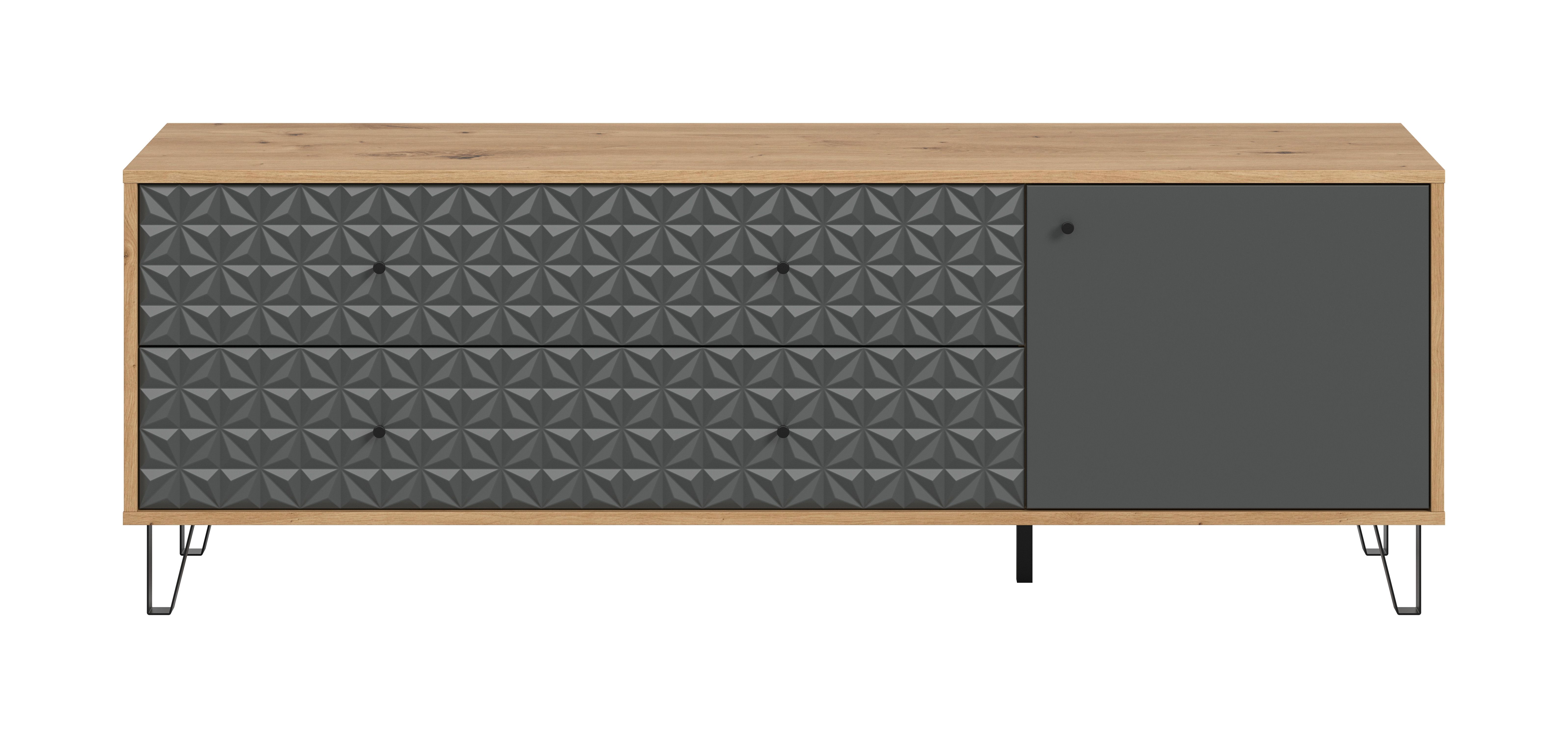 Découvrez ce meuble bas moderne qui séduit par son design élégant et sa grande fonctionnalité ! La combinaison du bois imitation chêne Artisan et de l'anthracite mat en fait un élément intemporel qui attire le regard dans chaque pièce. Avec ses dimensions d'environ 164 x 56 x 40 cm, il offre un espace de rangement pratique et une surface de rangement généreuse. Derrière une porte avec étagère réglable en hauteur, vous trouverez de la place pour des solutions de rangement individuelles. Deux compartiments ouverts et deux tiroirs complètent le meuble bas et garantissent un rangement parfait.