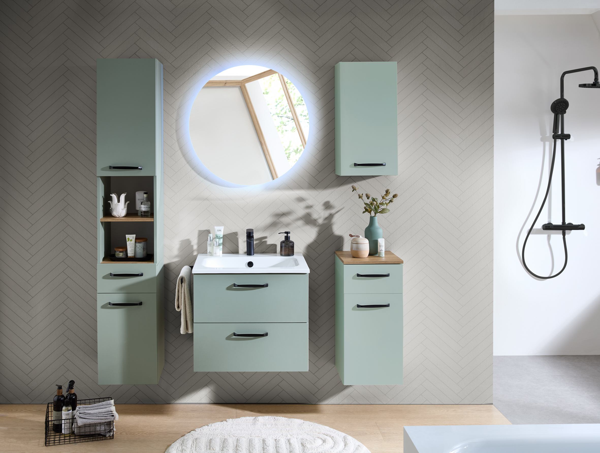 Ce meuble bas allie design moderne et fonctionnalite pratique. La couleur uniforme de la facade et du corps est elegamment rehaussee par un contraste en aspect bois, tandis que les poignees noires creent un contraste raffine. Une porte battante et un tiroir avec fonction de fermeture douce permettent une ouverture et une fermeture confortables et silencieuses. Une etagere en verre offre un espace de rangement bien agence. La finition de haute qualite et la fabrication en Allemagne font de ce meuble bas le complement ideal des salles de bains modernes.