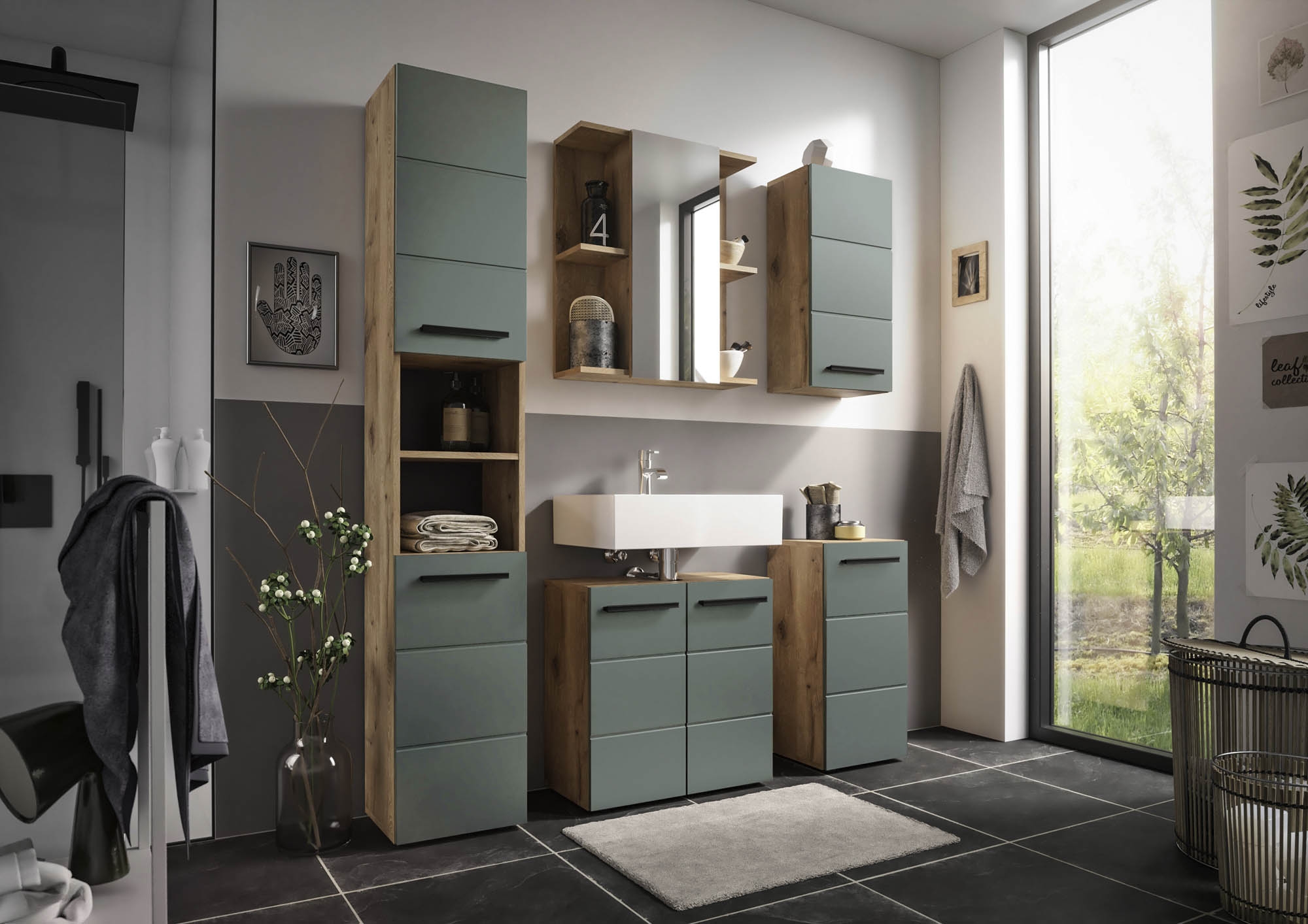 Façade : MDF (panneaux de fibres de bois de densité moyenne) thermoformé et pelliculé ton vert roseau