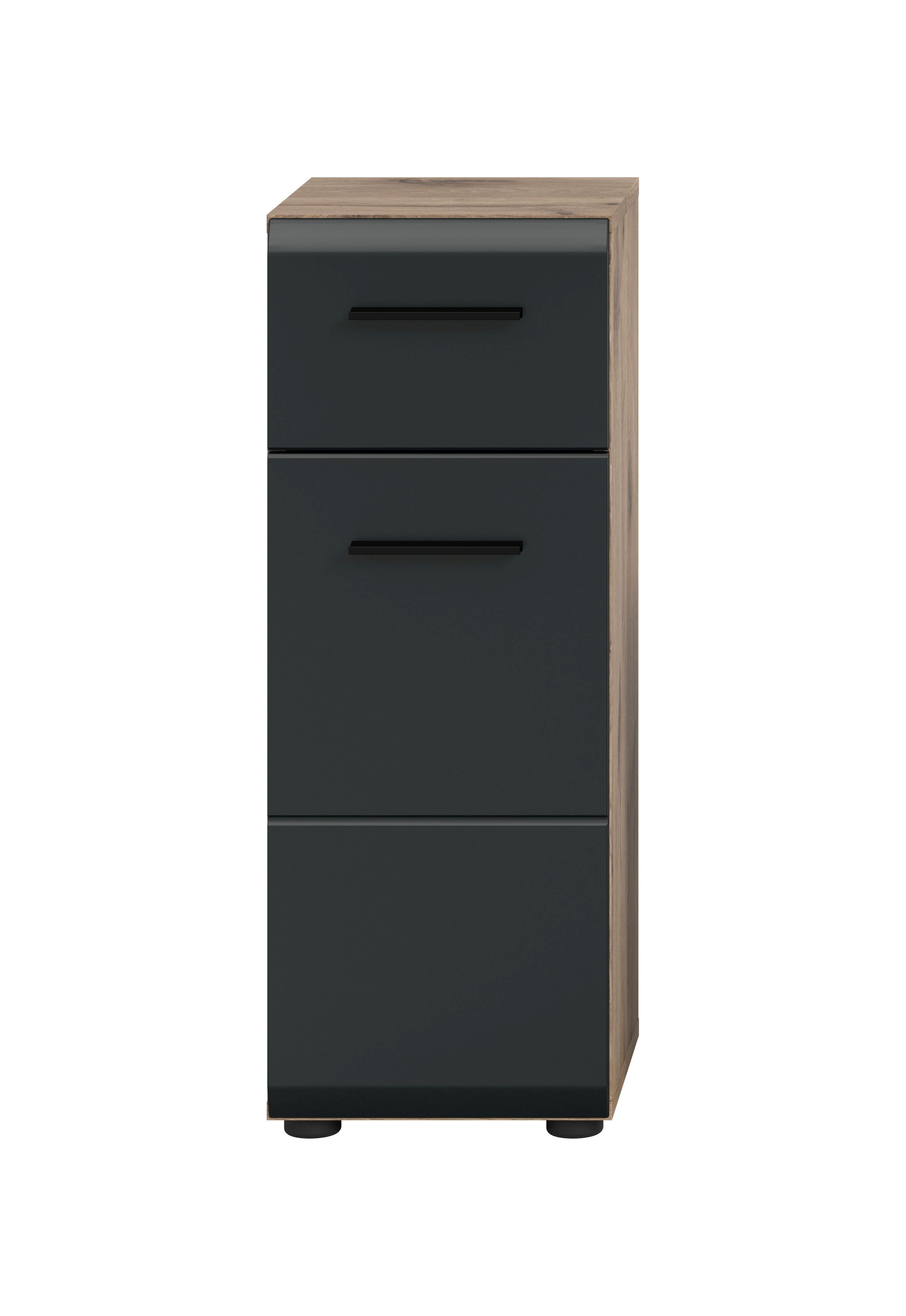 Découvrez notre meuble de salle de bains peu encombrant dans un ton noir mat et décor chêne Nox. Grâce à ses dimensions généreuses (30x80x30 cm), ce meuble offre à la fois un bel espace de rangement pour vos accessoires de bain tout en mettant joliment en valeur votre salle de bains avec une touche tendance.