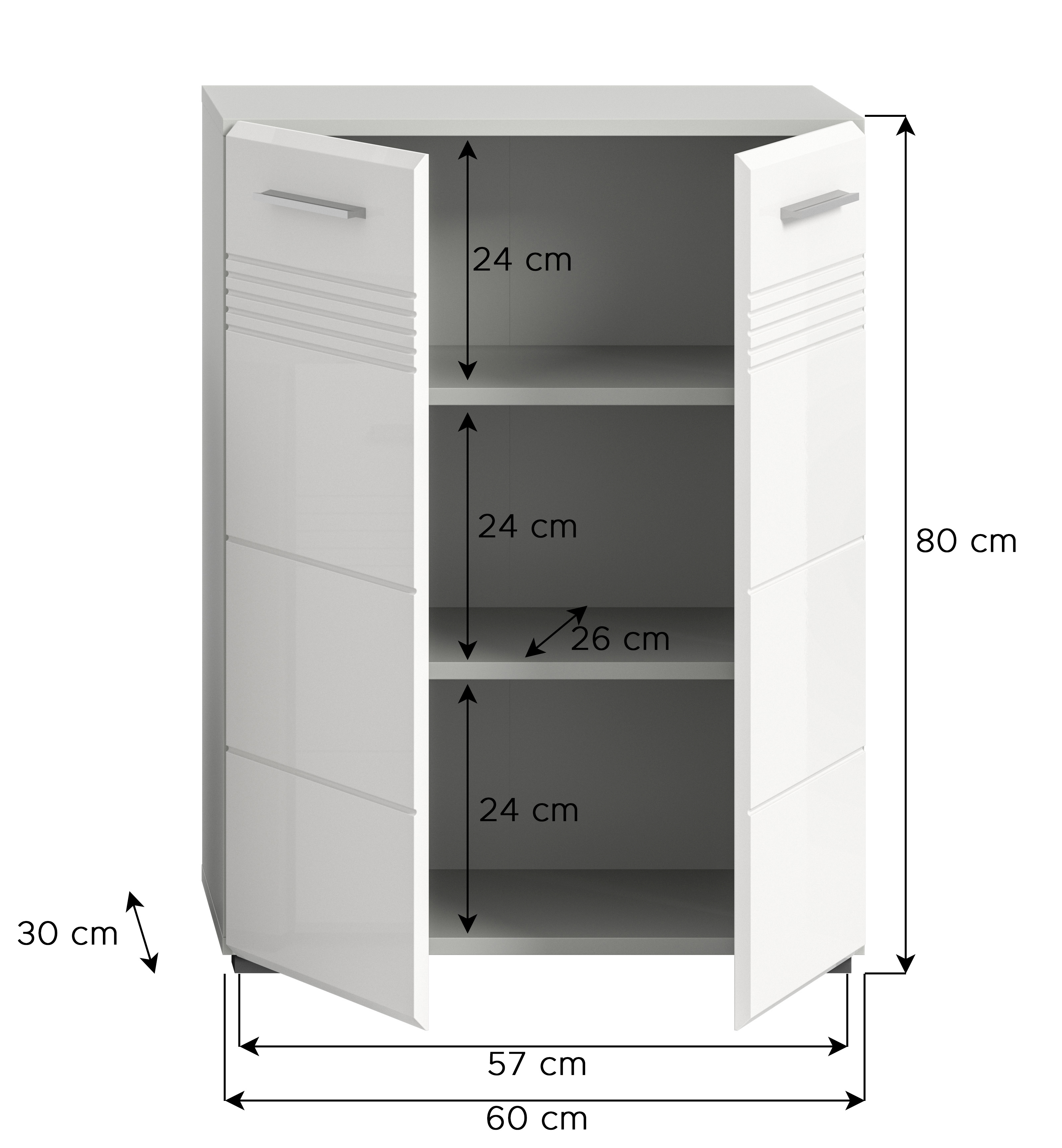 Découvrez notre meuble de salle de bains de qualité dans un décor ton gris clair et ton blanc ultra brillant thermoformé dans une finition étincelante. Grâce à ses dimensions (L/H/P: 60x80x30 cm), ce meuble n’offre pas seulement un bel espace de rangement : il conférera également à votre salle de bains une touche tendance. Ce meuble est le choix idéal pour associer style et fonctionnalité dans votre salle de bains.