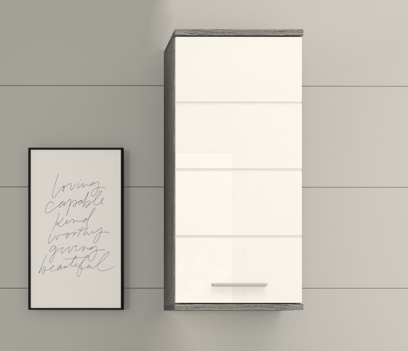 - Design/style : meuble haut compact dans un contraste attrayant mélangeant décor bois argent fumé et ton blanc ultra brillant ; il apportera une touche de modernité et d’élégance dans votre salle de bains.