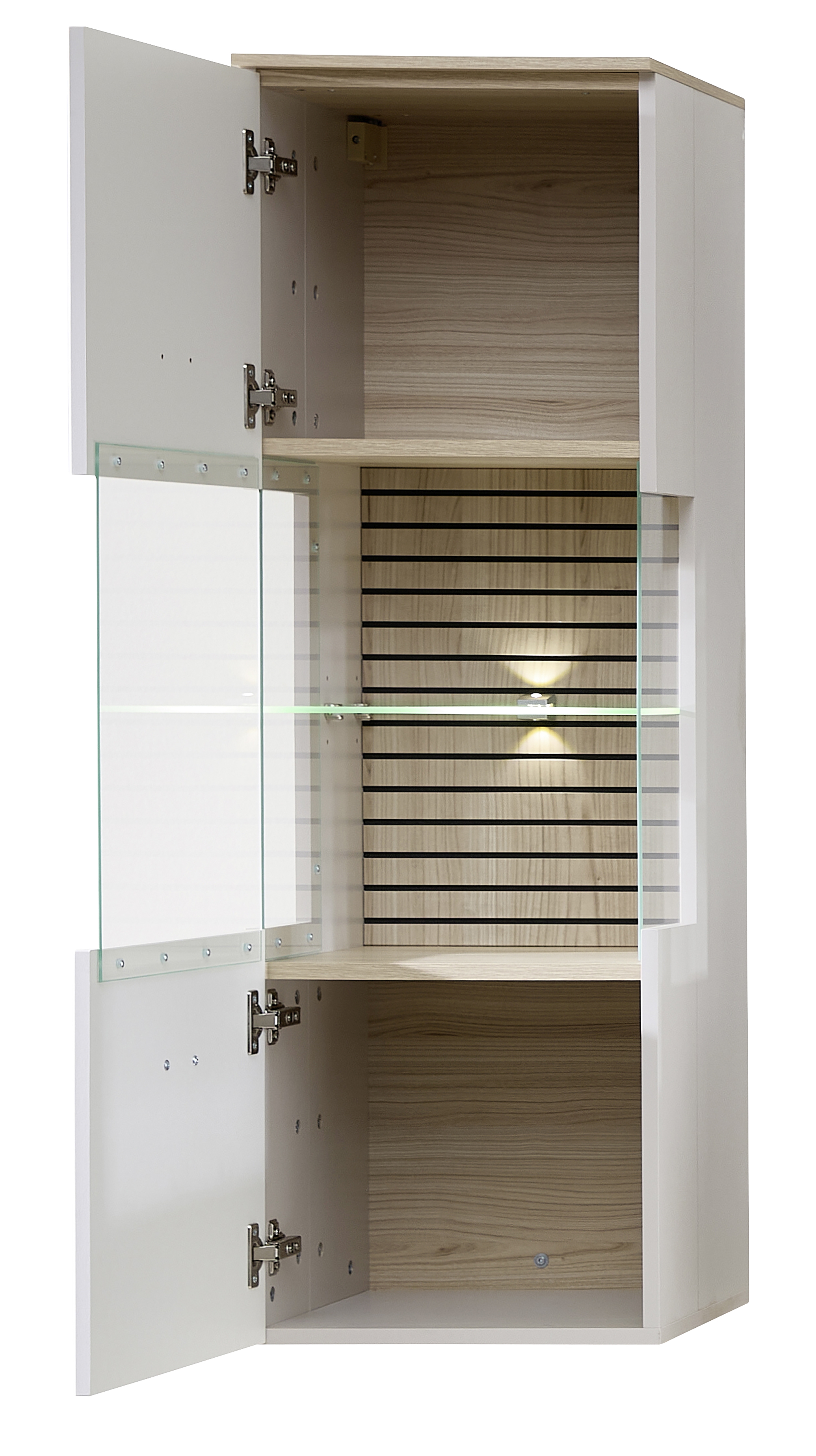 Façade : MDF (panneau de fibres de bois de densité moyenne) ton cachemire et contrastes MDF décor chêne Riva aspect lattes de bois / verre transparent