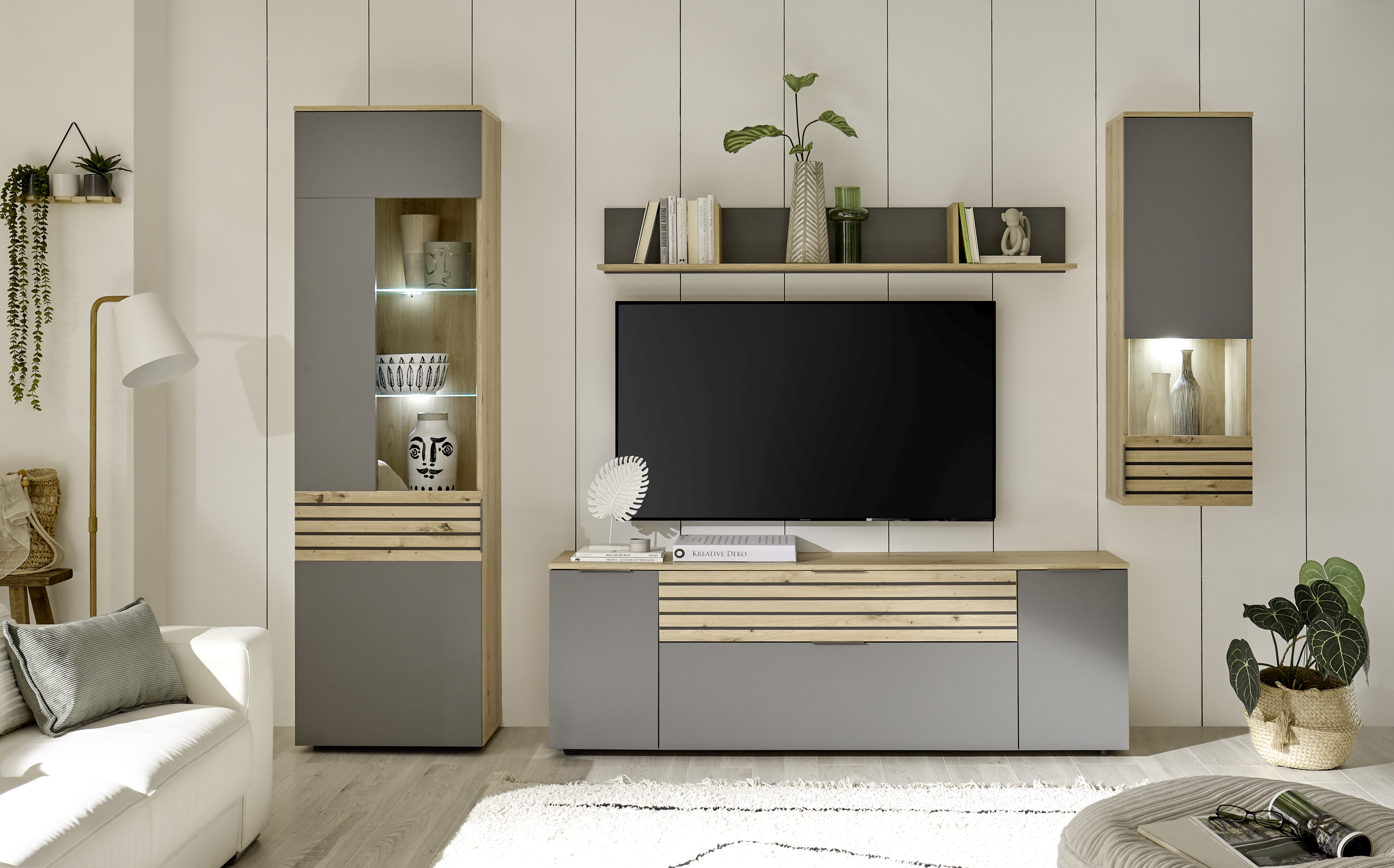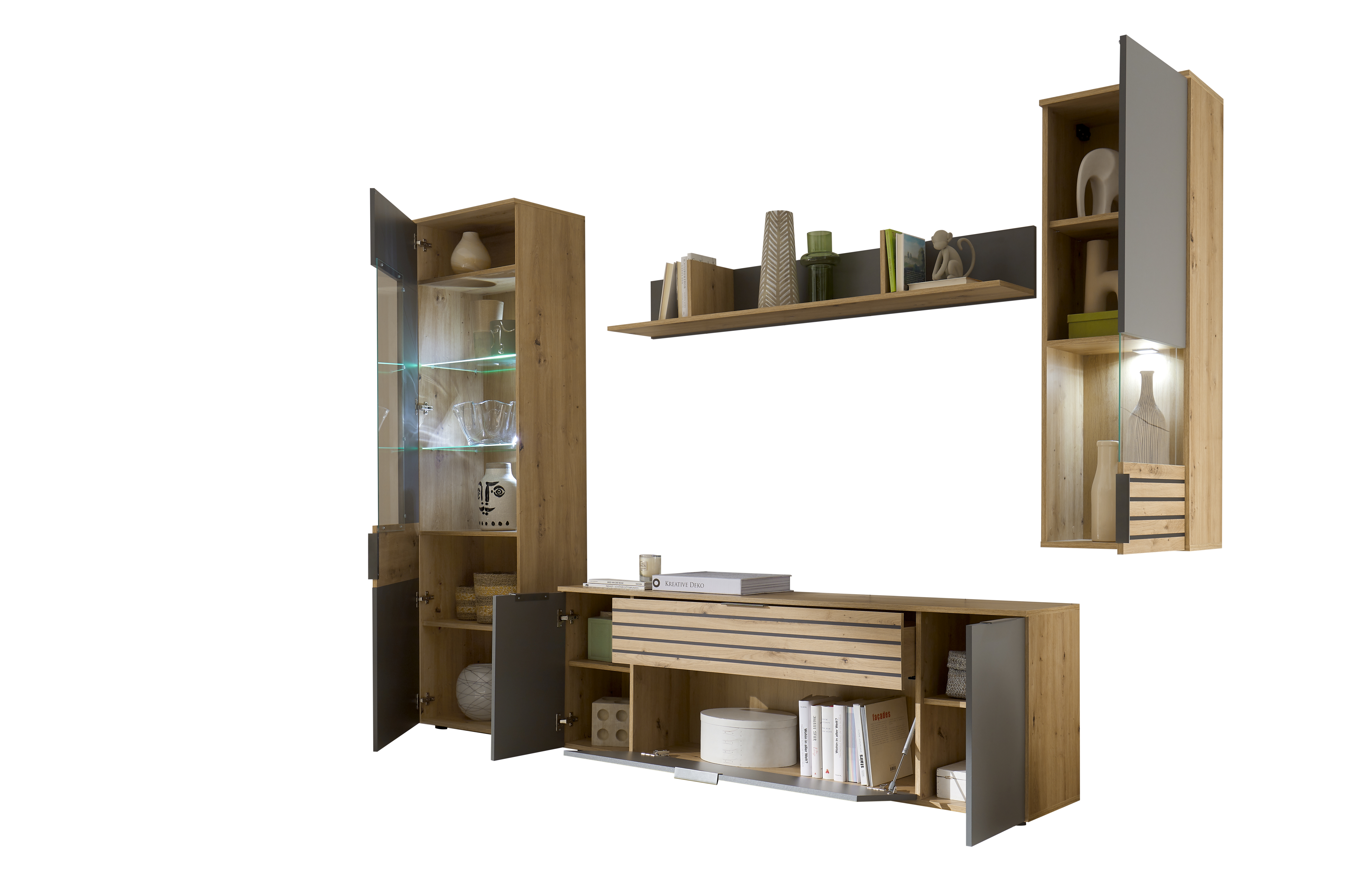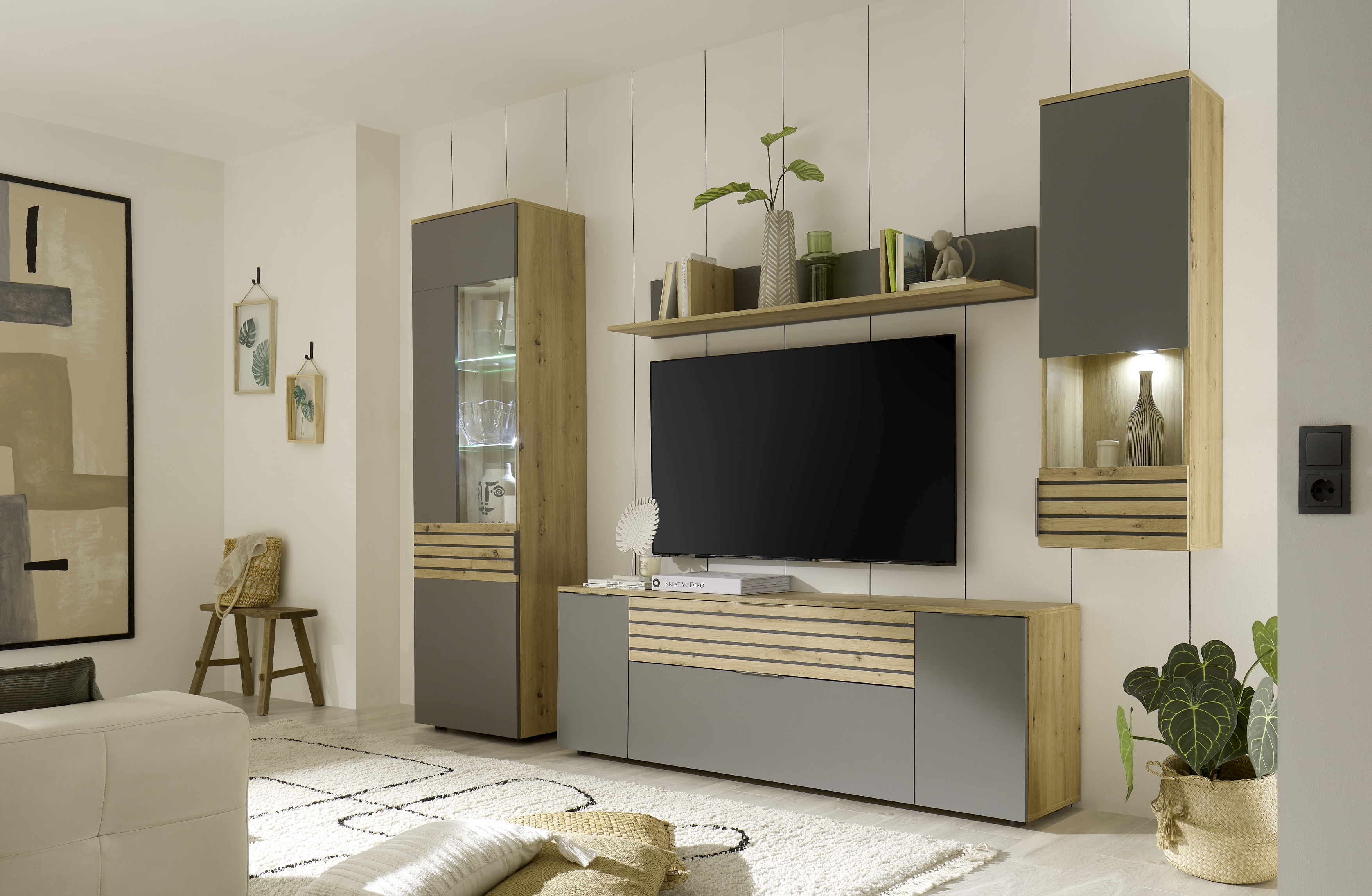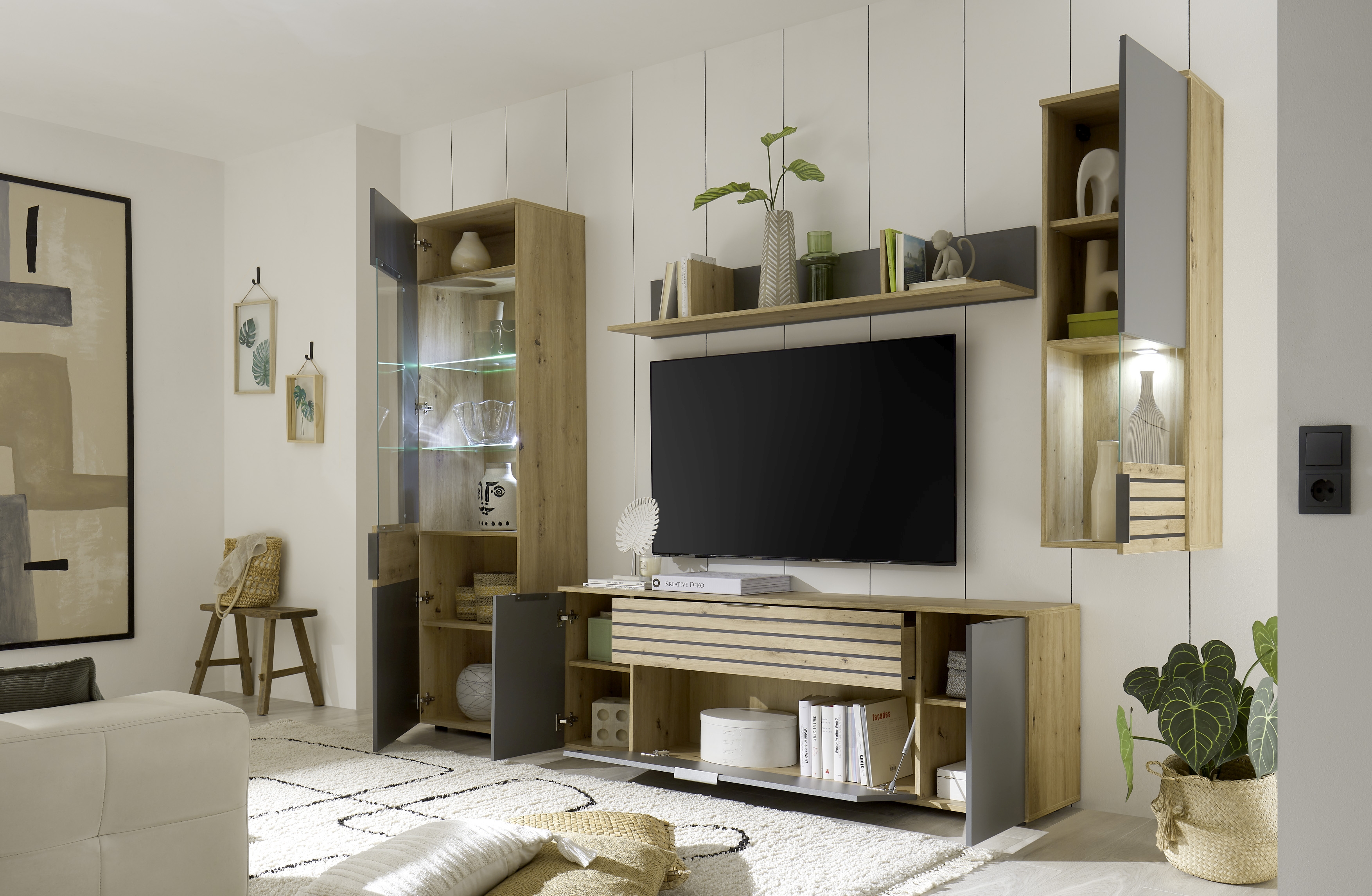 Ce meuble mural élégant et moderne apporte une touche de raffinement à votre salon. L'association du motif imitation bois « Artisan Oak » et des accents gris confère à l'ensemble un charme naturel très séduisant, tandis que les lignes épurées et la finition de grande qualité lui donnent un look contemporain.