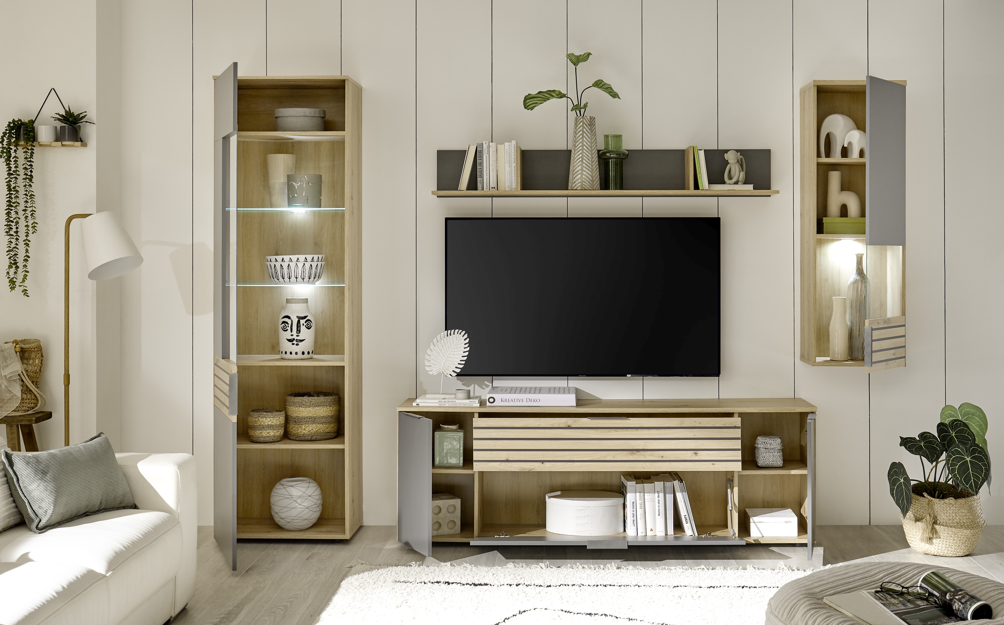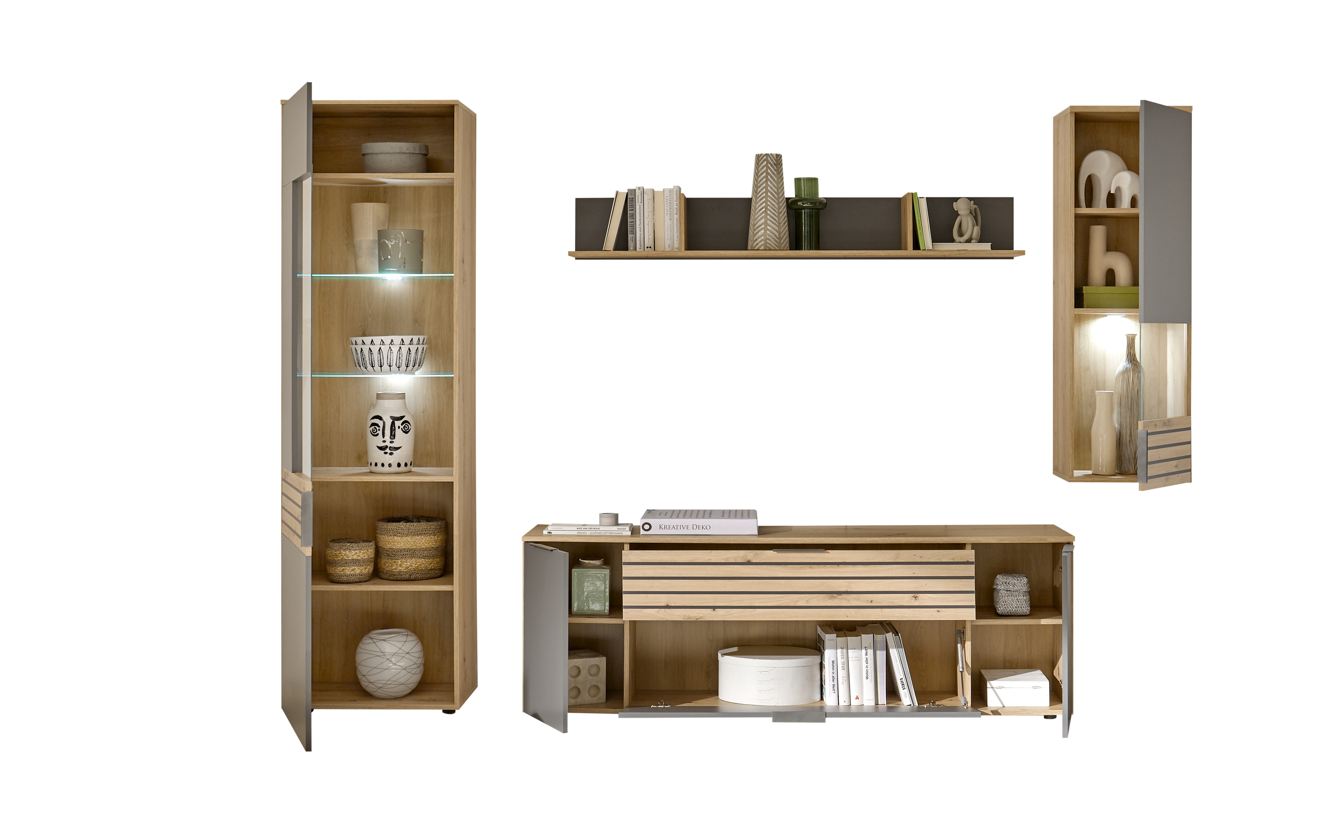 - Beaucoup d'espace de rangement : avec la vitrine, l'étagère murale, le meuble bas et la vitrine suspendue, cet ensemble offre une multitude de surfaces de rangement et de possibilités de rangement