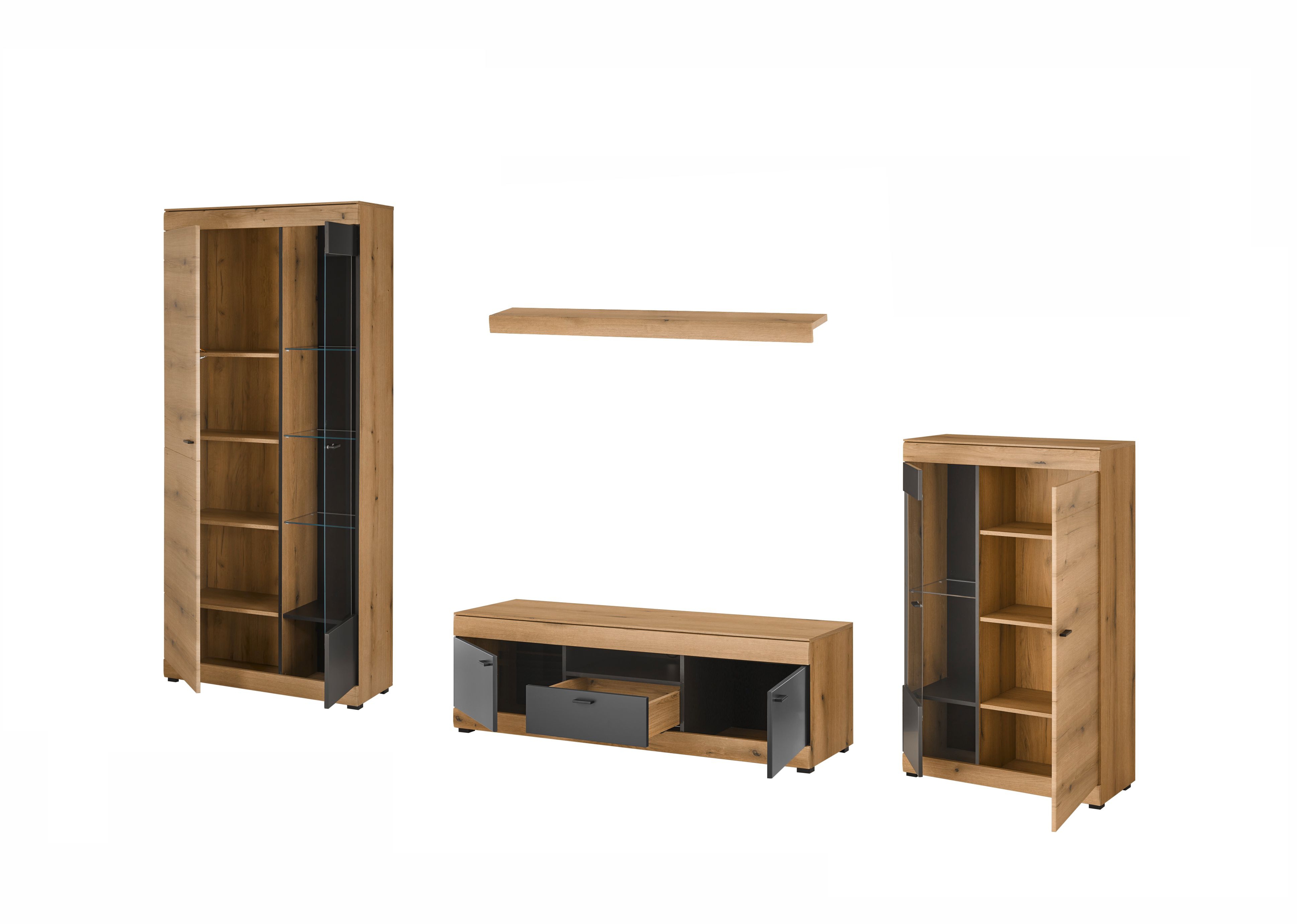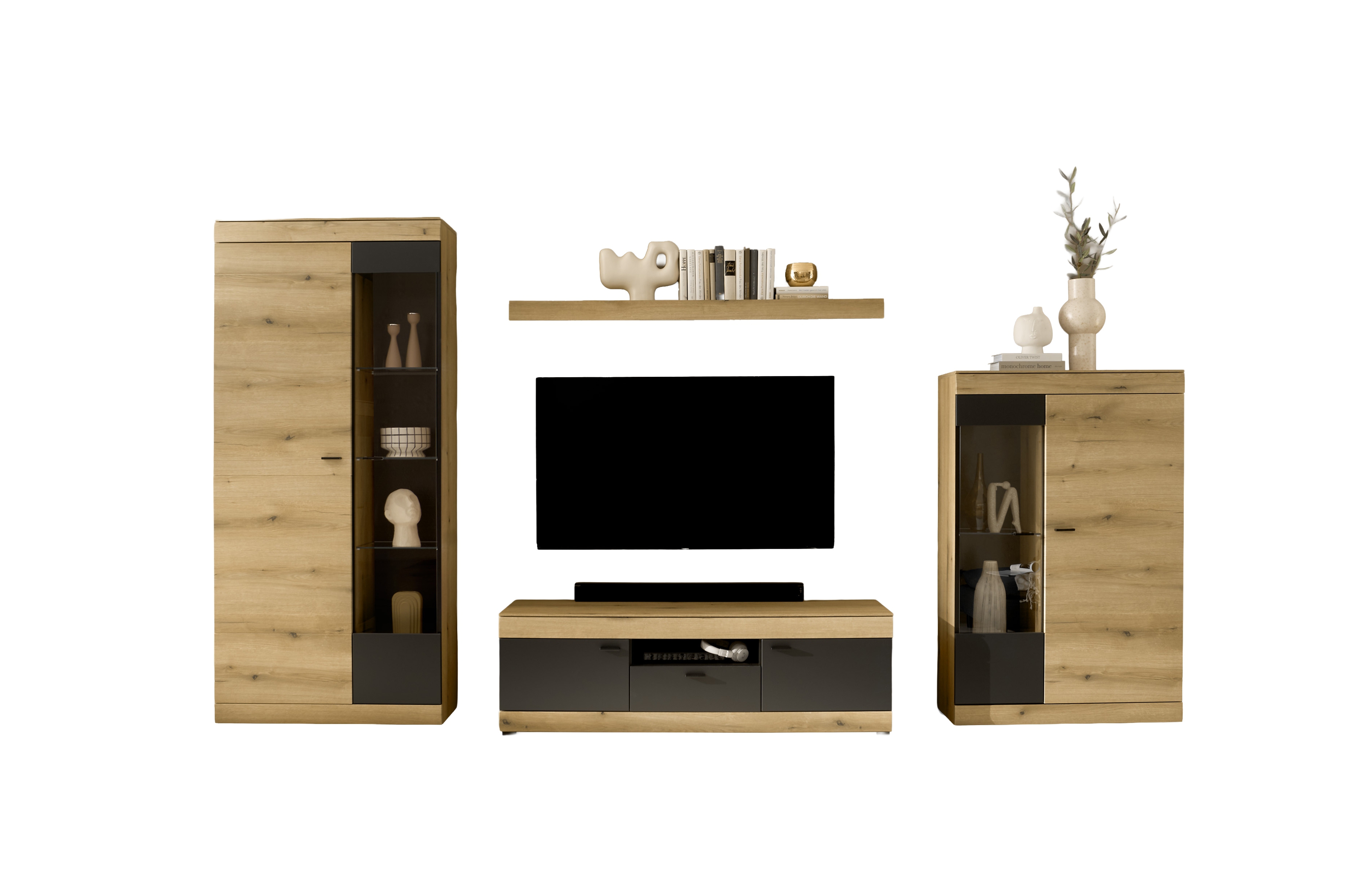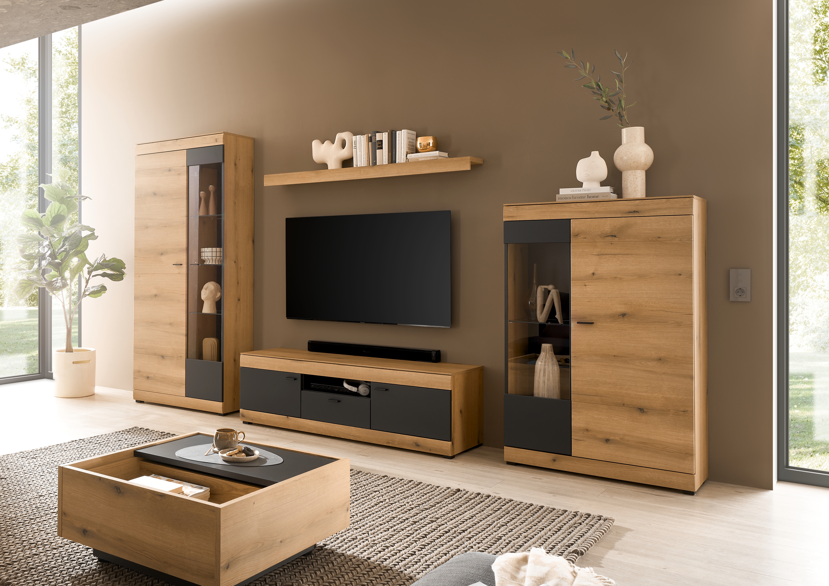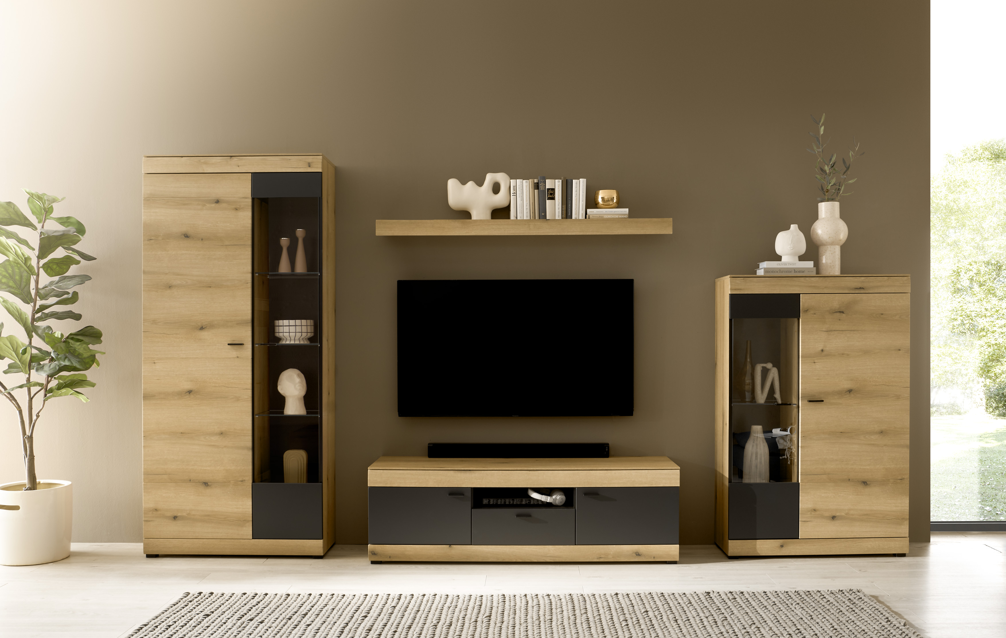Le programme de mobilier allie design moderne, fabrication de haute qualite et fonctionnalite polyvalente. Les facades en MDF Evoke Chene thermoforme creent une apparence naturelle et chaleureuse, sintegrant harmonieusement dans differents concepts damenagement. Le corps et les appliques en imitations bois Evoke Chene, associes a des details gris graphite mats, apportent des accents elegants, tandis que les poignees metalliques noires completent le design. Le meuble offre un rangement bien pense et des possibilites dutilisation flexibles pour le salon, la salle a manger ou le couloir. Lassociation de materiaux durables et dun style intemporel fait de chaque piece un veritable point fort dans la piece.