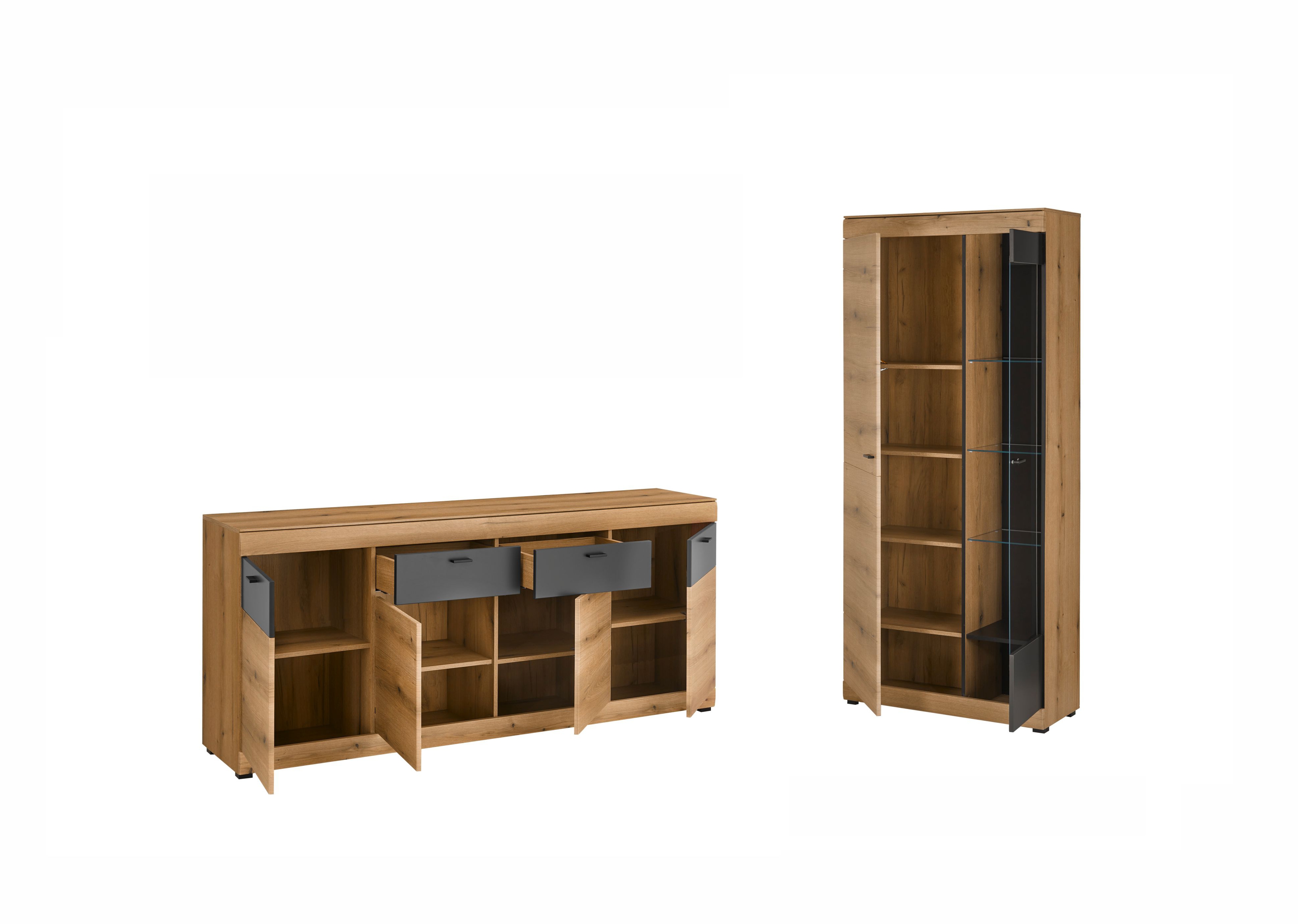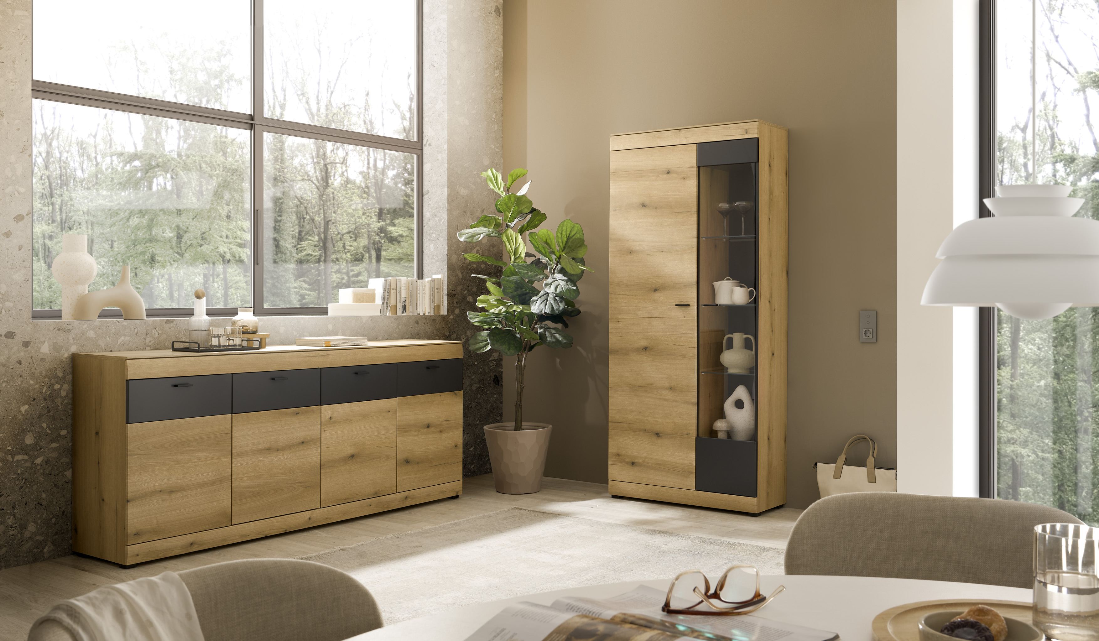 Le programme de mobilier allie design moderne, fabrication de haute qualite et fonctionnalite polyvalente. Les facades en MDF Evoke Chene thermoforme creent une apparence naturelle et chaleureuse, sintegrant harmonieusement dans differents concepts damenagement. Le corps et les appliques en imitations bois Evoke Chene, associes a des details gris graphite mats, apportent des accents elegants, tandis que les poignees metalliques noires completent le design. Le meuble offre un rangement bien pense et des possibilites dutilisation flexibles pour le salon, la salle a manger ou le couloir. Lassociation de materiaux durables et dun style intemporel fait de chaque piece un veritable point fort dans la piece.