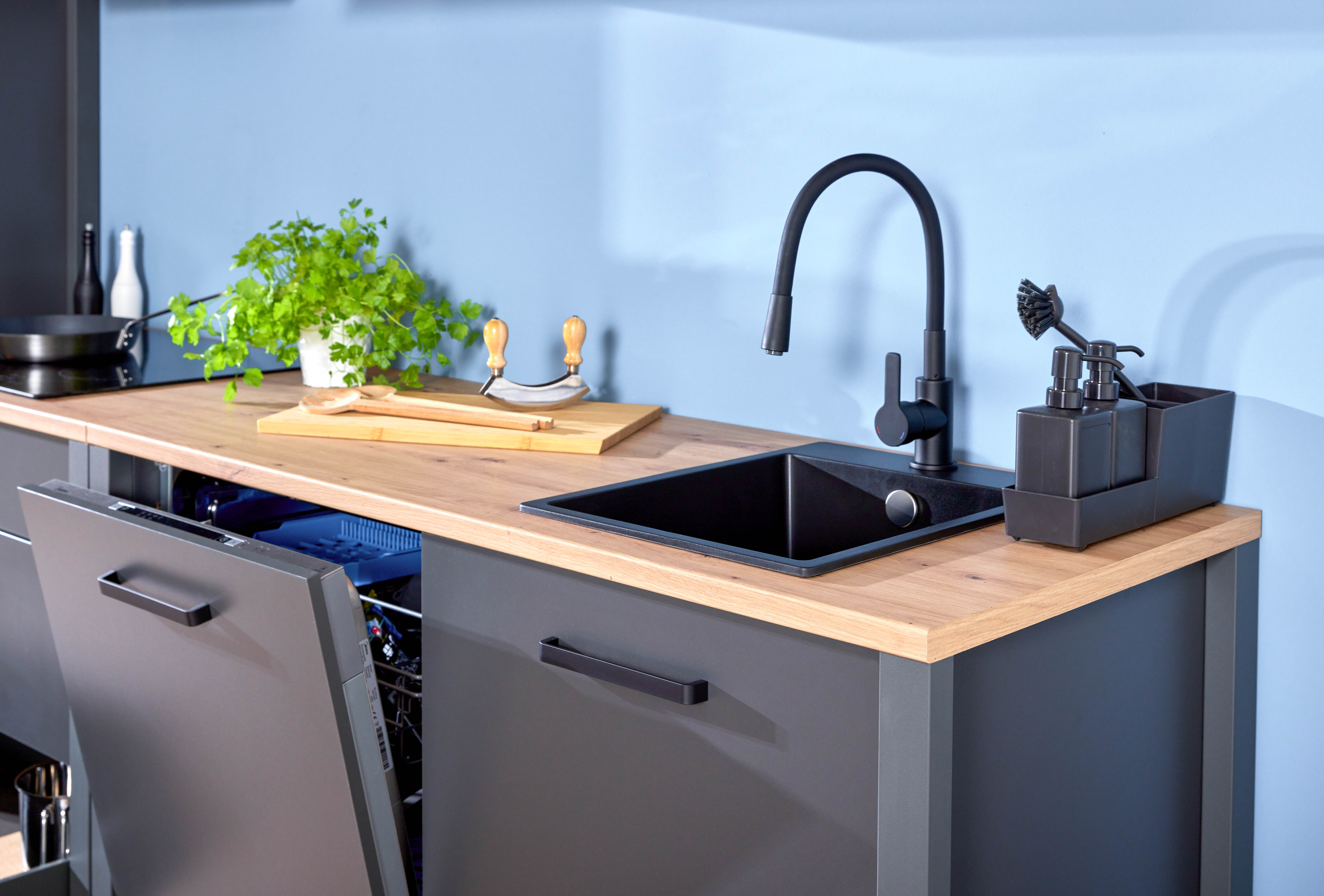 Façade et caisson : panneaux de particules MDF (panneau de fibres de bois de densité moyenne)  ton anthracite