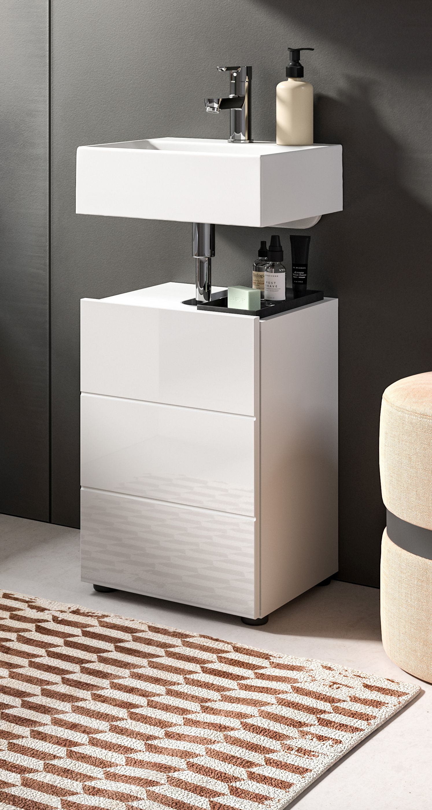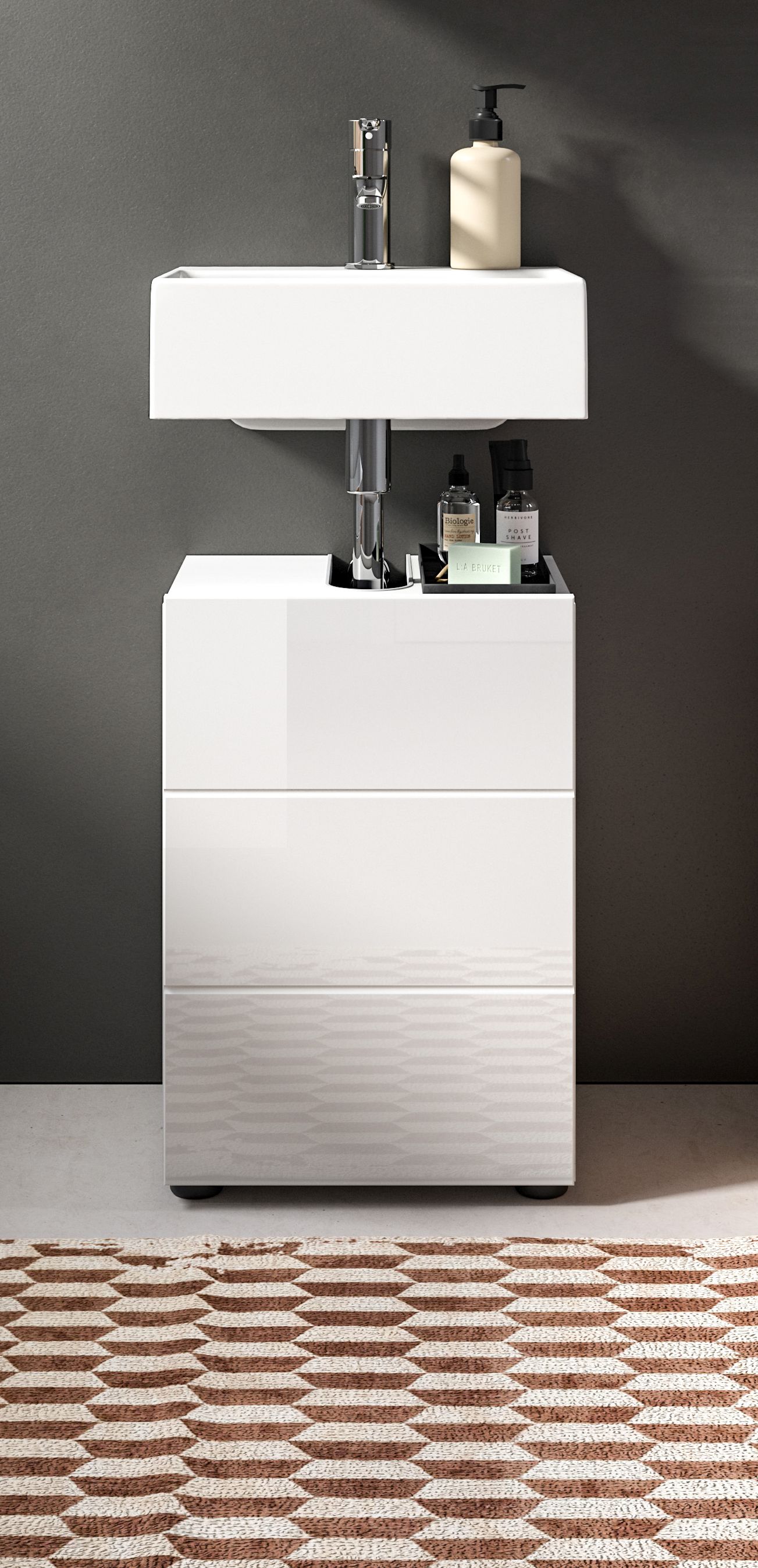 - Utilisation : ce meuble est prévu pour l’utilisation dans une salle de bains, particulièrement sous un lavabo afin de créer un espace de rangement supplémentaire et d’agrémenter joliment la pièce.