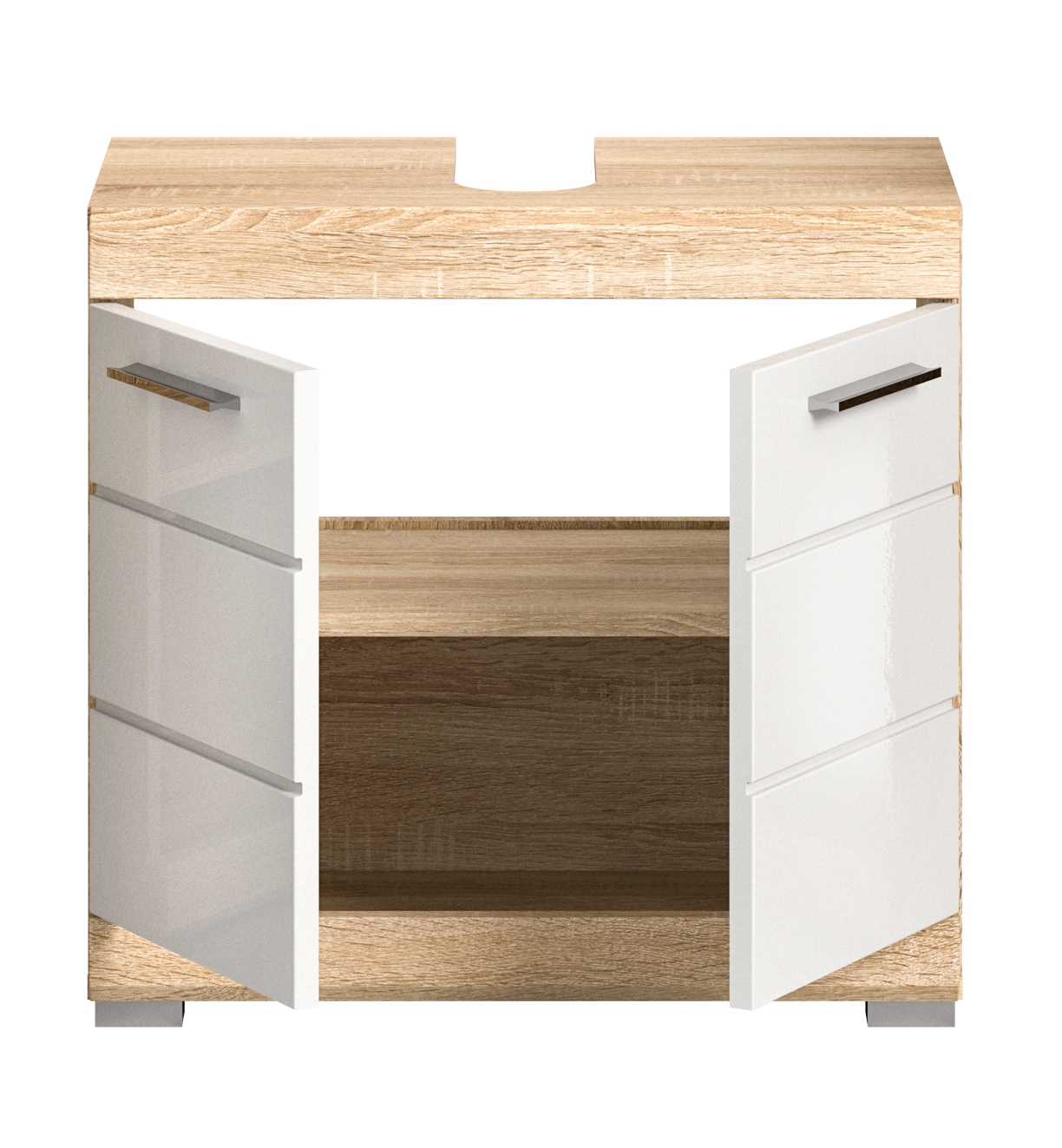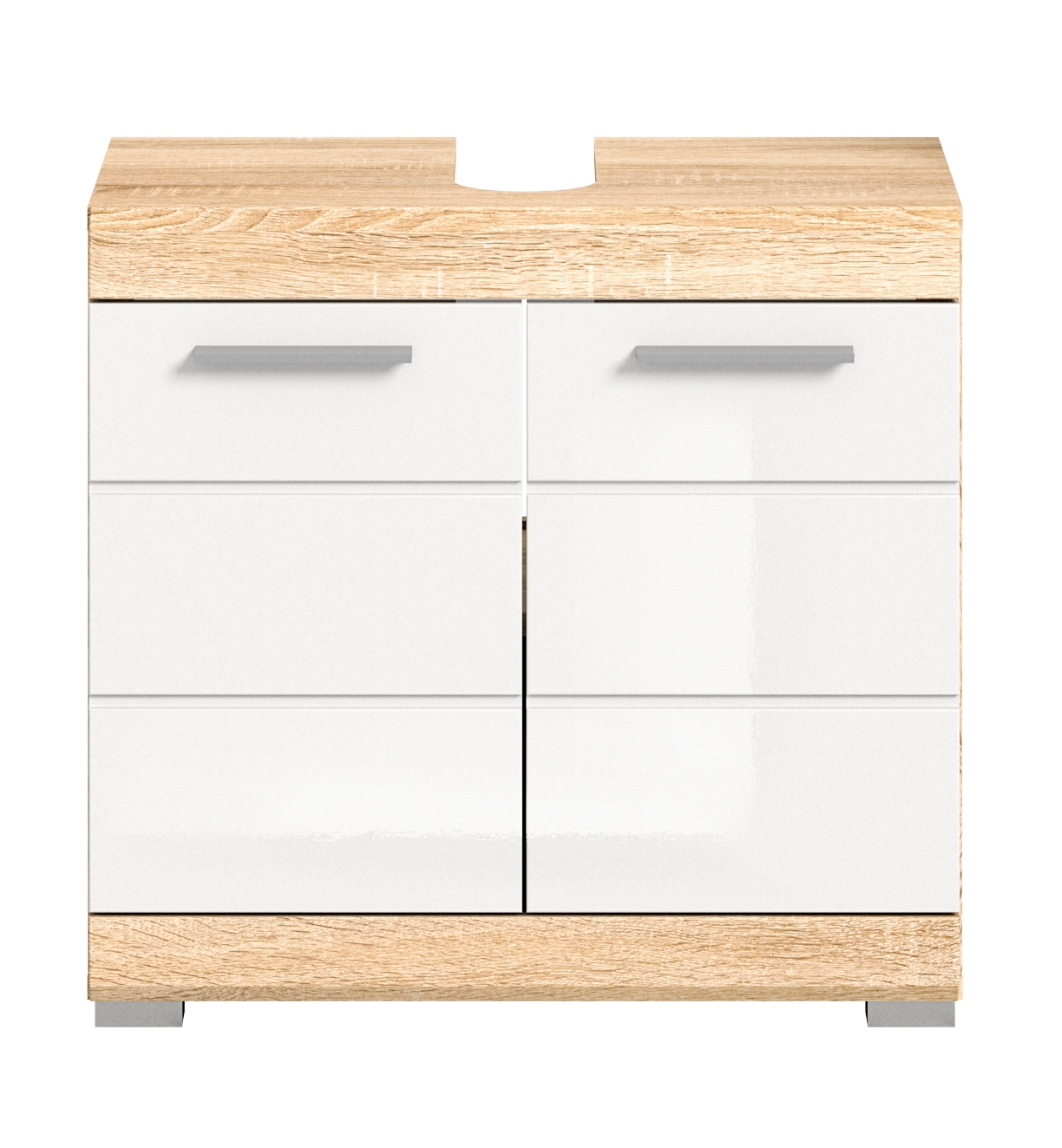 Avec son design attrayant chêne Sonoma clair et façade thermoformée ton blanc ultra brillant, ce meuble sous lavabo séduit à la fois visuellement et par son espace de rangement pratique. Ses dimensions compactes (60x56x34 cm) en font un choix idéal même dans les petites salles de bains.