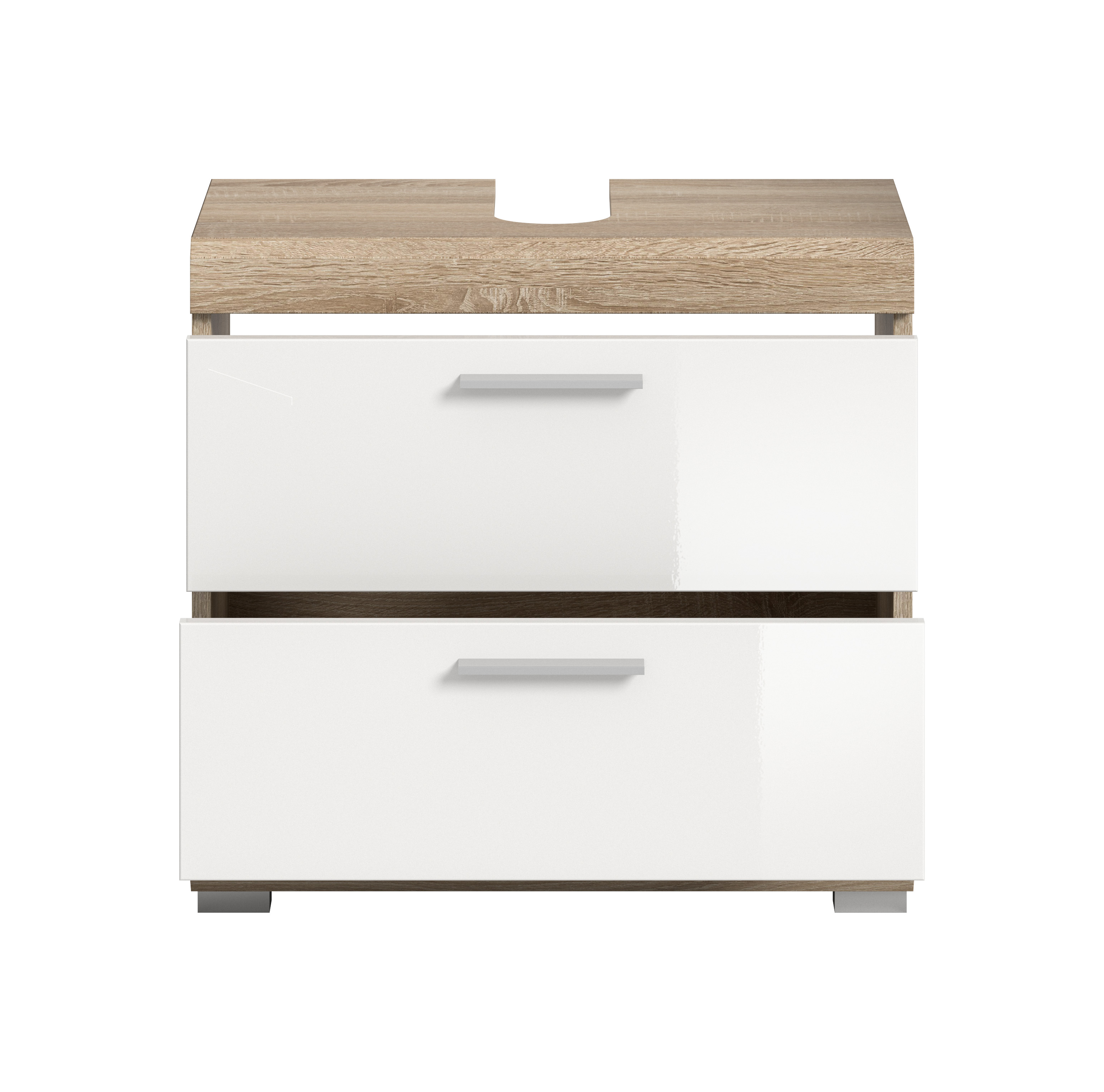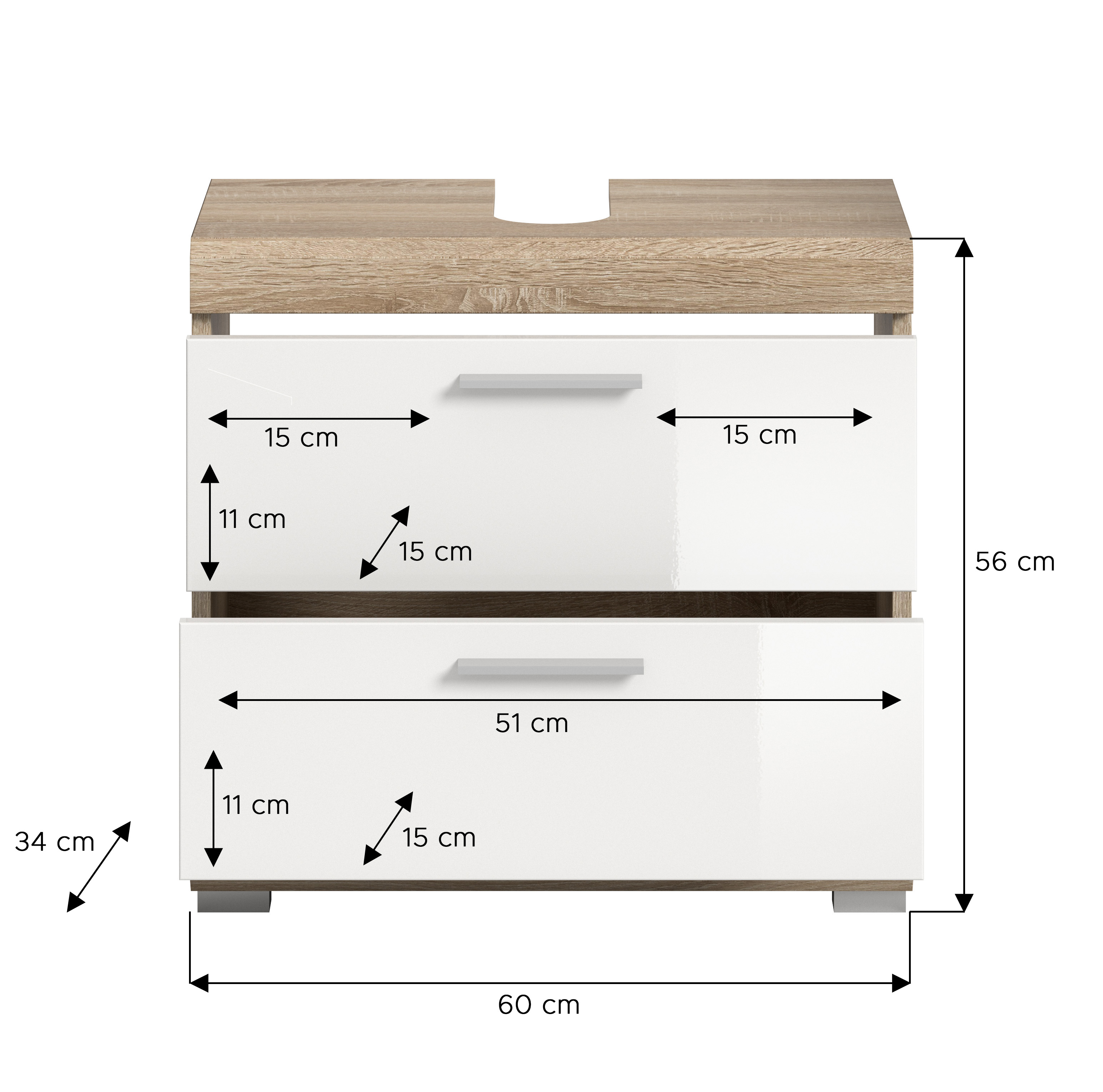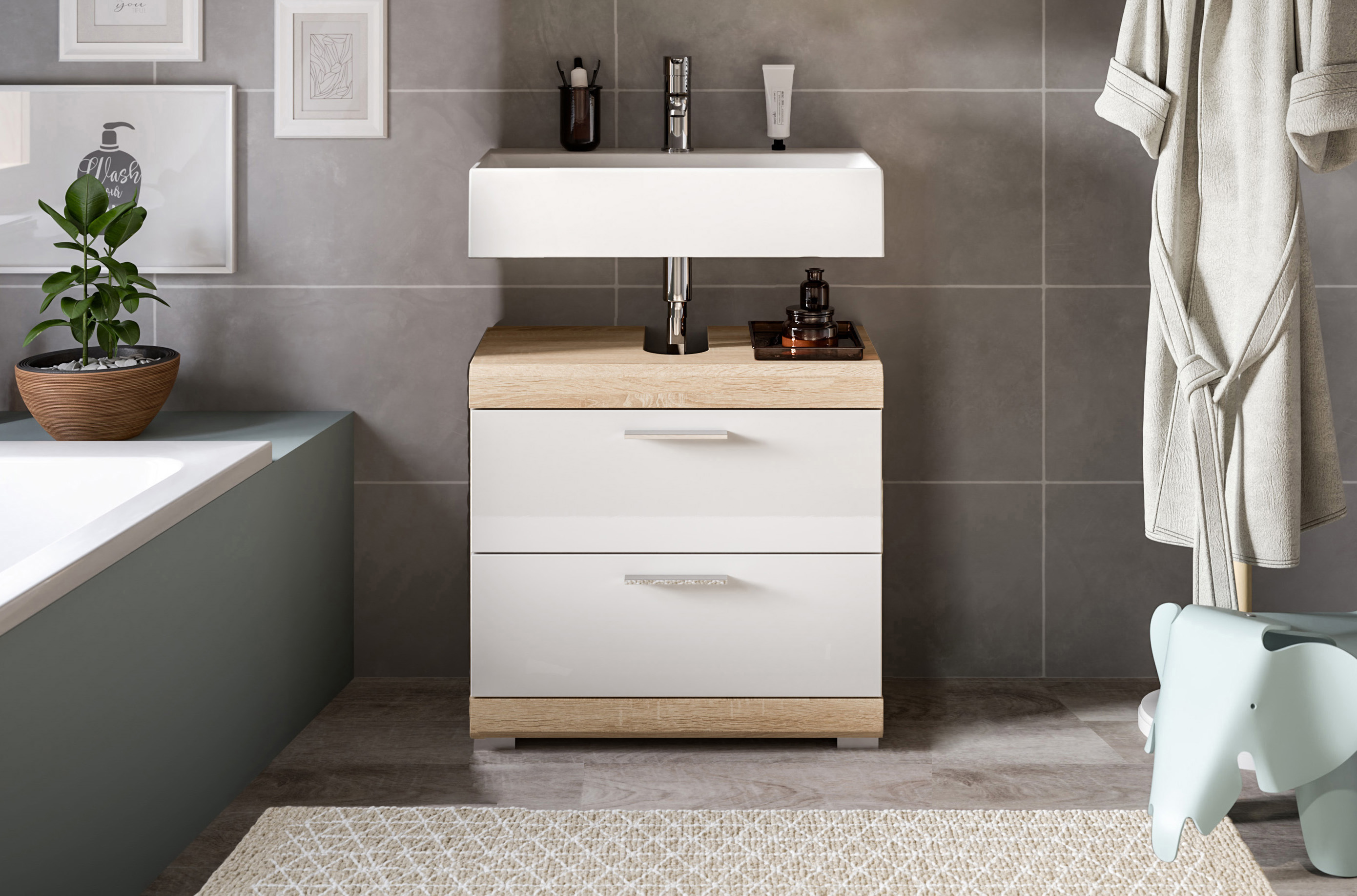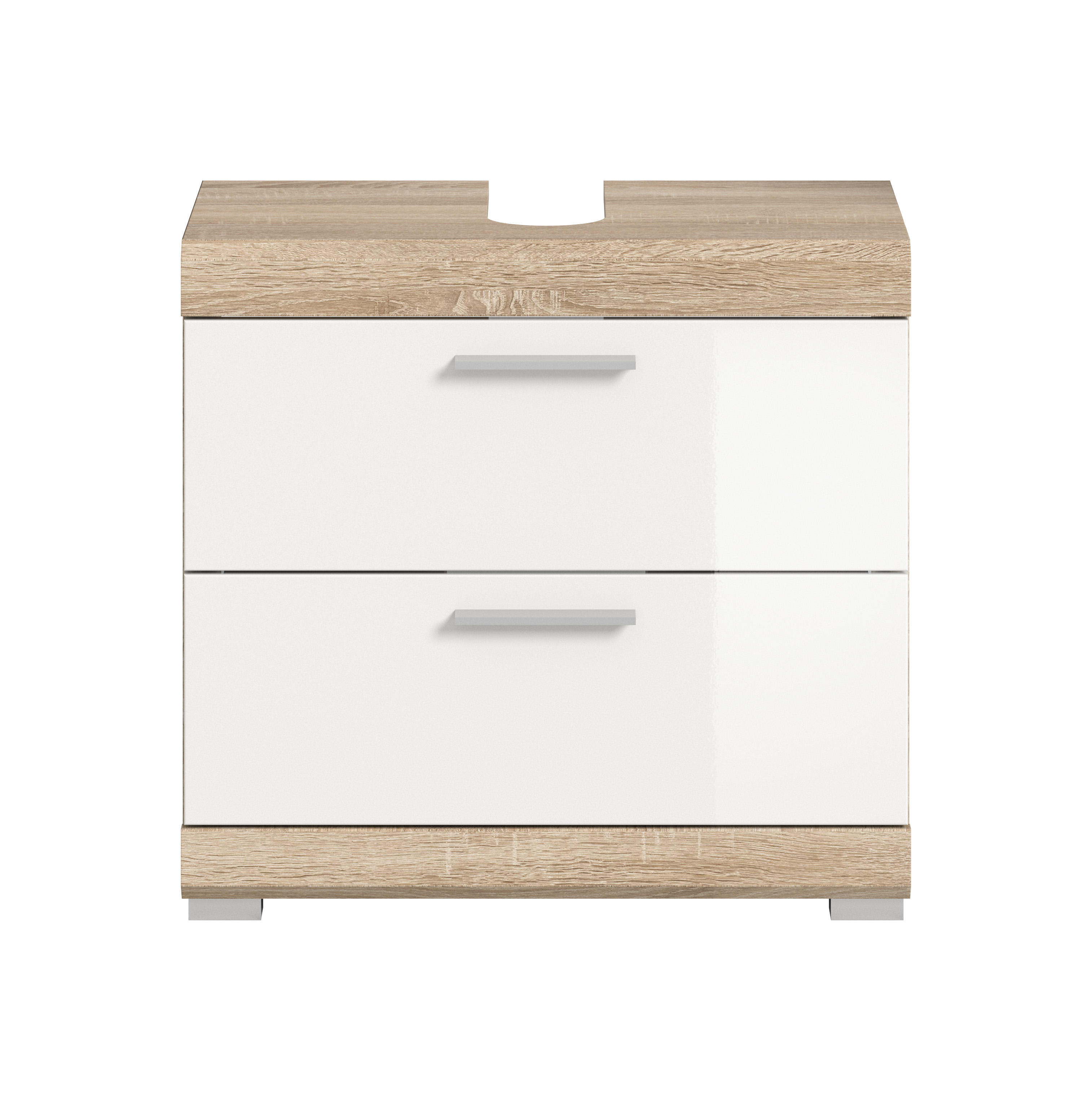 Apportez une touche moderne à votre salle de bains grâce à notre meuble sous lavabo tendance dans un décor chêne Sonoma et façades finition thermoformée ton blanc ultra brillant disponible dans notre collection de meubles contemporains. Avec ses dimensions compactes, ce meuble sous vasque offre un espace de rangement pratique dans un design stylé. Découvrez la combinaison parfaite entre fonctionnalité et look tendance avec ce modèle incontournable.