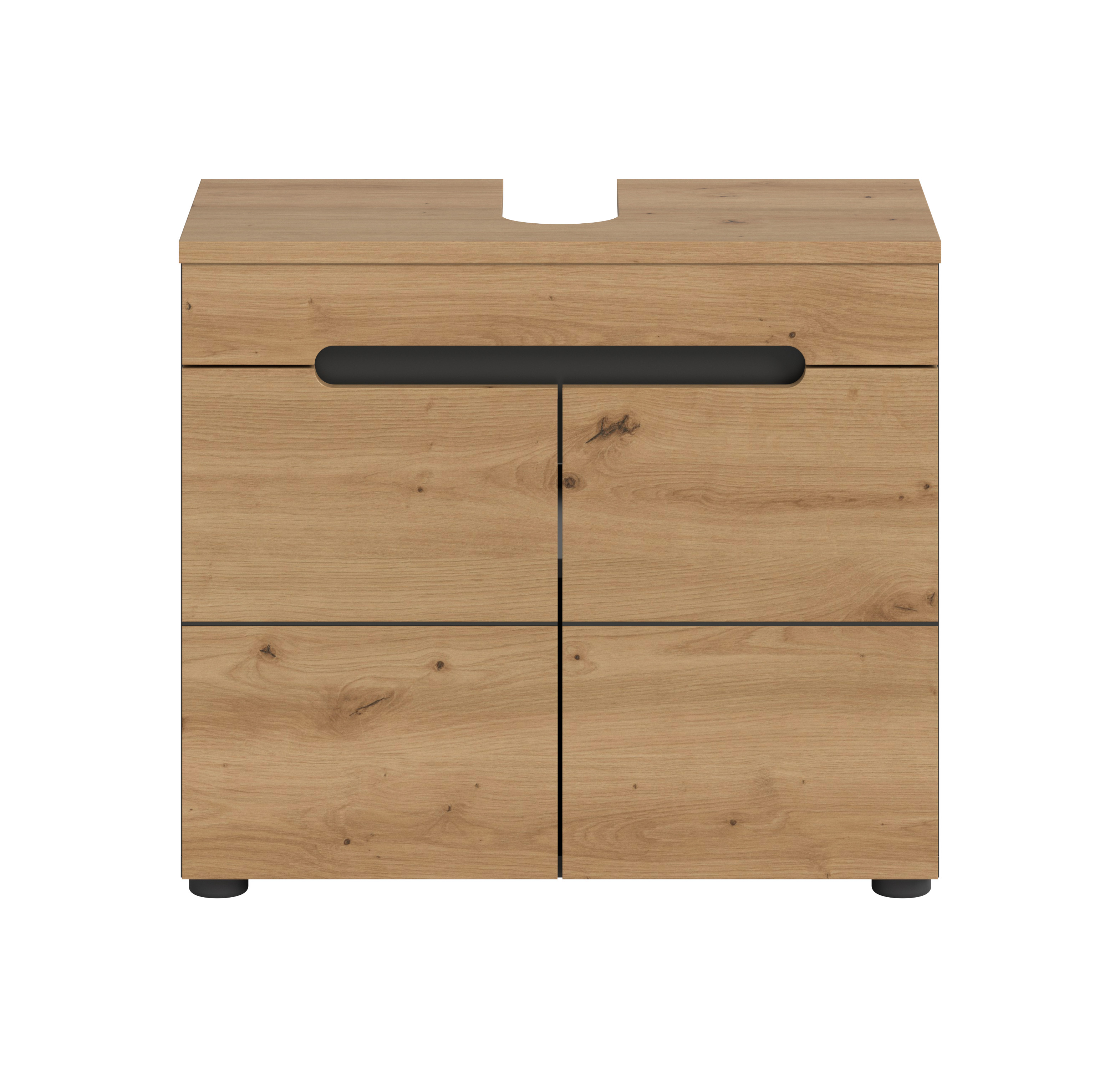 Proposé dans un décor ton gris basalte associé à un décor chêne Artisan aspect bois, il séduit par son veinage naturel et son élégant intérieur noir. Le meuble dispose d’une tablette qui divise l’espace en deux compartiments spacieux, parfaits pour le rangement des serviettes, produits d’entretien ou accessoires de salle de bains.