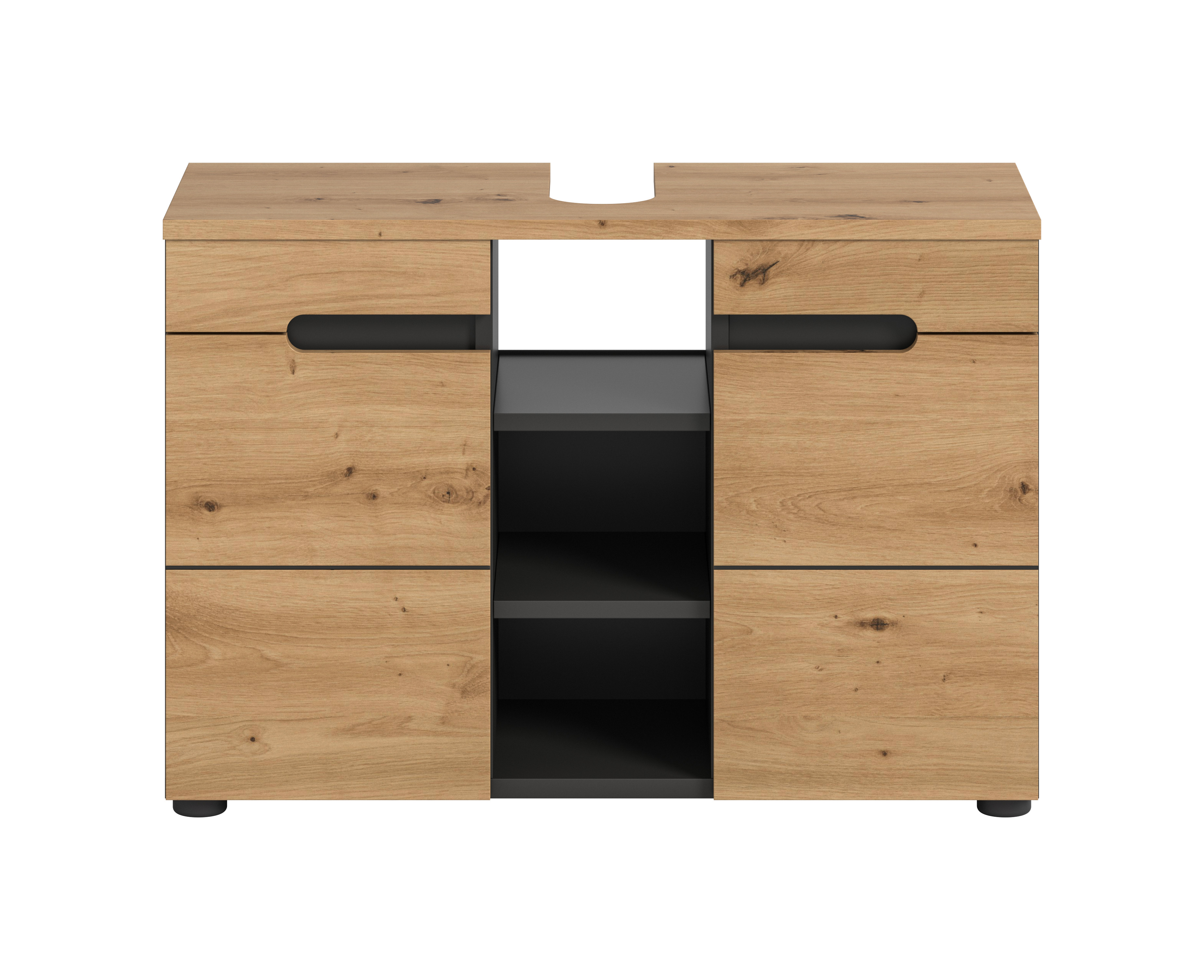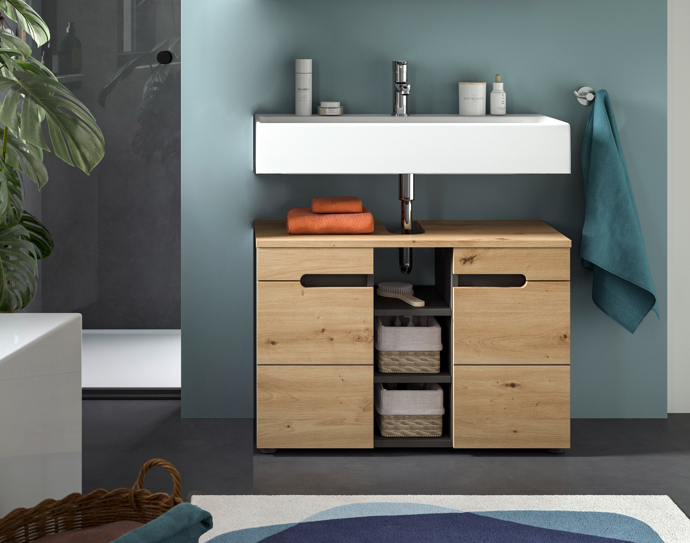 Ce meuble sous lavabo séduit par son élégante combinaison décor ton gris basalte et décor chêne Artisan aspect bois. Avec son design moderne et intemporel, il s’intègre harmonieusement dans toutes les salles de bains.