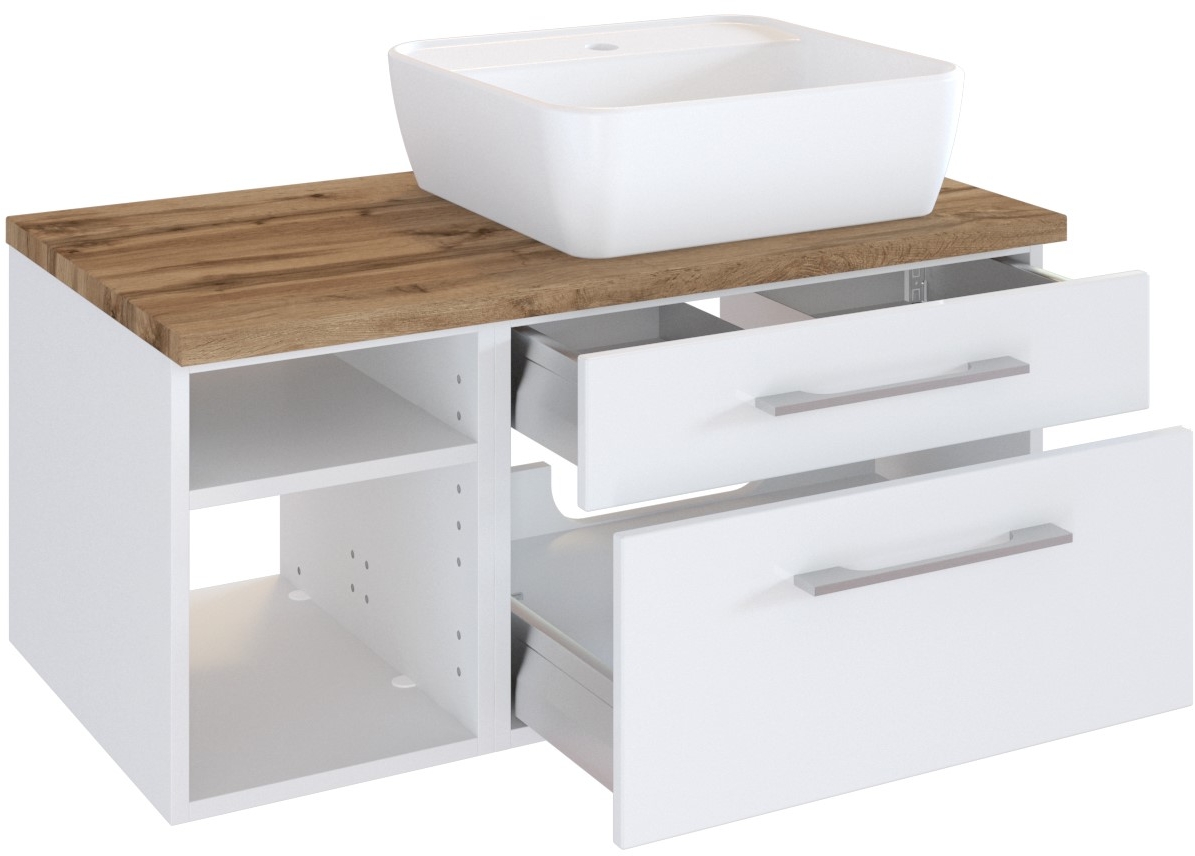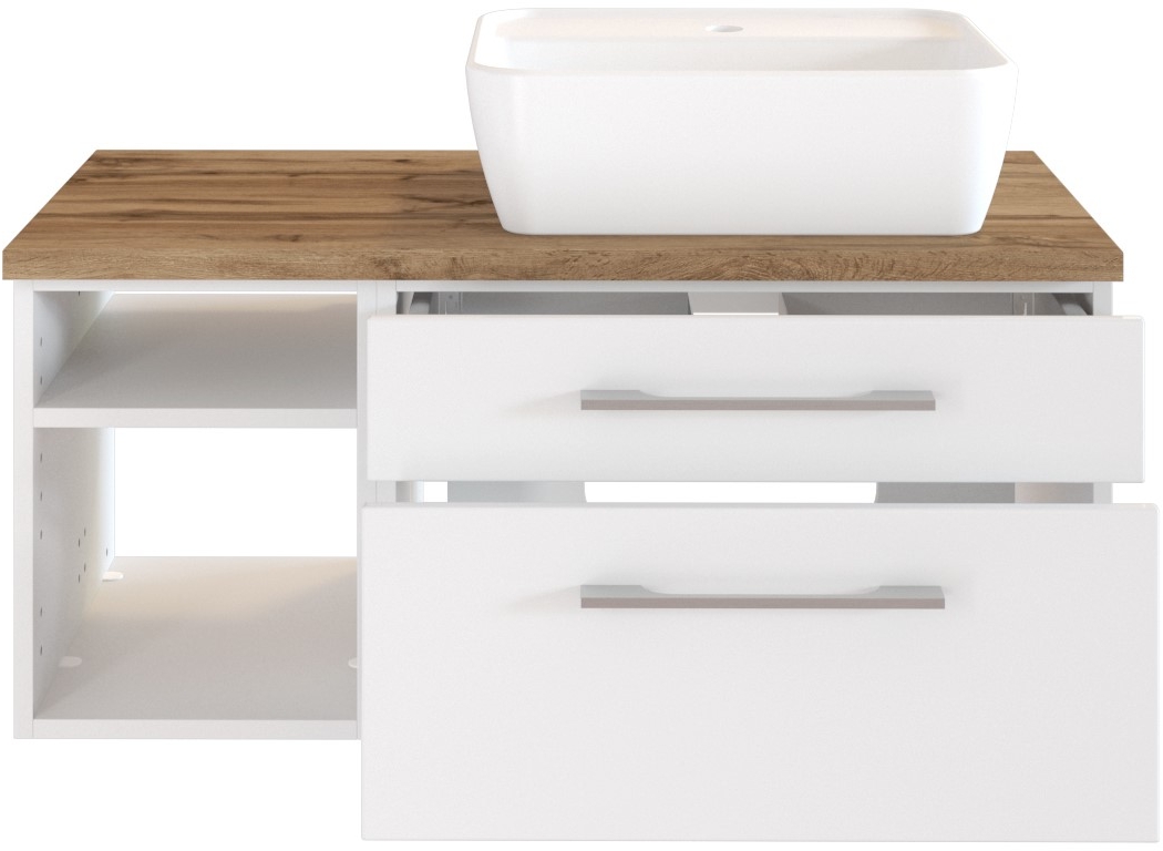 1 meuble sous vasque avec 1 tiroir bas et 1 tiroir haut avec fermeture amortie et 2 casiers ouverts, incl. découpe siphon