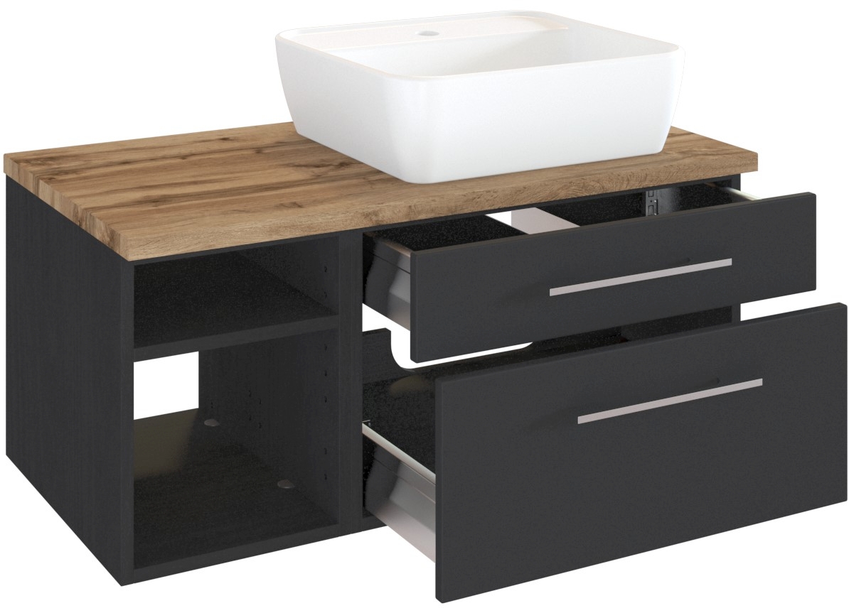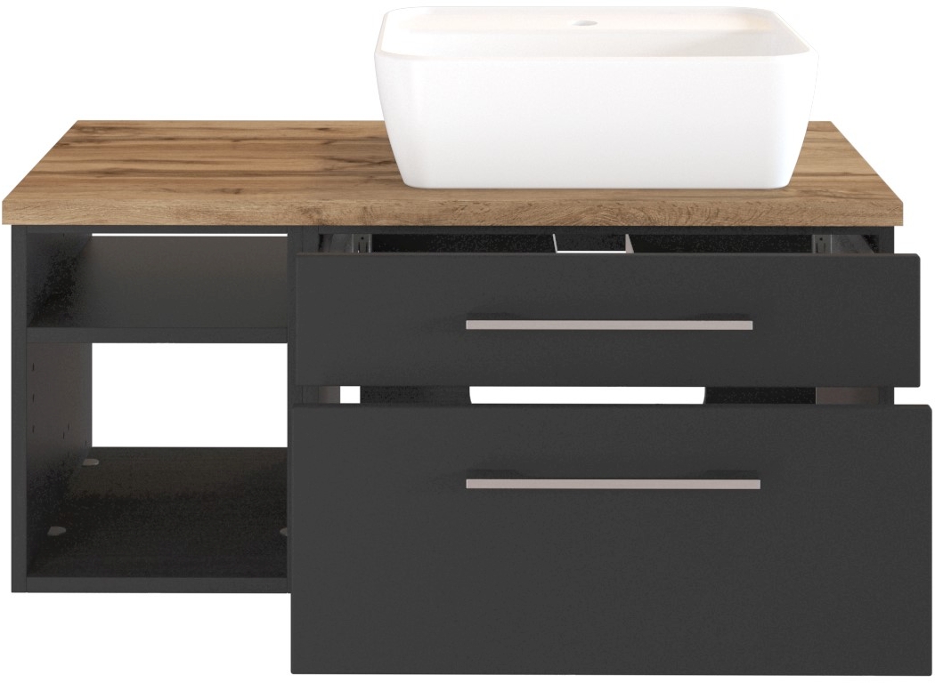 1 meuble sous vasque avec 1 tiroir bas et 1 tiroir haut avec fermeture amortie et 2 casiers ouverts, incl. découpe siphon