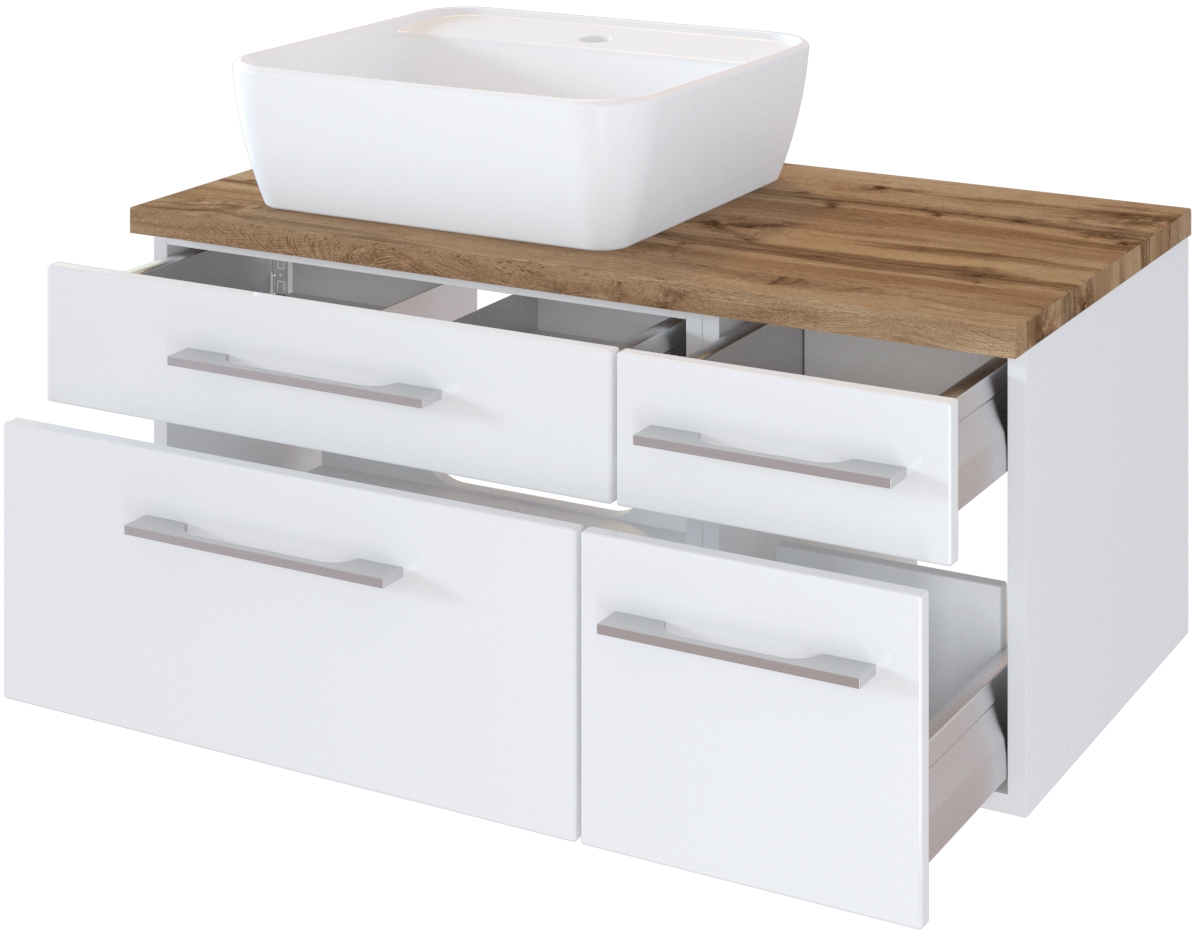 1 meuble sous vasque avec 2 tiroirs bas et 2 tiroirs hauts avec fermeture amortie, incl. découpe siphon